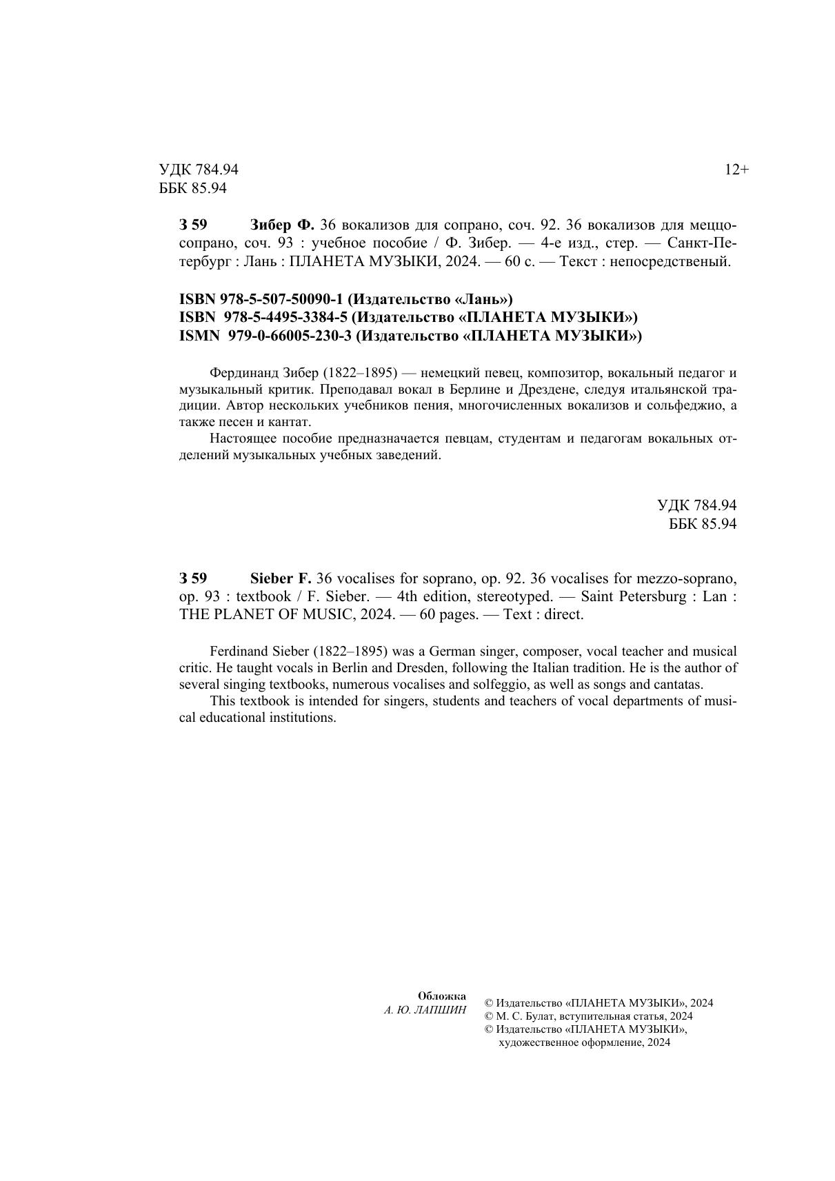 Фердинанд Зибер (1822 – 1895) – немецкий певец, композитор, вокальный педагог и музыкальный критик. Преподавал вокал в Берлине и Дрездене, следуя итальянской традиции. Автор нескольких учебников пения, многочисленных вокализов и сольфеджио, а также песен и кантат. Настоящее пособие предназначается певцам, студентам и педагогам вокальных отделений музыкальных учебных заведений.
