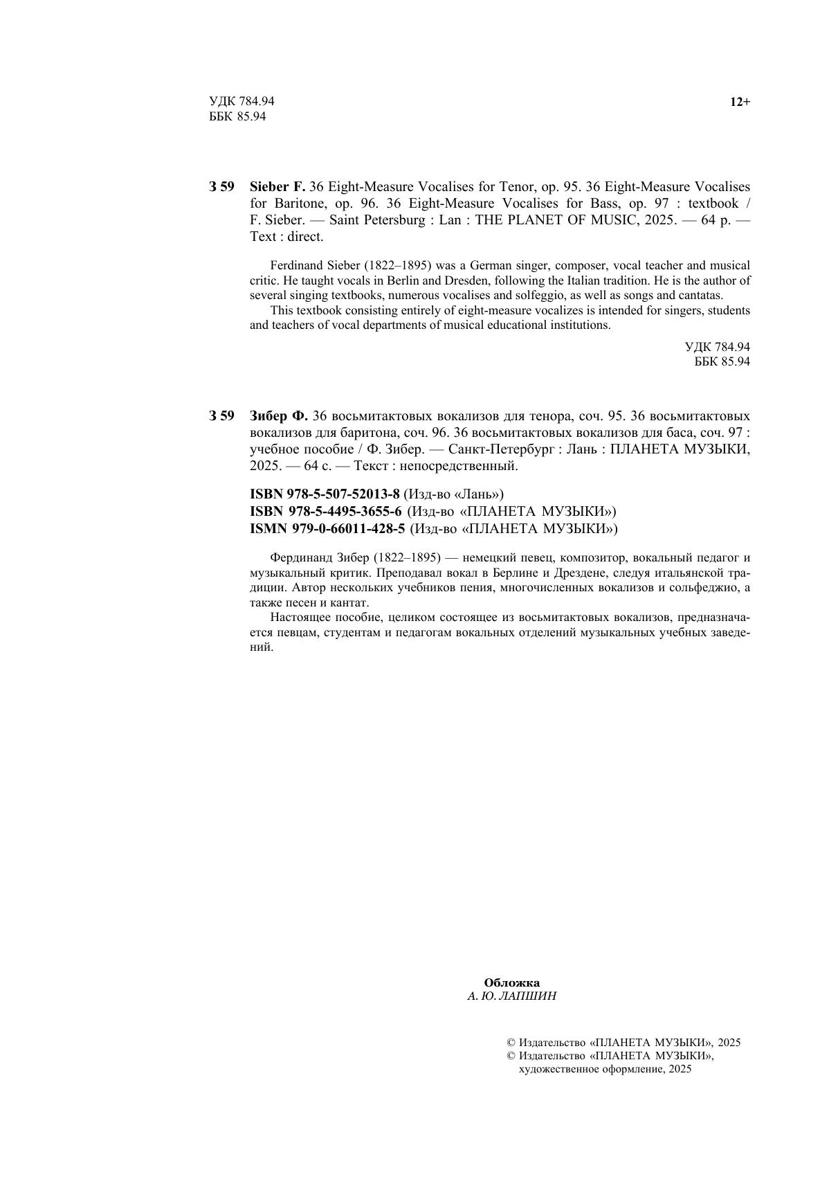 Фердинанд Зибер (1822–1895) — немецкий певец, композитор, вокальный педагог и музыкальный критик. Преподавал вокал в Берлине и Дрездене, следуя итальянской традиции. Автор нескольких учебников пения, многочисленных вокализов и сольфеджио, а также песен и кантат. Настоящее пособие, целиком состоящее из восьмитактовых вокализов, предназначается певцам, студентам и педагогам вокальных отделений музыкальных учебных заведений. Ferdinand Sieber (1822–1895) was a German singer, composer, vocal teacher and musical critic. He taught vocals in Berlin and Dresden, following the Italian tradition. He is the author of several singing textbooks, numerous vocalises and solfeggio, as well as songs and cantatas. This textbook consisting entirely of eight-measure vocalizes is intended for singers, students and teachers of vocal departments of musical educational institutions.