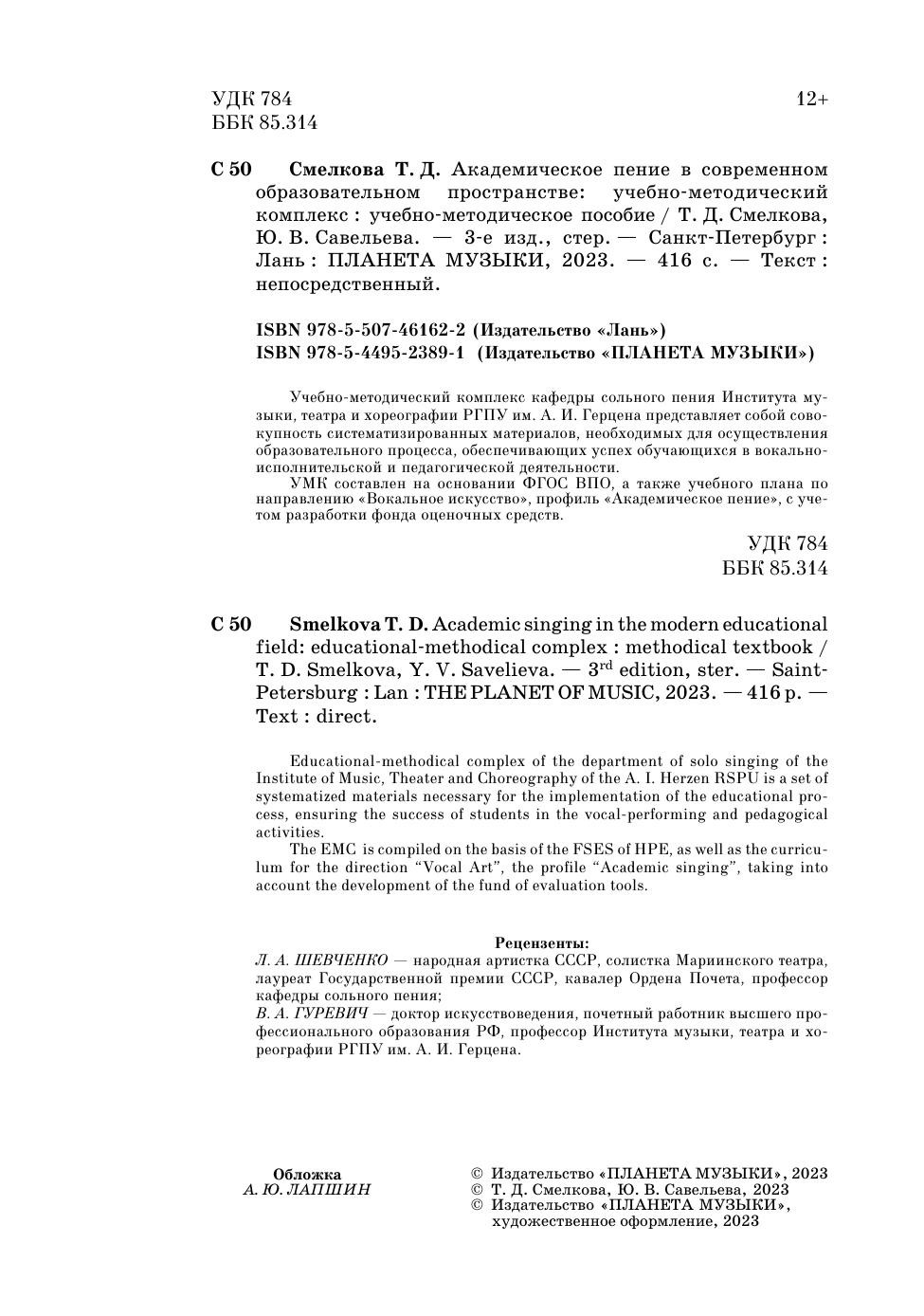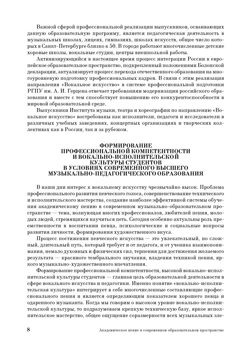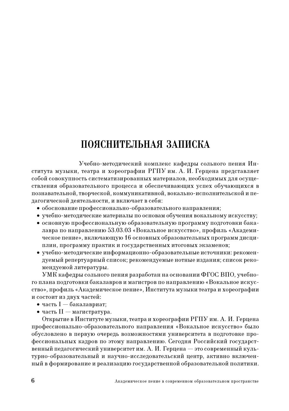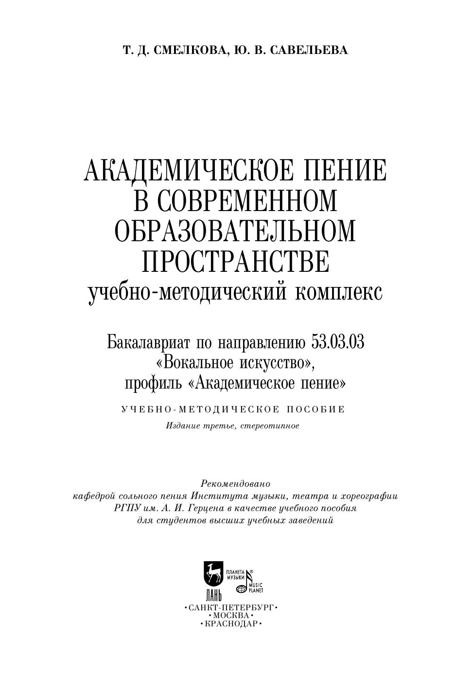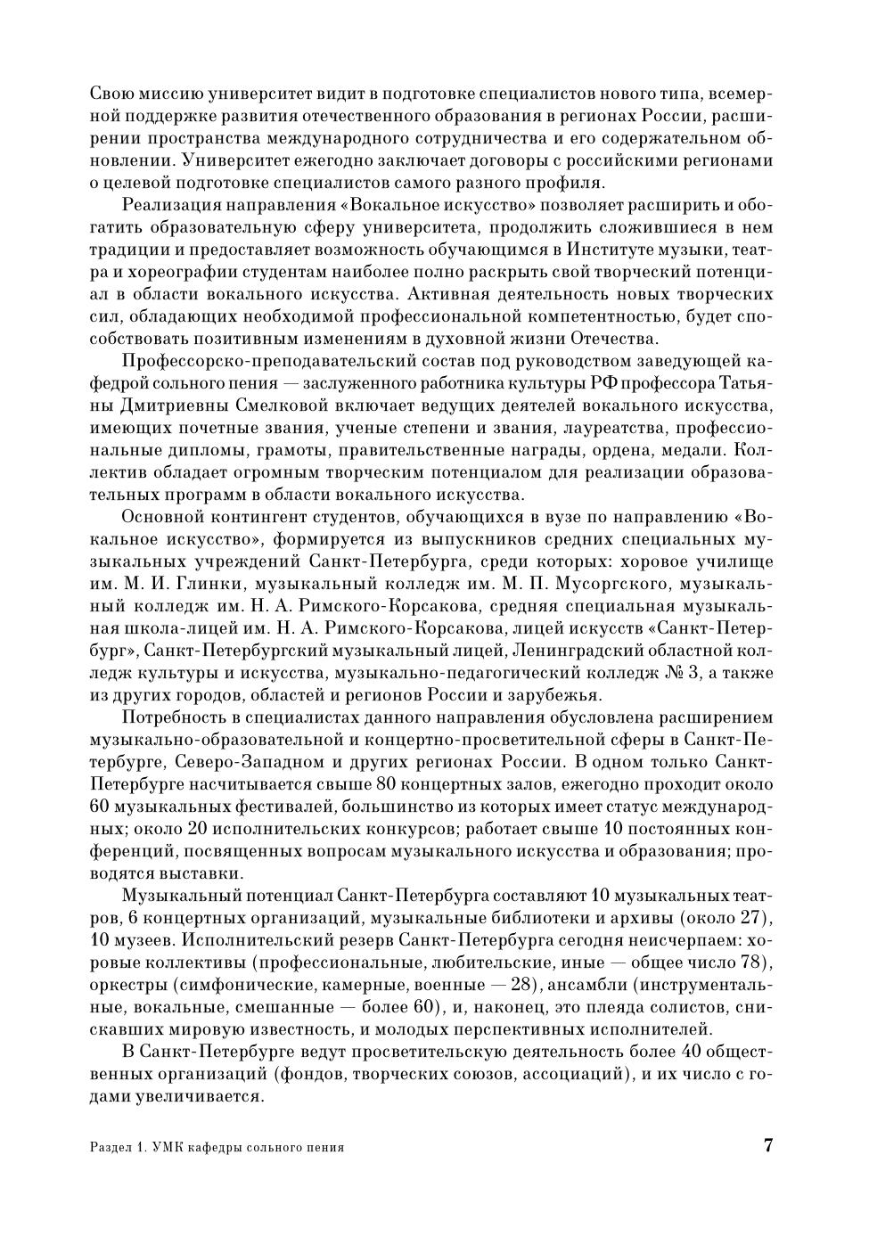 Educational-methodical complex of the department of solo singing of the Institute of Music, Theater and Choreography of the A.I.Herzen RSPU is a set of systematized materials necessary for the implementation of the educational process, ensuring the success of students in the vocal-performing and pedagogical activities. The EMC is compiled on the basis of the FSES of HPE, as well as the curriculum for the direction "Vocal Art", the profile "Academic singing", taking into account the development of the fund of evaluation tools.