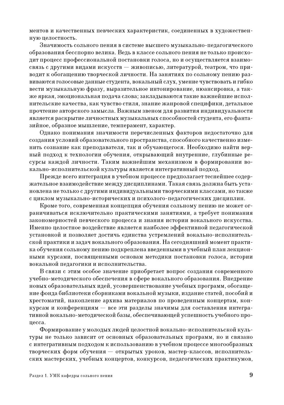 Учебно-методический комплекс кафедры сольного пения Института музыки, театра и хореографии РГПУ им. А.И. Герцена представляет собой совокупность систематизированных материалов, необходимых для осуществления образовательного процесса, обеспечивающих успех обучающихся в вокально-исполнительской и педагогической деятельности. УМК составлен на основании ФГОС ВПО, а также учебного плана по направлению «Вокальное искусство», профиль «Академическое пение» с учетом разработки фонда оценочных средств.
