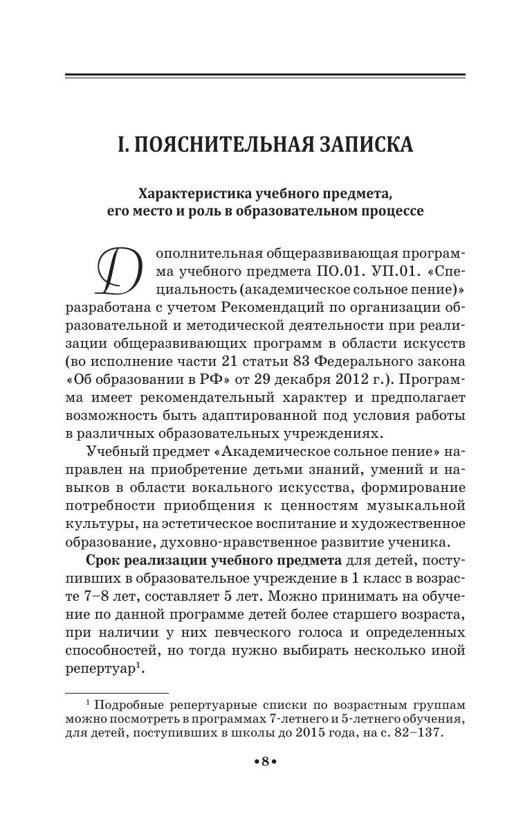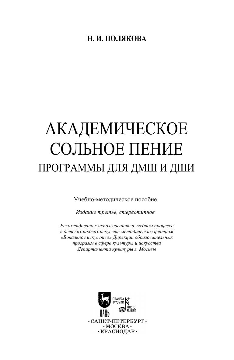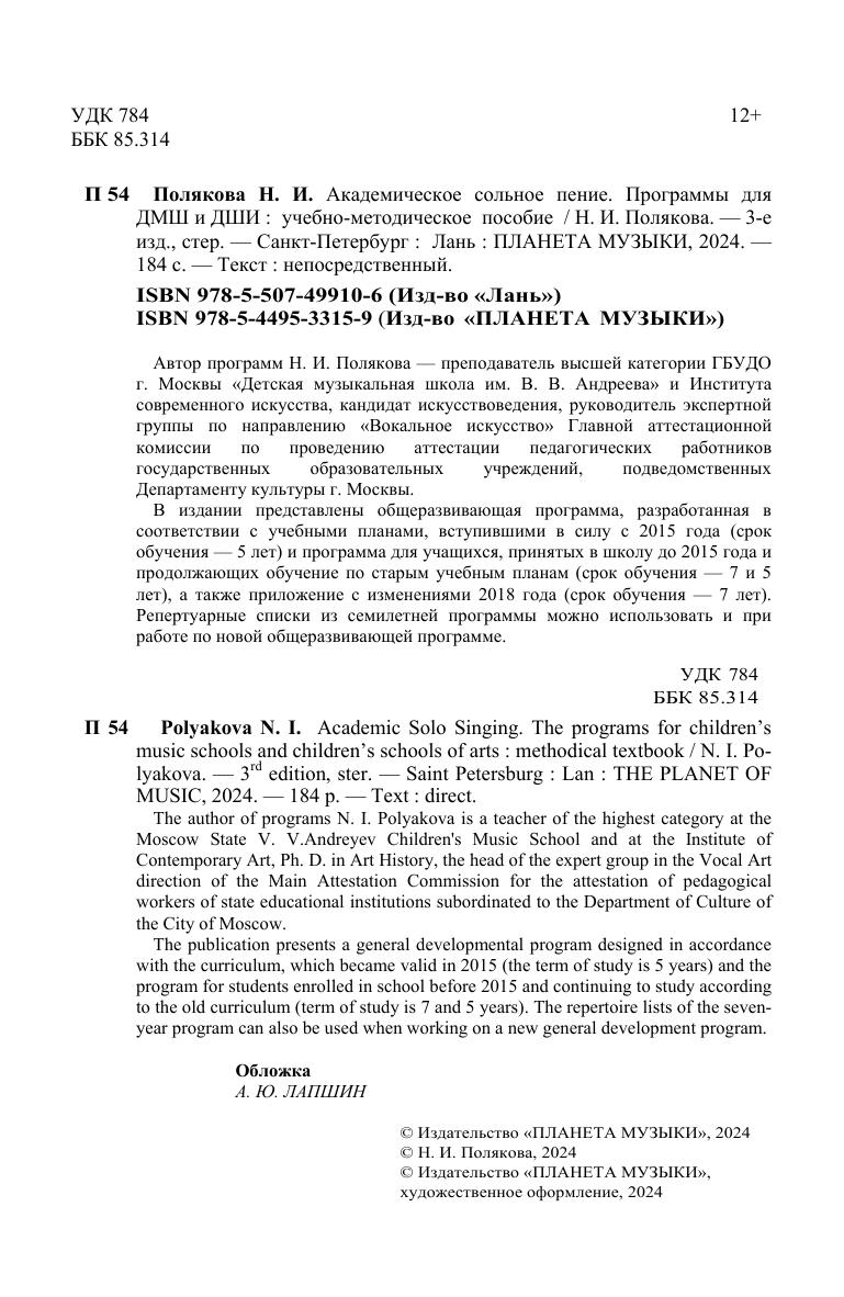 Автор программ, Н.И. Полякова – преподаватель высшей категории ГБУДО г. Москвы Детская музыкальная школа им. В. В. Андреева и Института современного искусства, кандидат искусствоведения, руководитель экспертной группы по направлению «Вокальное искусство» Главной аттестационной комиссии по проведению аттестации педагогических работников государственных образовательных учреждений, подведомственных Департаменту культуры города Москвы. В издании представлены общеразвивающая программа, разработанная в соответствии с учебными планами, вступившими в силу с 2015 года, срок обучения – 5 лет и программа для учащихся, принятых в школу до 2015 года и продолжающих обучение по старым учебным планам, срок обучения – 7 и 5 лет. Репертуарные списки из семилетней программы можно использовать и при работе по новой общеразвивающей программе.