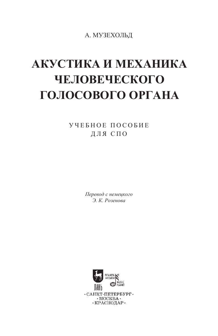 Альберт Музехольд — немецкий ученый, автор работ по вопросам голосообразования. Данная книга (1898) была переведена и впервые издана в России в 1925 г. Представляет собой работу по акустике и физиологии голосового аппарата, в которой в сжатой и доступной форме изложена история научных изысканий в этой области. Автор подводит научно-экспериментальный фундамент под вокальное исполни¬тельство. Соответствует современным требованиям Федерального государ-ственного образовательного стандарта среднего профессионального образования и профессиональным квали¬фикационным требованиям. Данное пособие адресовано педагогам вокала и студентам музы-кальных училищ и колледжей. Albert Musehold was a German scientist, the author of works on voice formation. The current book (Allgemeine Akustik und Mechanik des menschlichen Stimmorgans, 1898) was translated and first published in Russia in 1925. It represents a study on the acoustics and physiology of the vocal apparatus, presenting the history of scientific research in this are¬a in a concise and clear form. The author provides a scientific and experimental foundation for vocal performance. Corresponds to the modern requirements of the Federal State Educational Standard of Secondary Vocational Education and professional quali¬fication requirements. This textbook is addressed to vocal teachers and students of colleges.