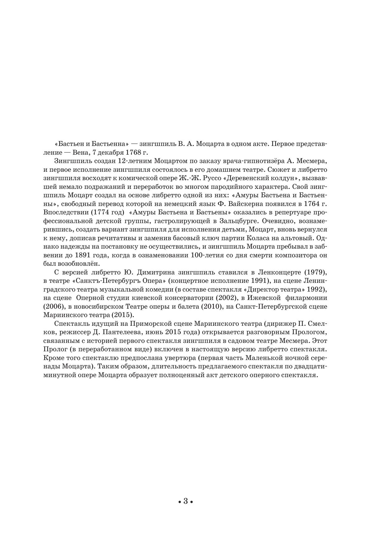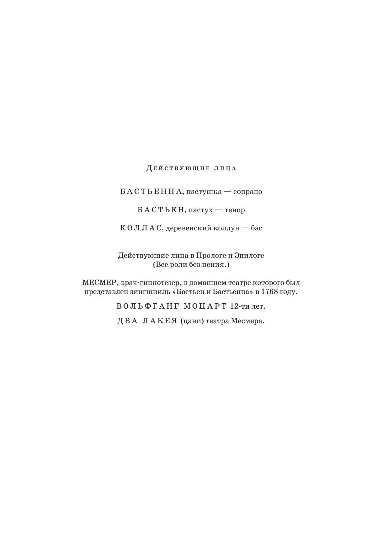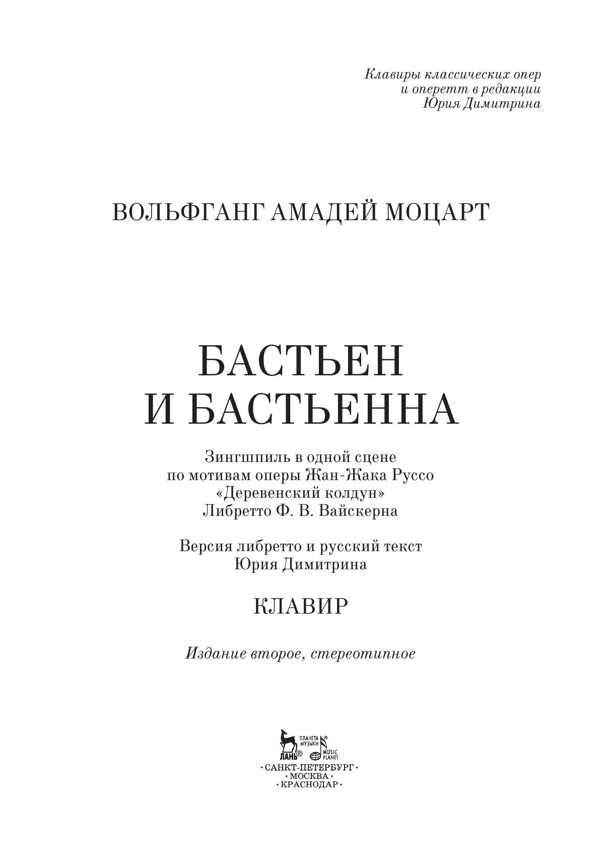 «Бастьен и Бастьенна» (нем. “Bastien und Bastienne”) – зингшпиль В.А.Моцарта в одном акте по мотивам оперы Жан-Жака Руссо «Деревенский колдун». Первое представление – Вена, домашний театр Месмера, 7 декабря 1768 г.