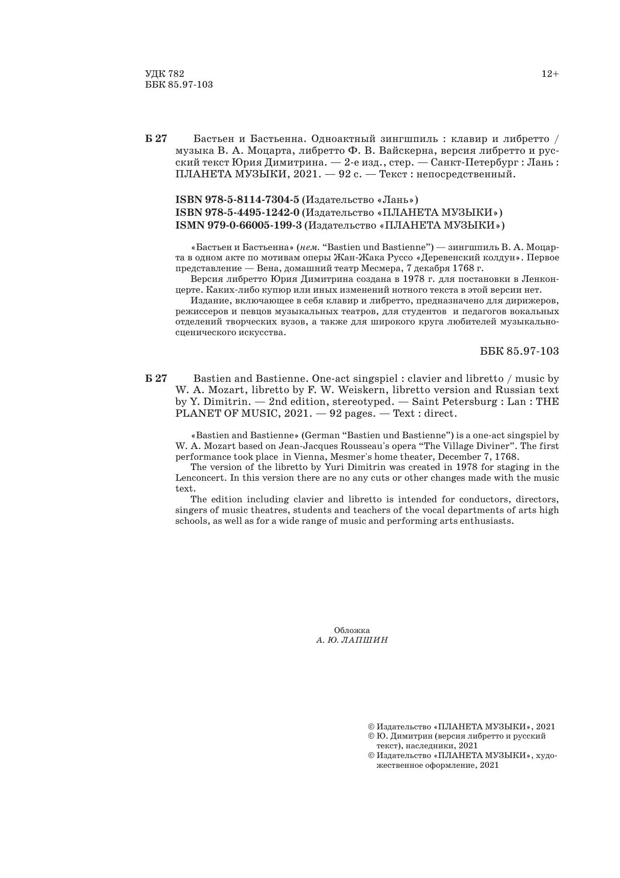 Издание, включающее в себя клавир и либретто, предназначено для дирижеров, режиссеров и певцов музыкальных театров, для студентов и педагогов вокальных отделений творческих вузов, а также для широкого круга любителей музыкально-сценического искусства.