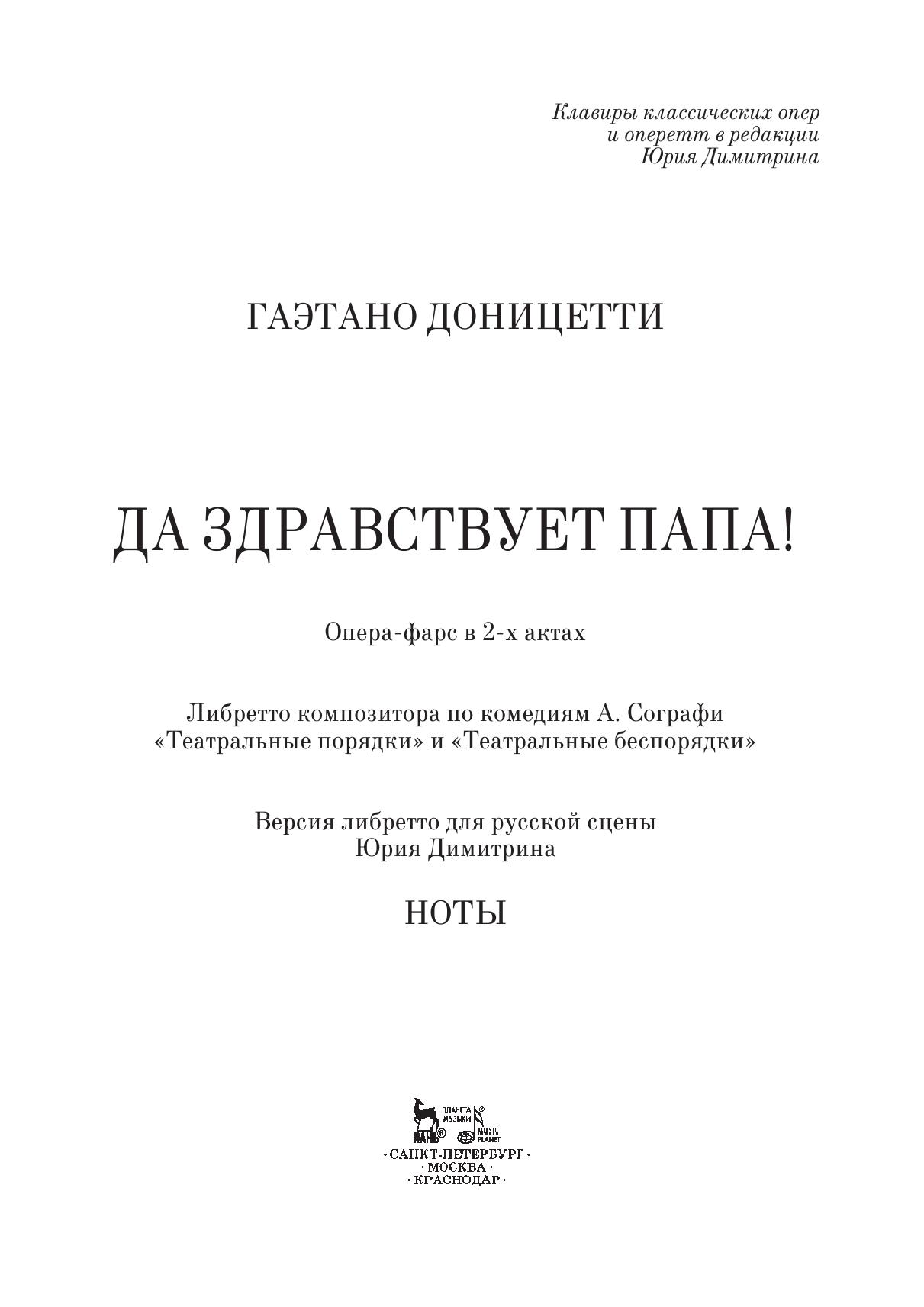 В новой версии либретто действие оперы-фарса Г. Доницетти «Да здравствует папа!» передвинуто в 1913 год и перенесено в Россию на сцену городского театра Костромы, где некая русская антреприза ставит (на итальянском языке) оперу Доницетти. Главное действующее лицо не Мама (поющая басом, как в оригинале) а Папа (бас), изображающий маму, и лицедействующий ради оперной карьеры своей дочери. Автор новой версии (не перевода) оперы Доницетти намеренно насыщает детали сюжета, совмещённого с итальянской музыкой и речитативами «секко», русской атмосферой того времени.