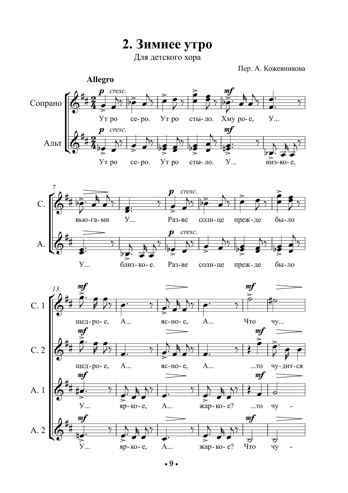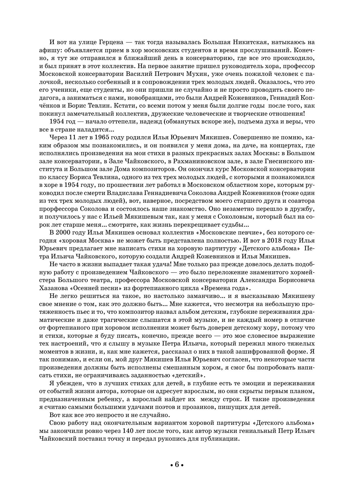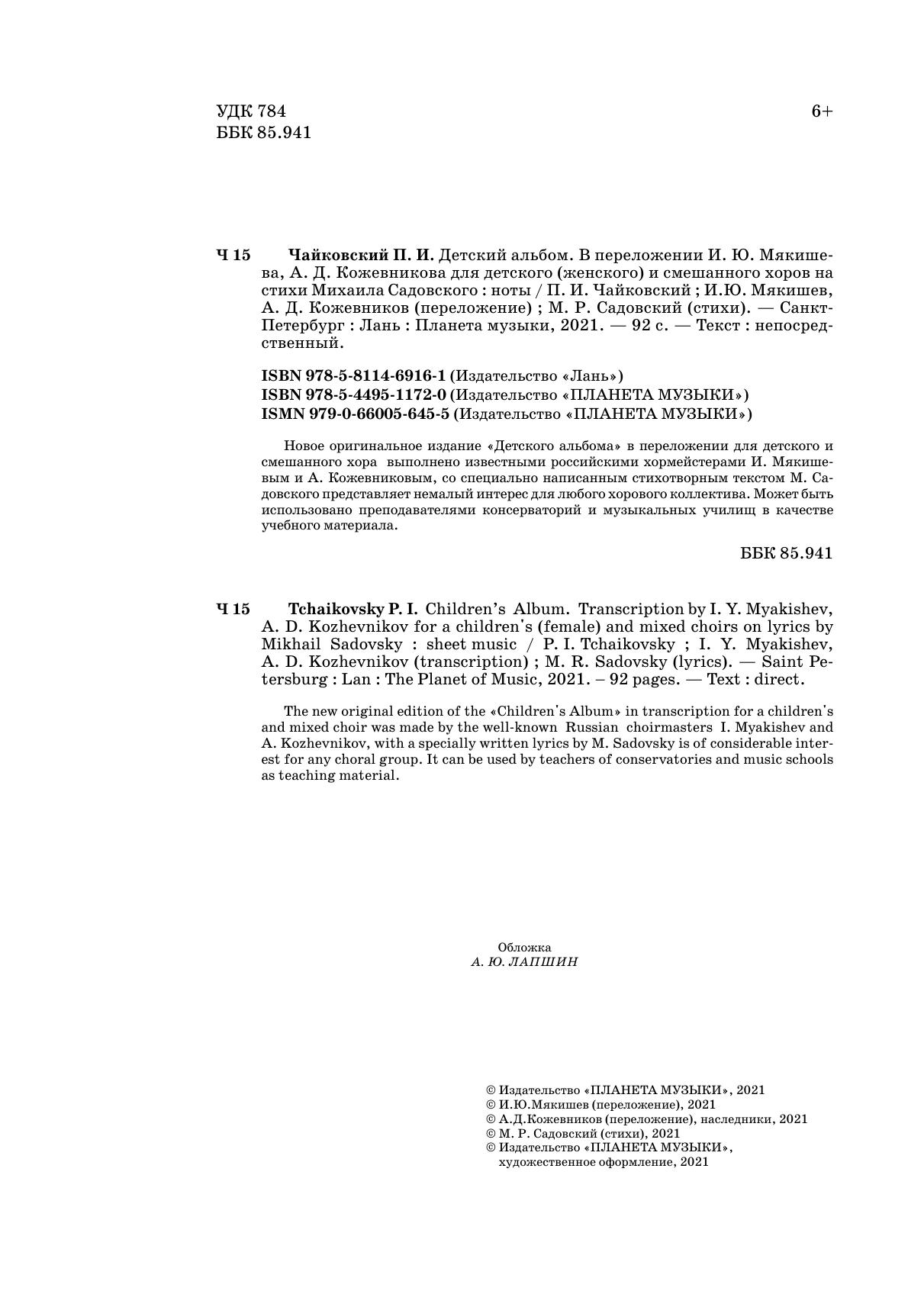 The new original edition of the «Children's Album» in transcription for a children's and mixed choir was made by the well-known Russian choirmasters I. Myakishev and A. Kozhevnikov, with a specially written lyrics by M. Sadovsky is of considerable interest for any choral group. It can be used by teachers of conservatories and music schools as teaching material.
