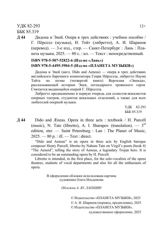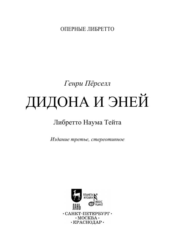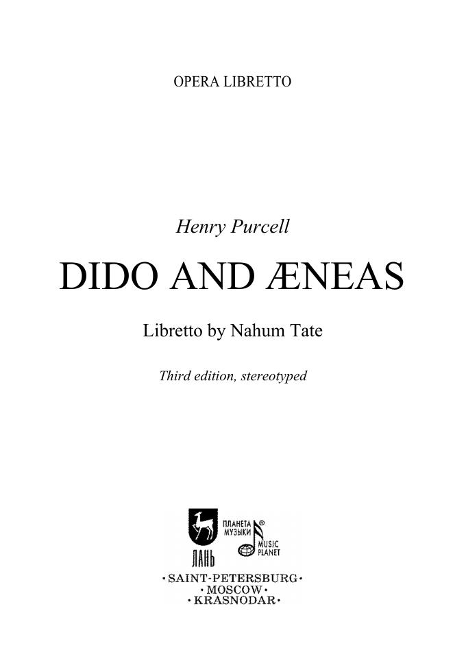 Дидона и Эней (англ. Dido and Aeneas) — опера в трех действиях английского барочного композитора Генри Пёрселла, либретто Наума Тейта по поэме (четвертой книге) Вергилия «Энеида», рассказывающей историю Энея, легендарного троянского героя. Считается выдающейся оперой Г. Пёрселла. Либретто предназначено в первую очередь для солистов-вокалистов оперных театров, студентов вокальных отделений, а также всем любителям оперной музыки. “Dido and Aeneas” is an opera in three acts by English baroque composer Henry Purcell, libretto by Nahum Tate on Virgil’s poem (book 4) “The Aeneid”, telling the story of Aeneas, a legendary Trojan hero. It is considered to be an outstanding opera by H. Purcell. Libretto is intended, in the first place, for the solo-vocalists of the opera theatres, students of vocal departments and also for all the enthusiasts of opera.