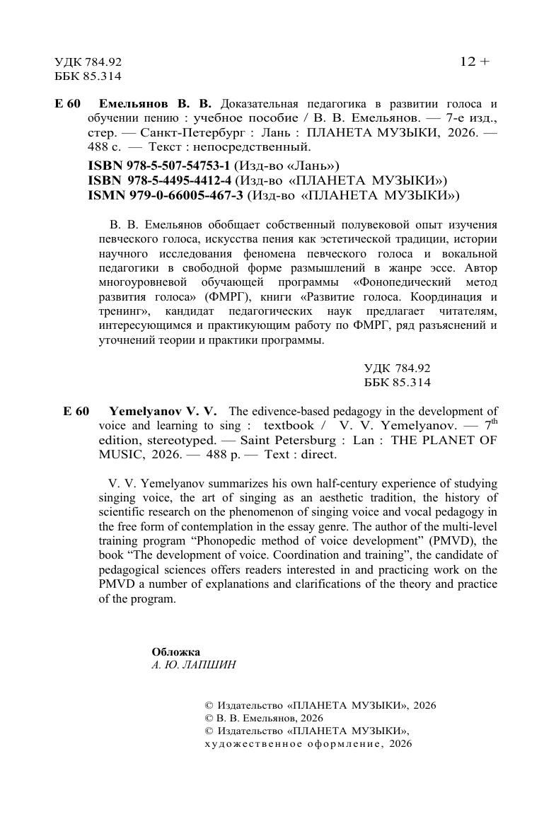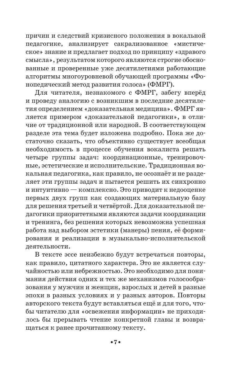 В.В. Емельянов обобщает собственный полувековой опыт изучения певческого голоса, искусства пения как эстетической традиции, истории научного исследования феномена певческого голоса и вокальной педагогики в свободной форме размышлений в жанре эссе. Автор многоуровневой обучающей программы «Фонопедический метод развития голоса» (ФМРГ), книги «Развитие голоса. Координация и тренинг», кандидат педагогических наук предлагает читателям, интересующимся и практикующим работу по ФМРГ, ряд разъяснений и уточнений теории и практики программы. V.V. Yemelyanov summarizes his own half-century experience of studying singing voice, the art of singing as an aesthetic tradition, the history of scientific research on the phenomenon of singing voice and vocal pedagogy in the free form of contemplation in the essay genre. The author of the multi-level training program "Phonopedic method of voice development" (PMVD), the book "The development of voice. Coordination and training”, the candidate of pedagogical sciences offers readers interested in and practicing work on the PMVD a number of explanations and clarifications of the theory and practice of the program.