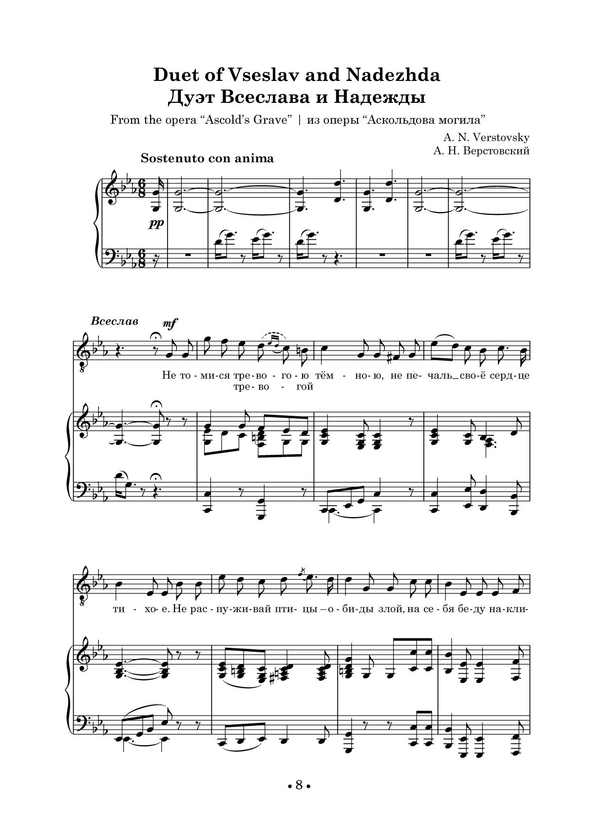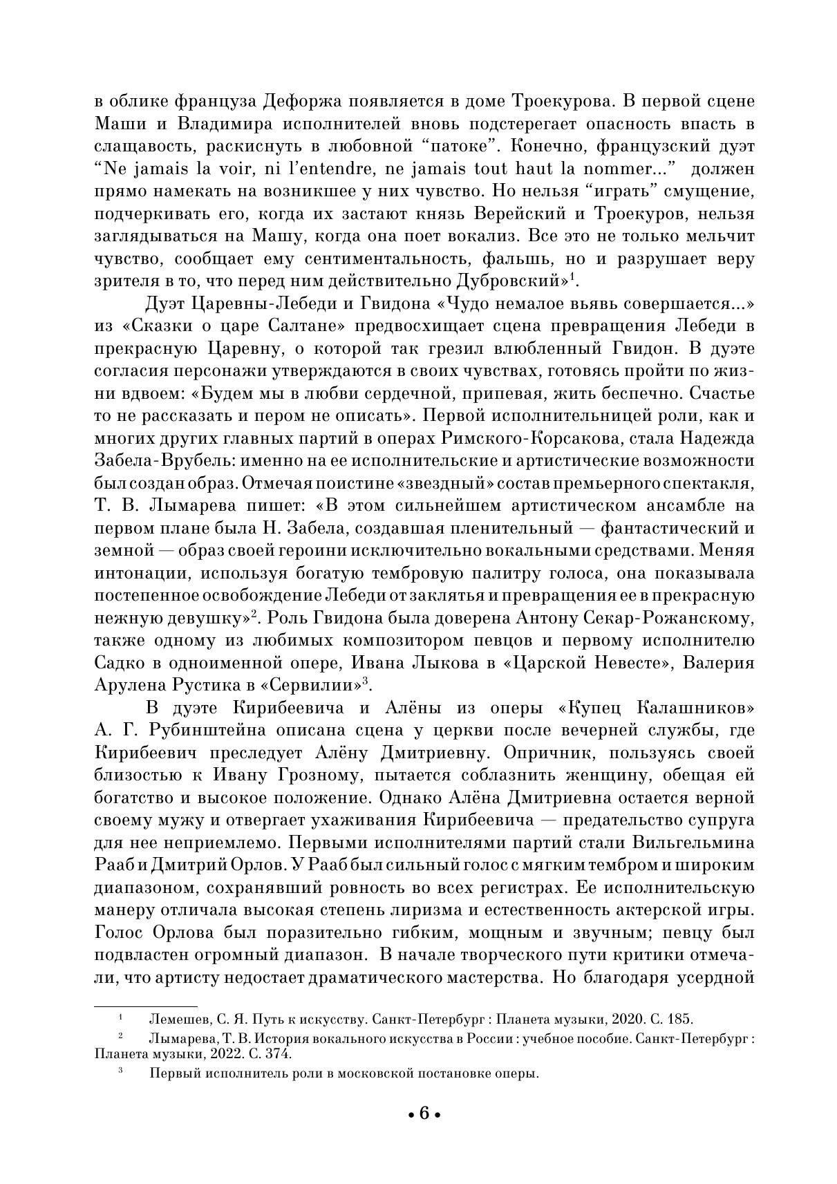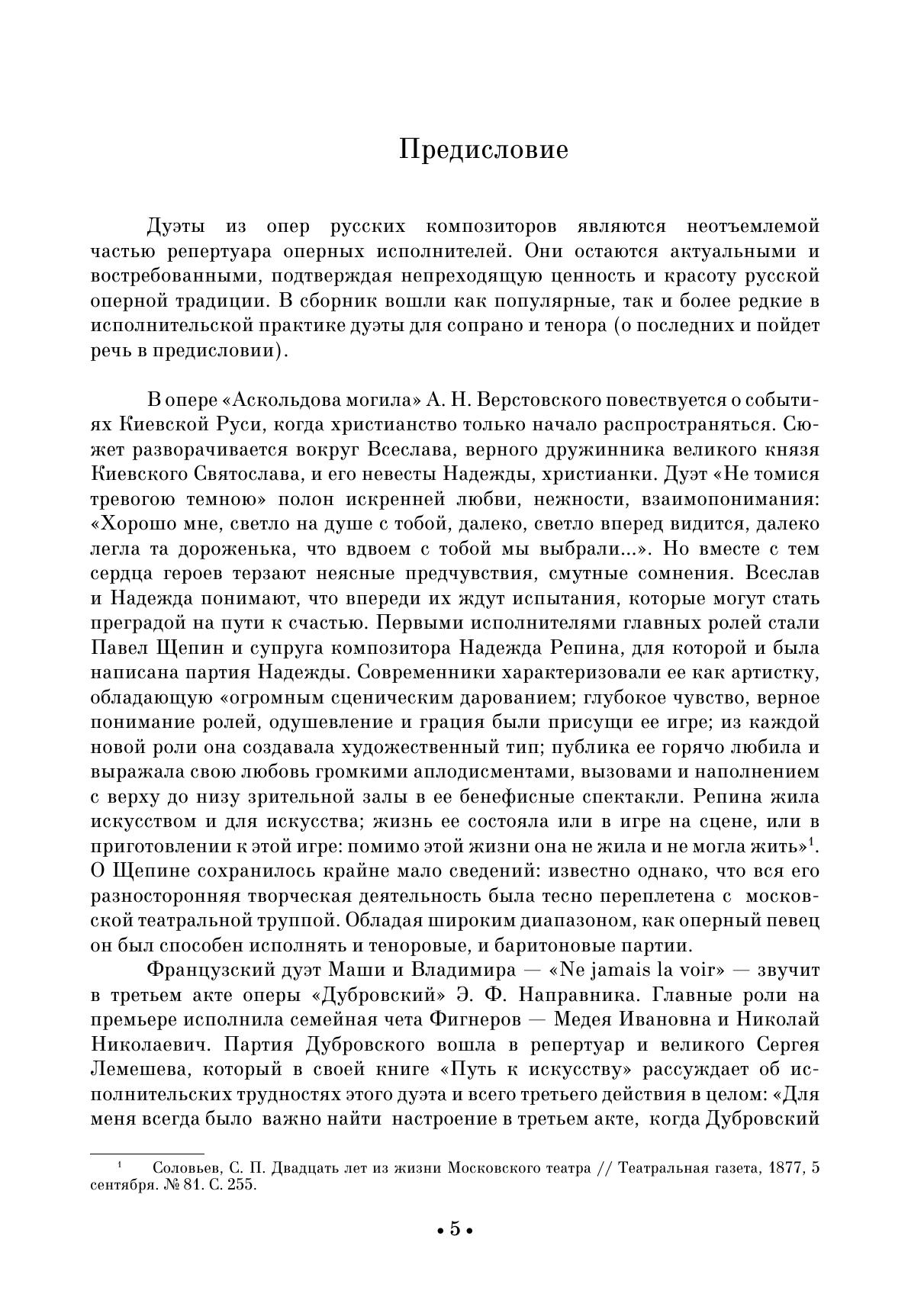 В сборник вошли дуэты для сопрано и тенора из опер русских композиторов: А. Н. Верстовского («Аскольдова могила»), А. С. Даргомыжского («Русалка»), Э. Ф.Направника («Дубровский»), С. В. Рахманинова («Алеко»), Н. А. Римского-Корсакова («Садко», «Сказка о царе Салтане», «Снегурочка», А. Г. Рубинштейна («Купец Калашников»), П. И. Чайковского («Ромео и Джульетта», «Иоланта», «Мазепа»). Издание адресовано студентам-вокалистам музыкальных училищ, вузов, профессиональным исполнителям. The collection includes duets for soprano and tenor from operas by Russian composers: A. N. Verstovsky («Ascold’s Grave»), A. S. Dargomyzhsky («Rusalka»), E. F. Napravnik («Dubrovsky»), S. V. Rachmaninoff («Aleko»), N. A. Rimsky-Korsakov («Sadko», «The Tale of Tsar Saltan», «The Snow Maiden»), A. G. Rubin-stein («The Merchant Kalashnikov»), P. I. Tchaikovsky («Romeo and Juliet», «Iolanta», «Mazeppa»). The edition is addressed to students of vocal departments of music colleges and higher schools and professional performers.
