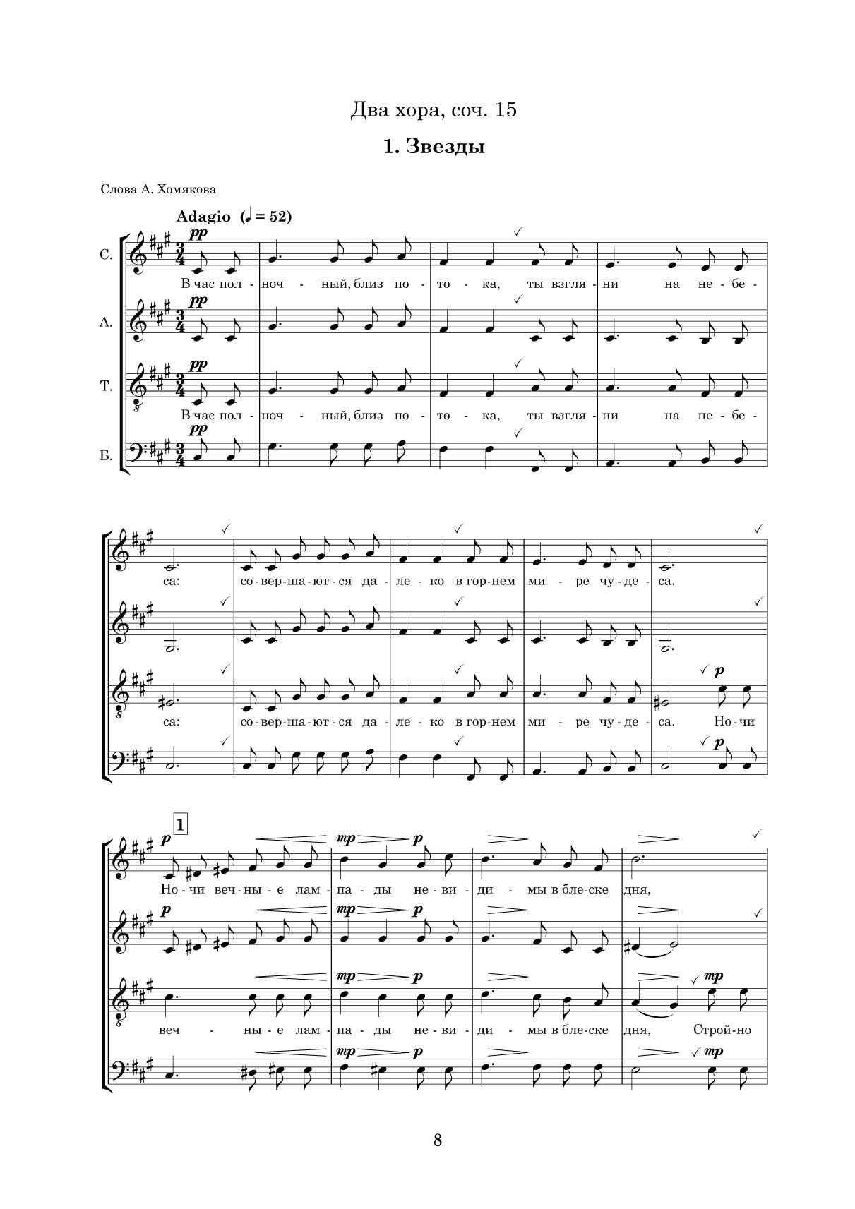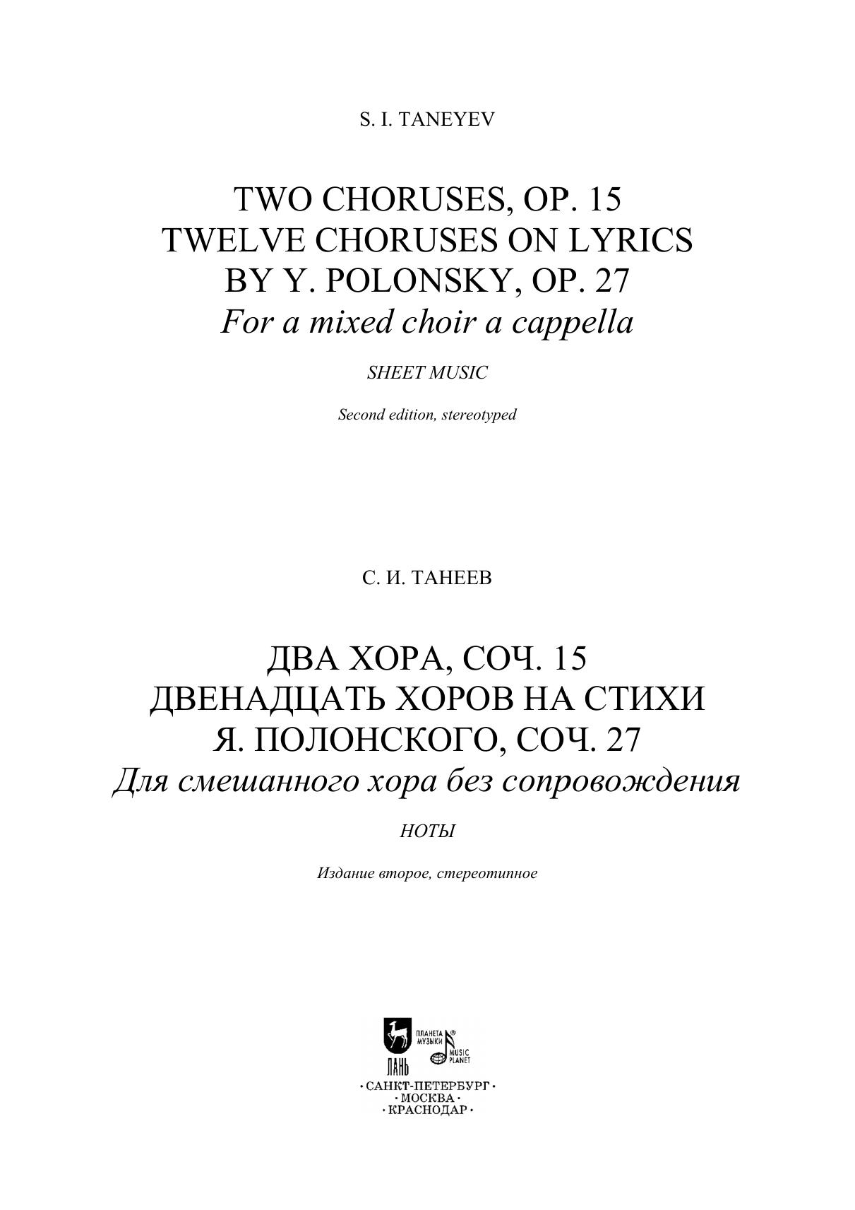 Два хора, соч. 15. Двенадцать хоров на стихи Я. Полонского, соч. 27. Для смешанного хора без сопровождения