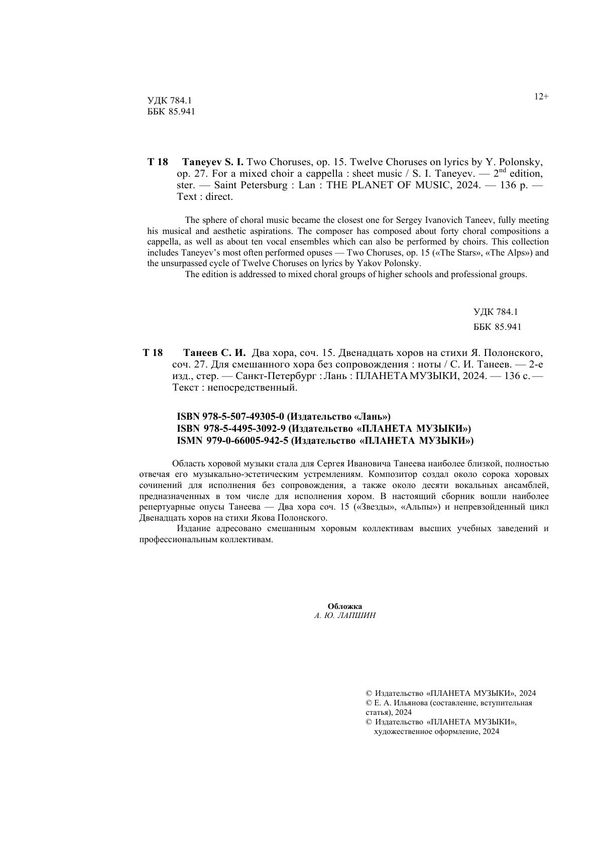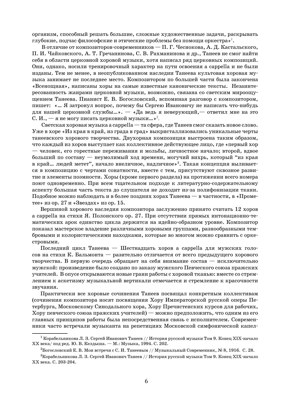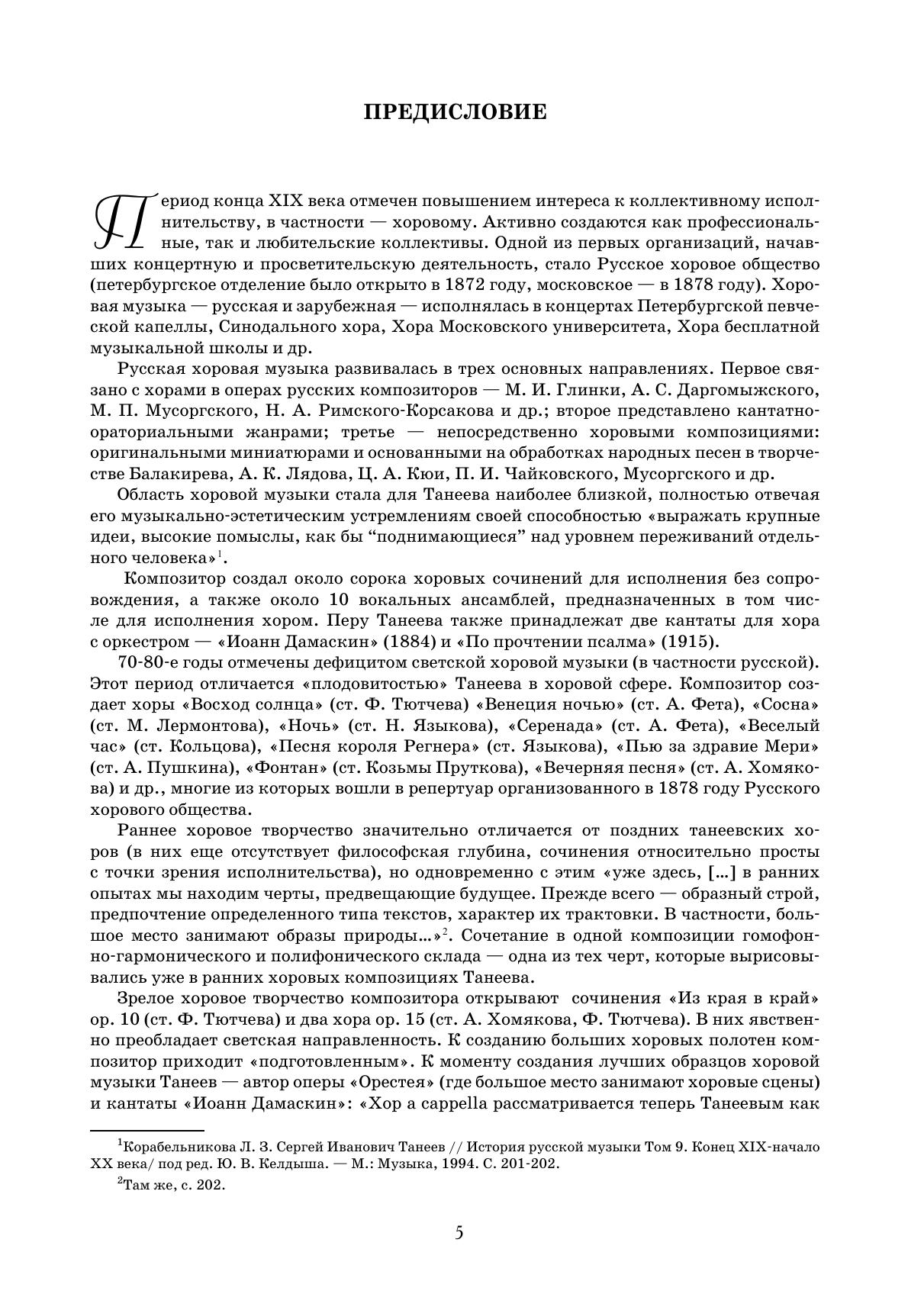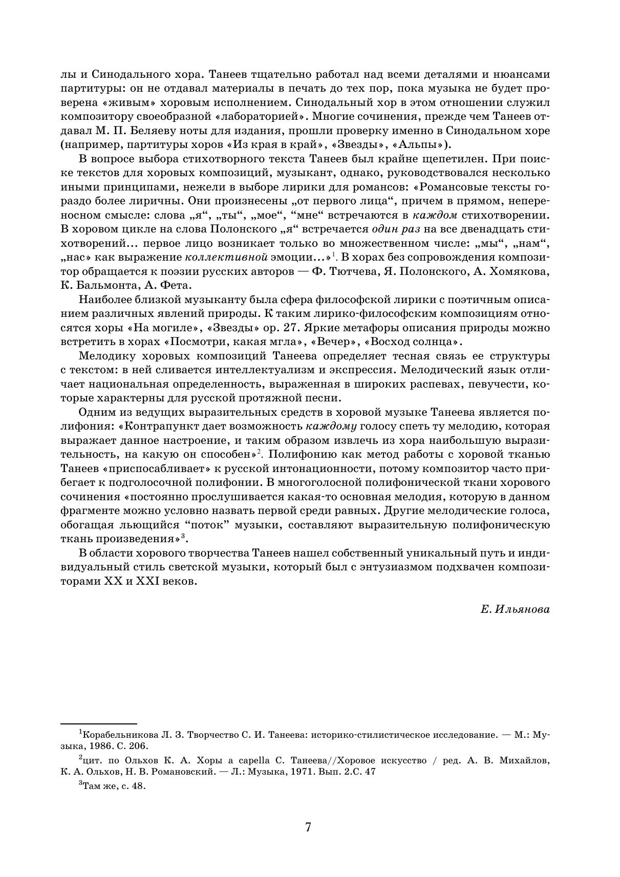 Область хоровой музыки стала для Сергея Ивановича Танеева наиболее близкой, полностью отвечая его музыкально-эстетическим устремлениям. Композитор создал около сорока хоровых сочинений для исполнения без сопровождения, а также около десяти вокальных ансамблей, предназначенных в том числе для исполнения хором. В настоящий сборник вошли наиболее репертуарные опусы Танеева — Два хора соч. 15 («Звезды», «Альпы») и непревзойденный цикл Двенадцать хоров на стихи Якова Полонского. Издание адресовано смешанным хоровым коллективам высших учебных заведений и профессиональным коллективам.