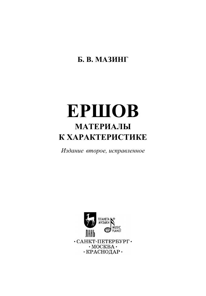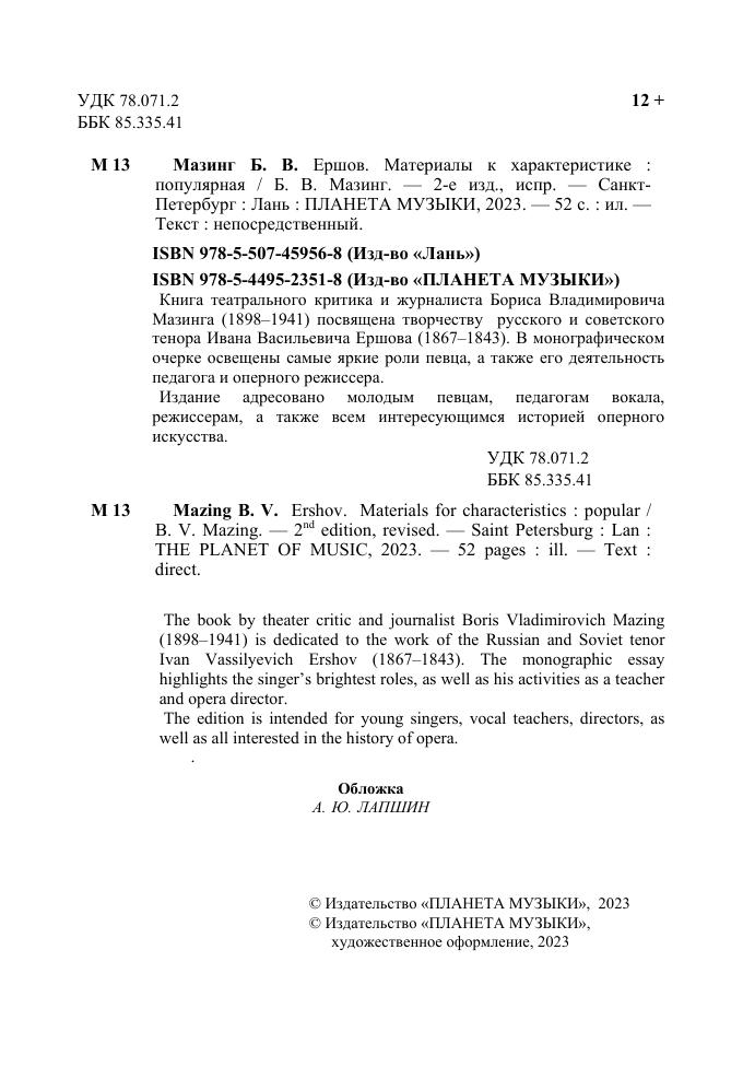 Книга театрального критика и журналиста Бориса Владимировича Мазинга (1898–1941) посвящена творчеству русского и советского тенора Ивана Васильевича Ершова (1867–1843). В монографическом очерке освещены самые яркие роли певца, а также его деятельность педагога и оперного режиссера. Издание адресовано молодым певцам, педагогам вокала, режиссерам, а также всем интересующимся историей оперного искусства. The book by theater critic and journalist Boris Vladimirovich Mazing (1898–1941) is dedicated to the work of the Russian and Soviet tenor Ivan Vassilyevich Ershov (1867–1843). The monographic essay highlights the singer’s brightest roles, as well as his activities as a teacher and opera director. The edition is intended for young singers, vocal teachers, directors, as well as all interested in the history of opera.
