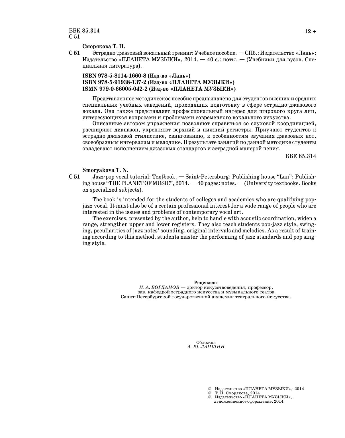 The book is intended for the students of colleges and academies who are qualifying pop-jazz vocal. It must also be of a certain professional interest for a wide range of people who are interested in the issues and problems of contemporary vocal art. The exercises, presented by the author, help to handle with acoustic coordination, widen a range, strengthen upper and lower registers. They also teach students pop-jazz style, swinging, peculiarities of jazz notes’ sounding, original intervals and melodies. As a result of training according to this method, students master the performing of jazz standards and pop singing style.
