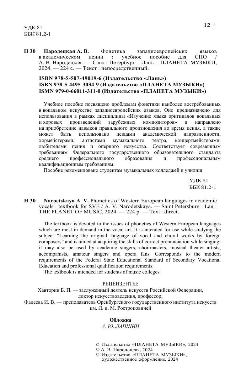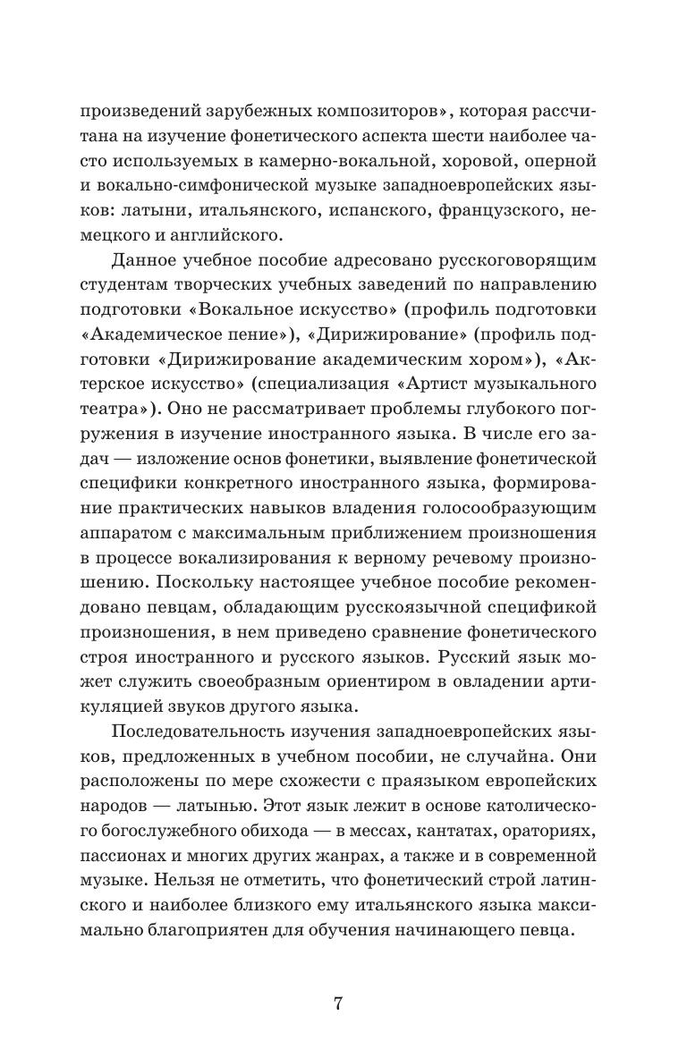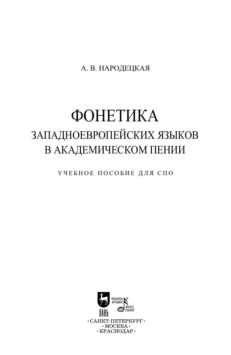 Учебное пособие посвящено проблемам фонетики наиболее востребованных в вокальном искусстве западноевропейских языков. Оно предназначено для использования в рамках дисциплины «Изучение языка оригиналов вокальных и хоровых произведений зарубежных композиторов» и направлено на приобретение навыков правильного произношения во время пения, а также может быть использовано певцами академической направленности, хормейстерами, артистами музыкального театра, концертмейстерами, любителями пения и оперного искусства. Соответствует современным требованиям Федерального государственного образовательного стандарта среднего профессионального образования и профессиональным квалификационным требованиям. Пособие рекомендовано студентам музыкальных колледжей и училищ. The textbook is devoted to the issues of phonetics of Western European languages which are most in demand in the vocal art. It is intended for use while studying the subject “Learning the original language of vocal and choral works by foreign composers” and is aimed at acquiring the skills of correct pronunciation while singing, it may also be used by academic singers, choirmasters, musical theater artists, accompanists, amateur singers and opera fans. Corresponds to the modern requirements of the Federal State Educational Standard of Secondary Vocational Education and professional qualification requirements. The textbook is intended for students of music colleges.