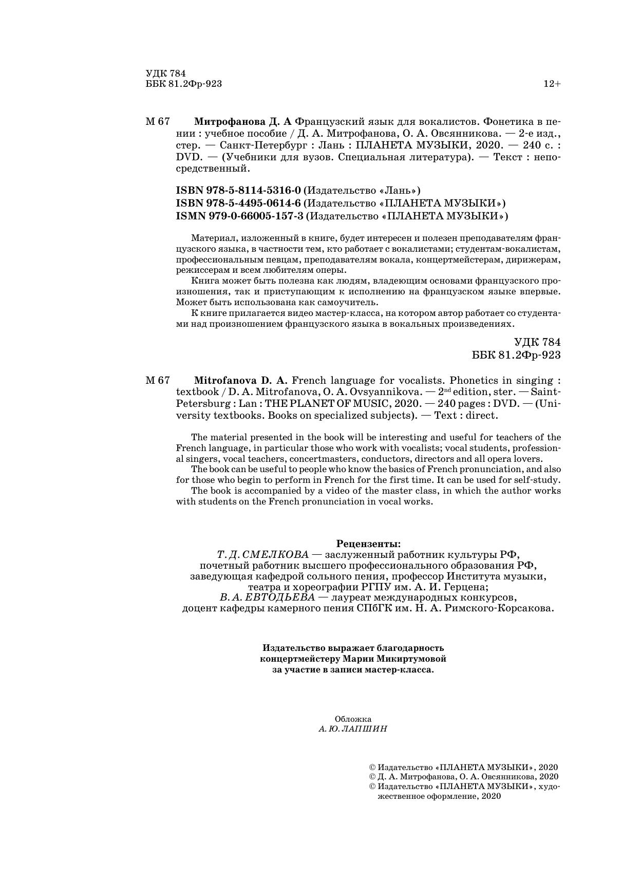 К книге прилагается видео мастер-класса, на котором автор работает со студентами над произношением французского языка в вокальных произведениях.