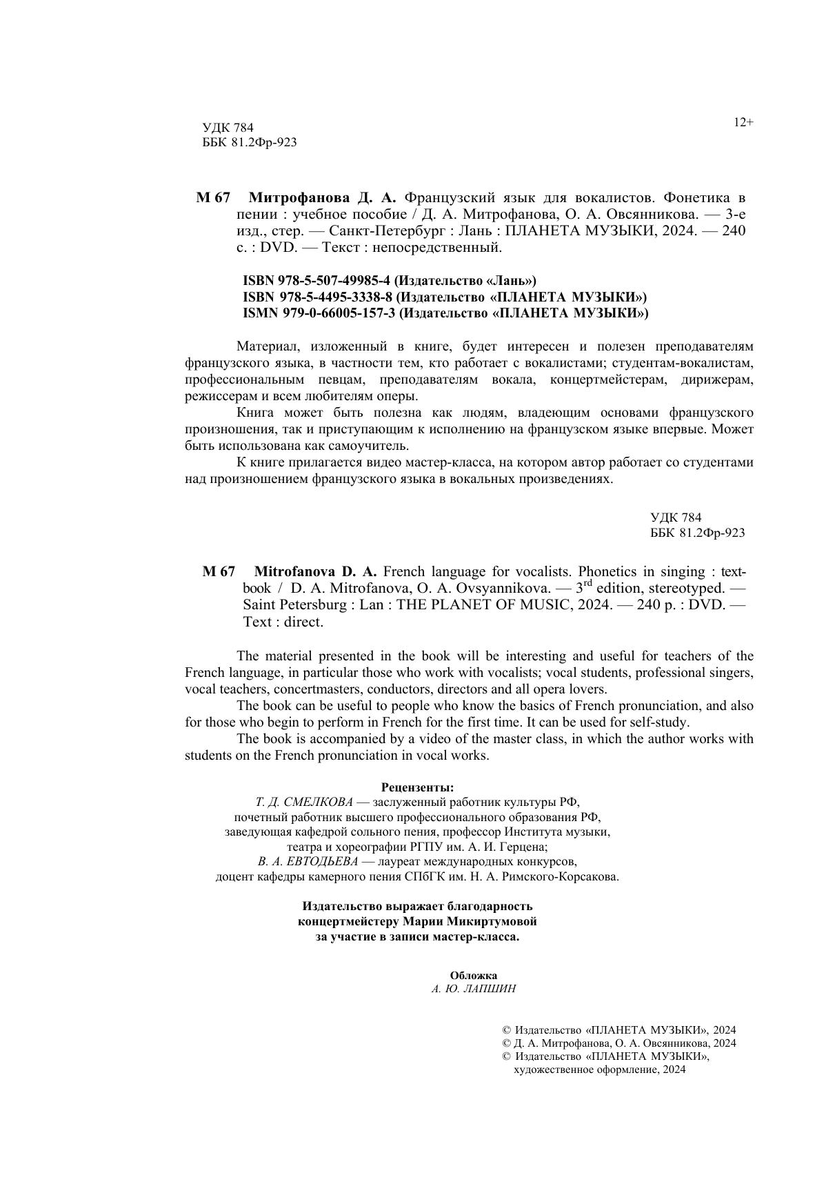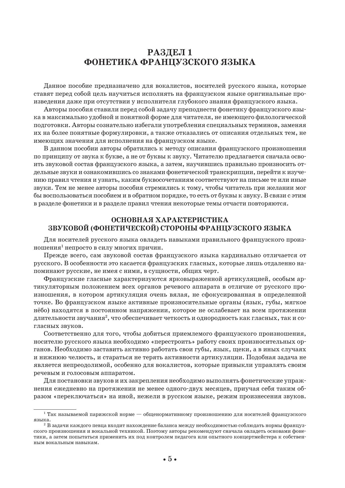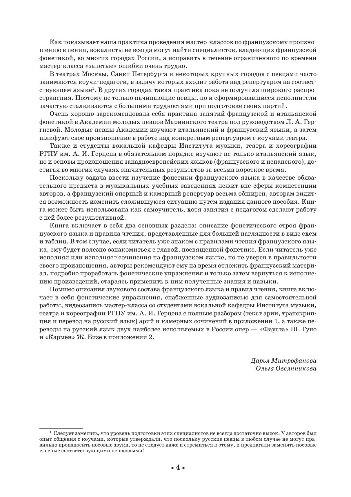 Материал, изложенный в книге, будет интересен и полезен преподавателям французского языка, в частности тем, кто работает с вокалистами, студентам-вокалистам, профессиональным певцам, преподавателям вокала, концертмейстерам, дирижерам, режиссерам и всем любителям оперы. Книга может быть полезна как людям, владеющим основами французского произношения, так и приступающим к исполнению на французском языке впервые. Может быть использована как самоучитель. К книге прилагается видео мастер-класса, на котором автор работает со студентами над произношением французского языка в вокальных произведениях.