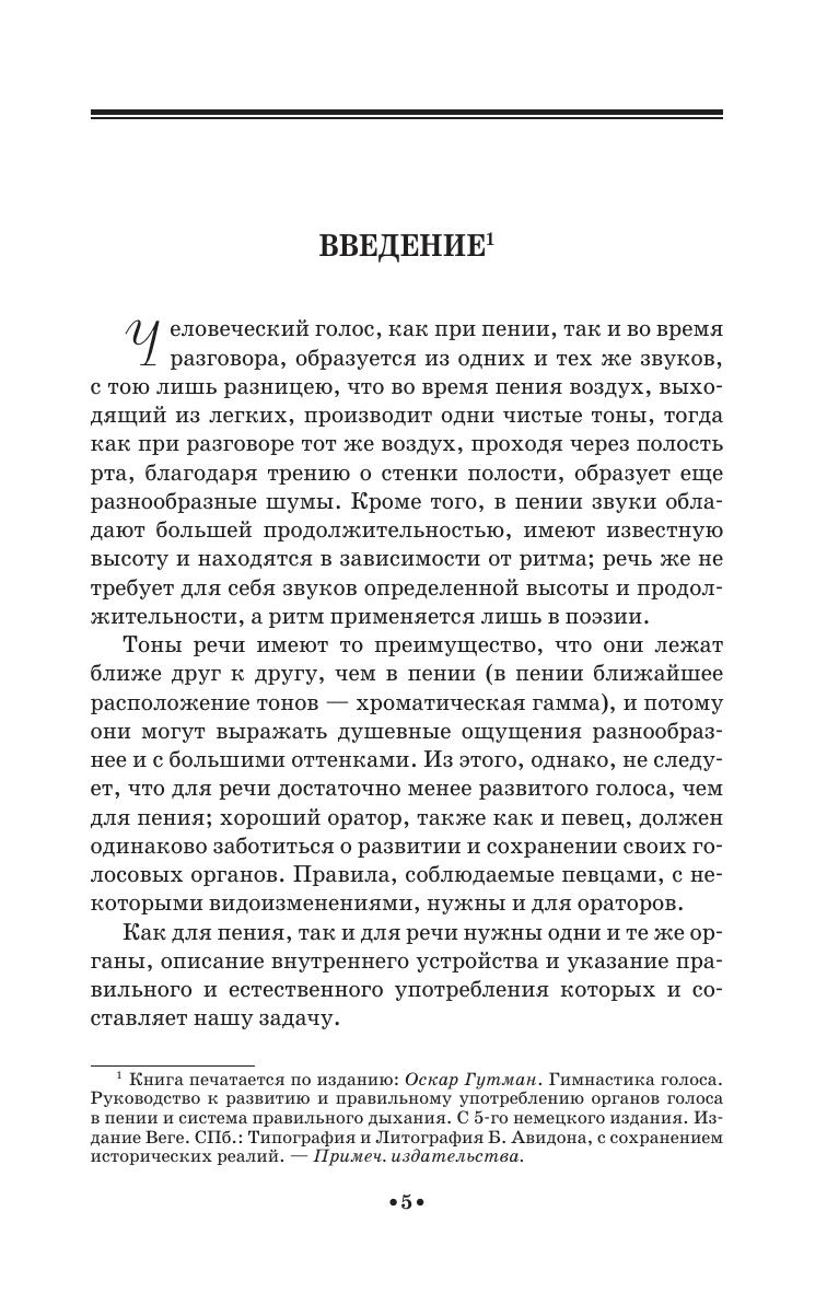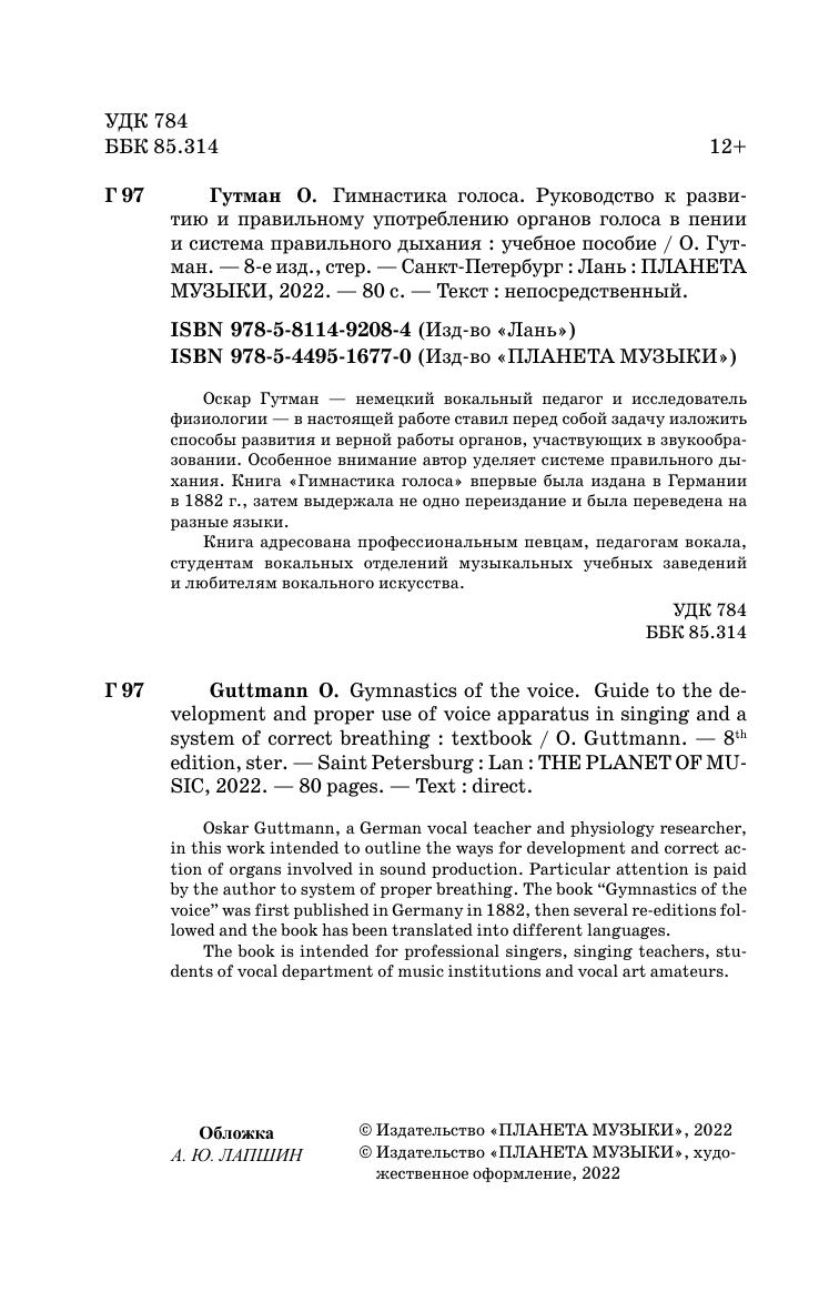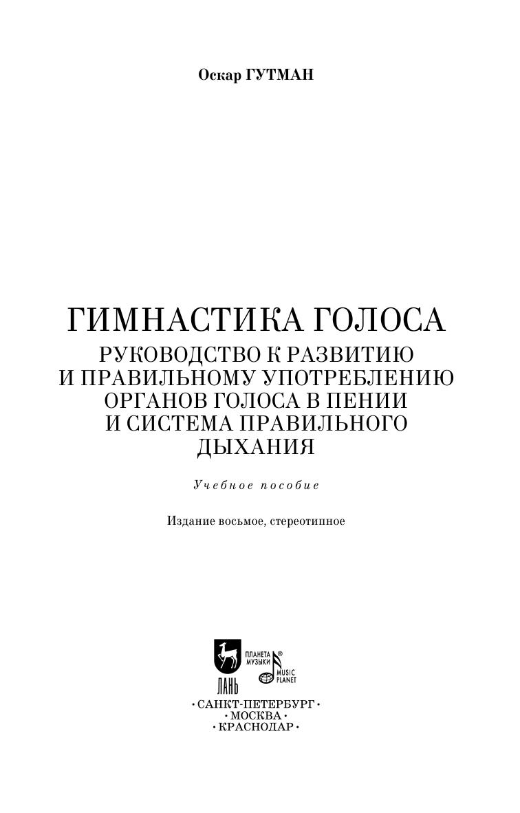 Оскар Гутман – немецкий вокальный педагог и исследователь физиологии – в настоящей работе ставил перед собой задачу изложить способы развития и верной работы органов, участвующих в звукообразовании. Особенное внимание автор уделяет системе правильного дыхания. Книга «Гимнастика голоса» впервые была издана в Германии в 1882 г., затем выдержала не одно переиздание и была переведена на разные языки.