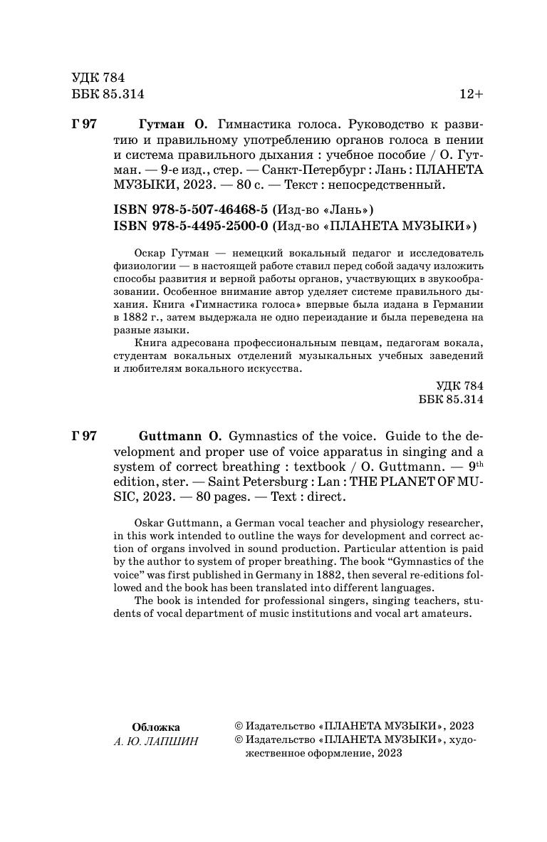 Оскар Гутман – немецкий вокальный педагог и исследователь физиологии – в настоящей работе ставил перед собой задачу изложить способы развития и верной работы органов, участвующих в звукообразовании. Особенное внимание автор уделяет системе правильного дыхания. Книга «Гимнастика голоса» впервые была издана в Германии в 1882 г., затем выдержала не одно переиздание и была переведена на разные языки.
