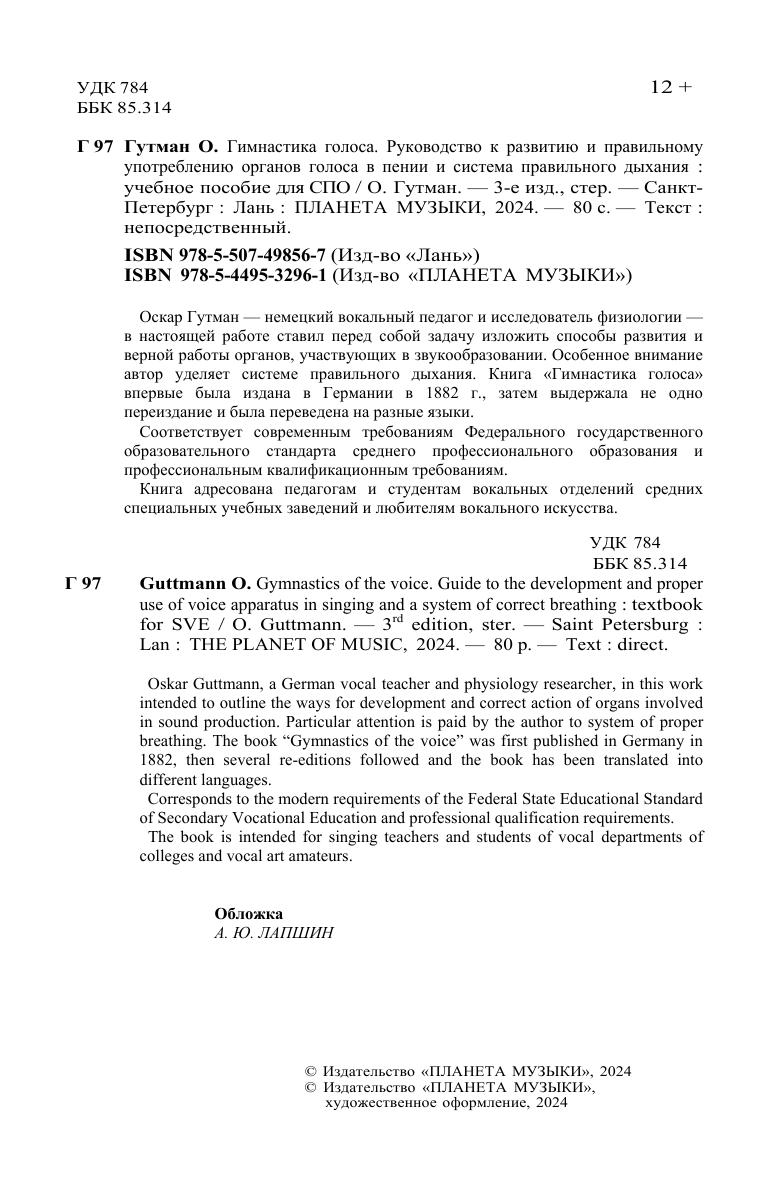 Оскар Гутман – немецкий вокальный педагог и исследователь физиологии – в настоящей работе ставил перед собой задачу изложить способы развития и верной работы органов, участвующих в звукообразовании. Особенное внимание автор уделяет системе правильного дыхания. Книга «Гимнастика голоса» впервые была издана в Германии в 1882 г., затем выдержала не одно переиздание и была переведена на разные языки. Книга адресована педагогам и студентам вокальных отделений средних специальных учебных заведений и любителям вокального искусства. Oskar Guttmann, a German vocal teacher and physiology researcher, in this work intended to outline the ways for development and correct action of organs involved in sound production. Particular attention is paid by the author to system of proper breathing. The book "Gymnastics of the voice " was first published in Germany in 1882, then several re-editions followed and the book has been translated into different languages. The book is intended for singing teachers and students of vocal department of colleges and vocal art amateurs.