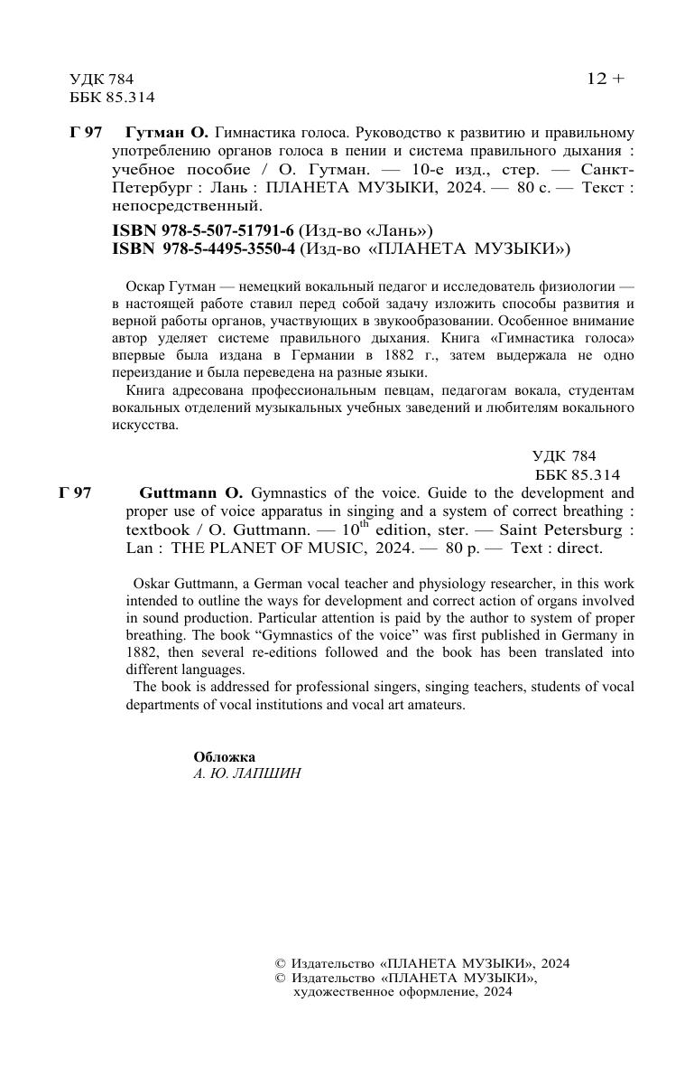 Оскар Гутман – немецкий вокальный педагог и исследователь физиологии – в настоящей работе ставил перед собой задачу изложить способы развития и верной работы органов, участвующих в звукообразовании. Особенное внимание автор уделяет системе правильного дыхания. Книга «Гимнастика голоса» впервые была издана в Германии в 1882 г., затем выдержала не одно переиздание и была переведена на разные языки. Книга адресована профессиональным певцам, педагогам вокала, студентам вокальных отделений музыкальных учебных заведений и любителям вокального искусства.