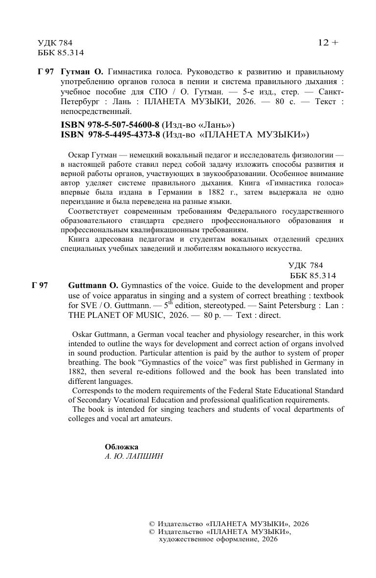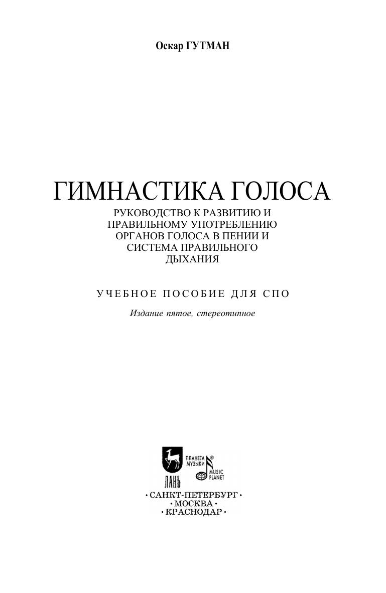 Оскар Гутман – немецкий вокальный педагог и исследователь физиологии – в настоящей работе ставил перед собой задачу изложить способы развития и верной работы органов, участвующих в звукообразовании. Особенное внимание автор уделяет системе правильного дыхания. Книга «Гимнастика голоса» впервые была издана в Германии в 1882 г., затем выдержала не одно переиздание и была переведена на разные языки. Книга адресована педагогам и студентам вокальных отделений средних специальных учебных заведений и любителям вокального искусства. Oskar Guttmann, a German vocal teacher and physiology researcher, in this work intended to outline the ways for development and correct action of organs involved in sound production. Particular attention is paid by the author to system of proper breathing. The book "Gymnastics of the voice " was first published in Germany in 1882, then several re-editions followed and the book has been translated into different languages. The book is intended for singing teachers and students of vocal department of colleges and vocal art amateurs.