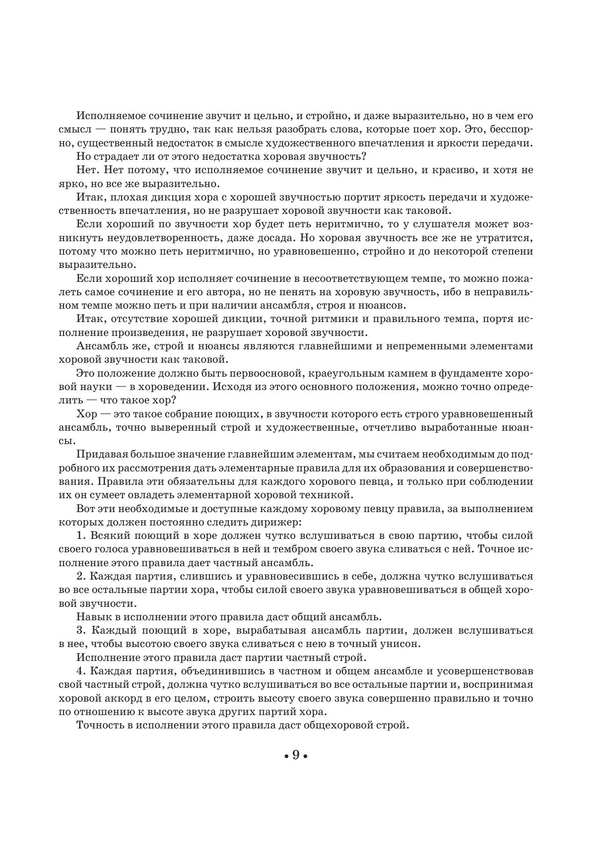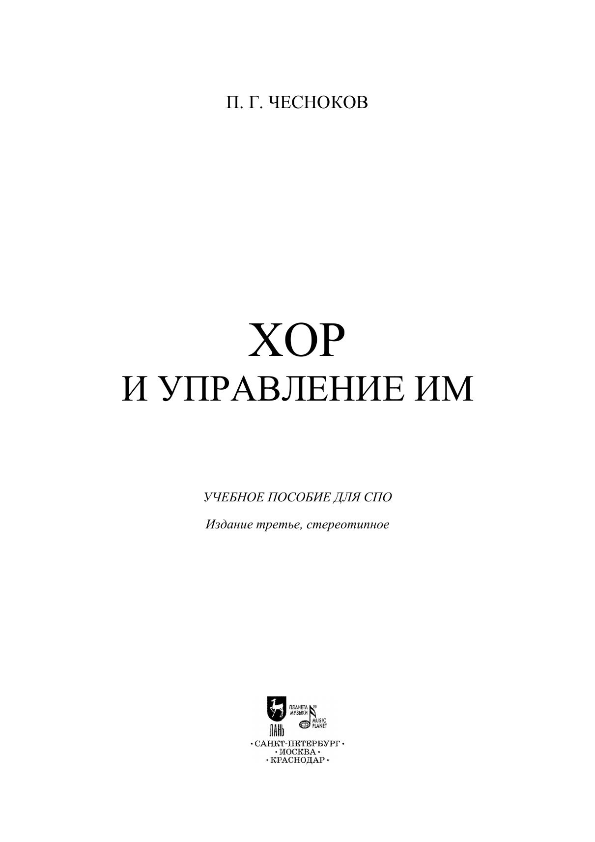 П. Г. Чесноков — один из крупнейших мастеров русской хоровой культуры, способствовавший своей разносторонней музыкальной деятельностью поднятию ее на новый, высочайший уровень. Настоящий труд посвящен хору без инструментального сопровождения — a cappella. Книга разделяется на две части: хороведение и хороуправление. Первая часть решает три главных вопроса: что такое хор, каковы элементы хоровой звучности и каковы способы выявления и выработки этих элементов. Задача второй части — определить практические приемы управления хором. Пособие предназначено для студентов средних специальных музыкальных учебных заведений. P. G. Chesnokov is one of the most outstanding masters of Russian choral arts, that raised to a higher level due to his versatile musical activities. The textbook is dedicated to the choirs without instrumental accompaniment — a capella. The book divided into two parts. The first part describes the structure of the choir, elements of choral sonority and guidelines for developing and cultivating these elements. The second part presents choir conducting techniques. The textbook is intended for the students of colleges.