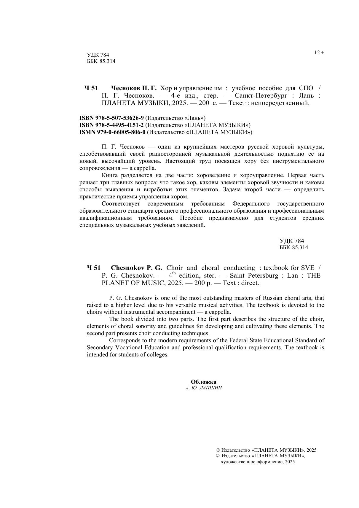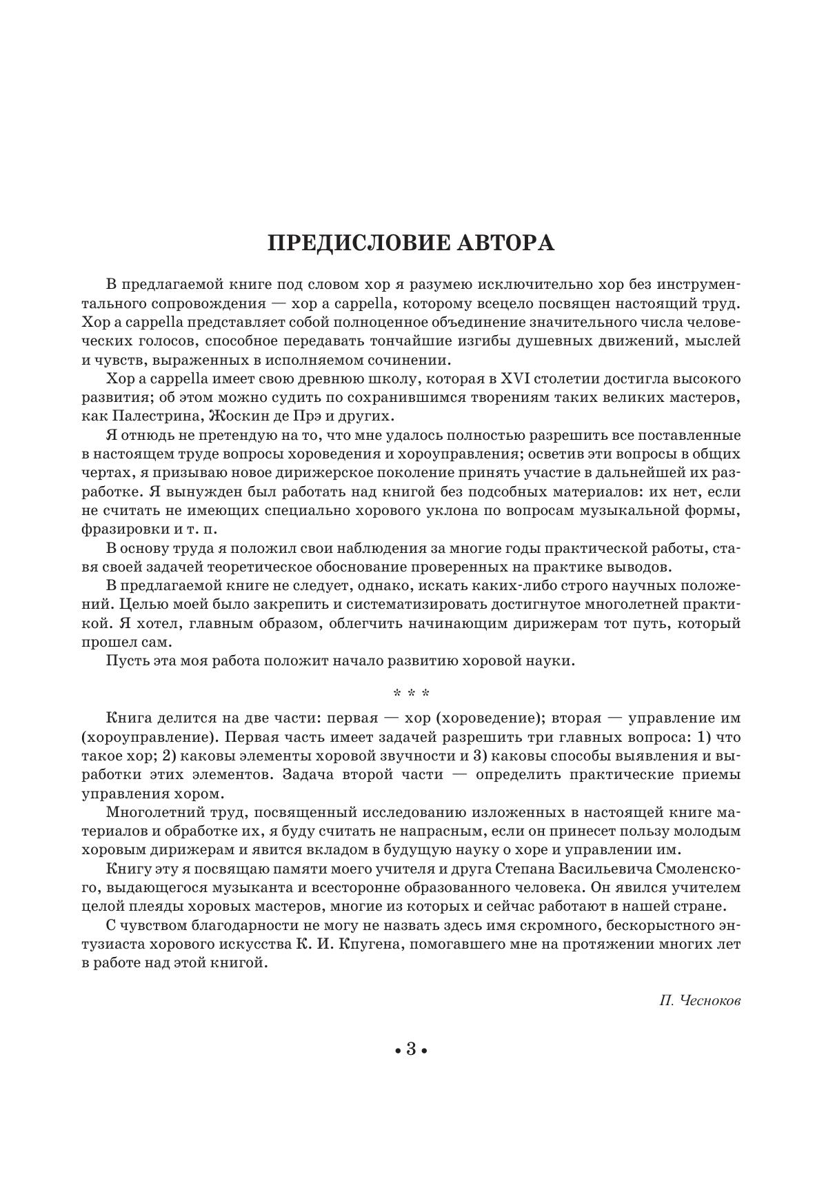П. Г. Чесноков — один из крупнейших мастеров русской хоровой культуры, способствовавший своей разносторонней музыкальной деятельностью поднятию ее на новый, высочайший уровень. Настоящий труд посвящен хору без инструментального сопровождения — a cappella. Книга разделяется на две части: хороведение и хороуправление. Первая часть решает три главных вопроса: что такое хор, каковы элементы хоровой звучности и каковы способы выявления и выработки этих элементов. Задача второй части — определить практические приемы управления хором. Пособие предназначено для студентов средних специальных музыкальных учебных заведений. P. G. Chesnokov is one of the most outstanding masters of Russian choral arts, that raised to a higher level due to his versatile musical activities. The textbook is dedicated to the choirs without instrumental accompaniment — a capella. The book divided into two parts. The first part describes the structure of the choir, elements of choral sonority and guidelines for developing and cultivating these elements. The second part presents choir conducting techniques. The textbook is intended for the students of colleges.