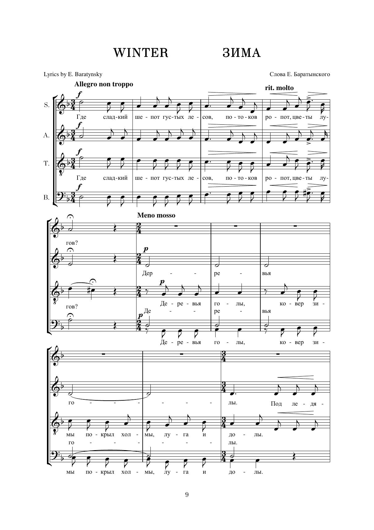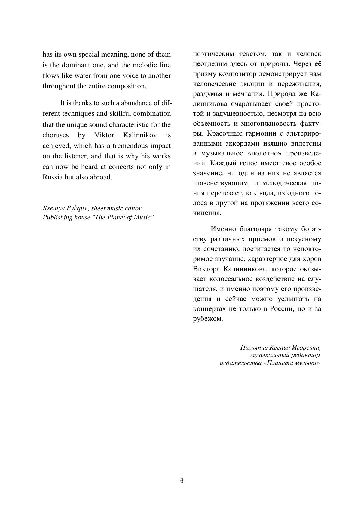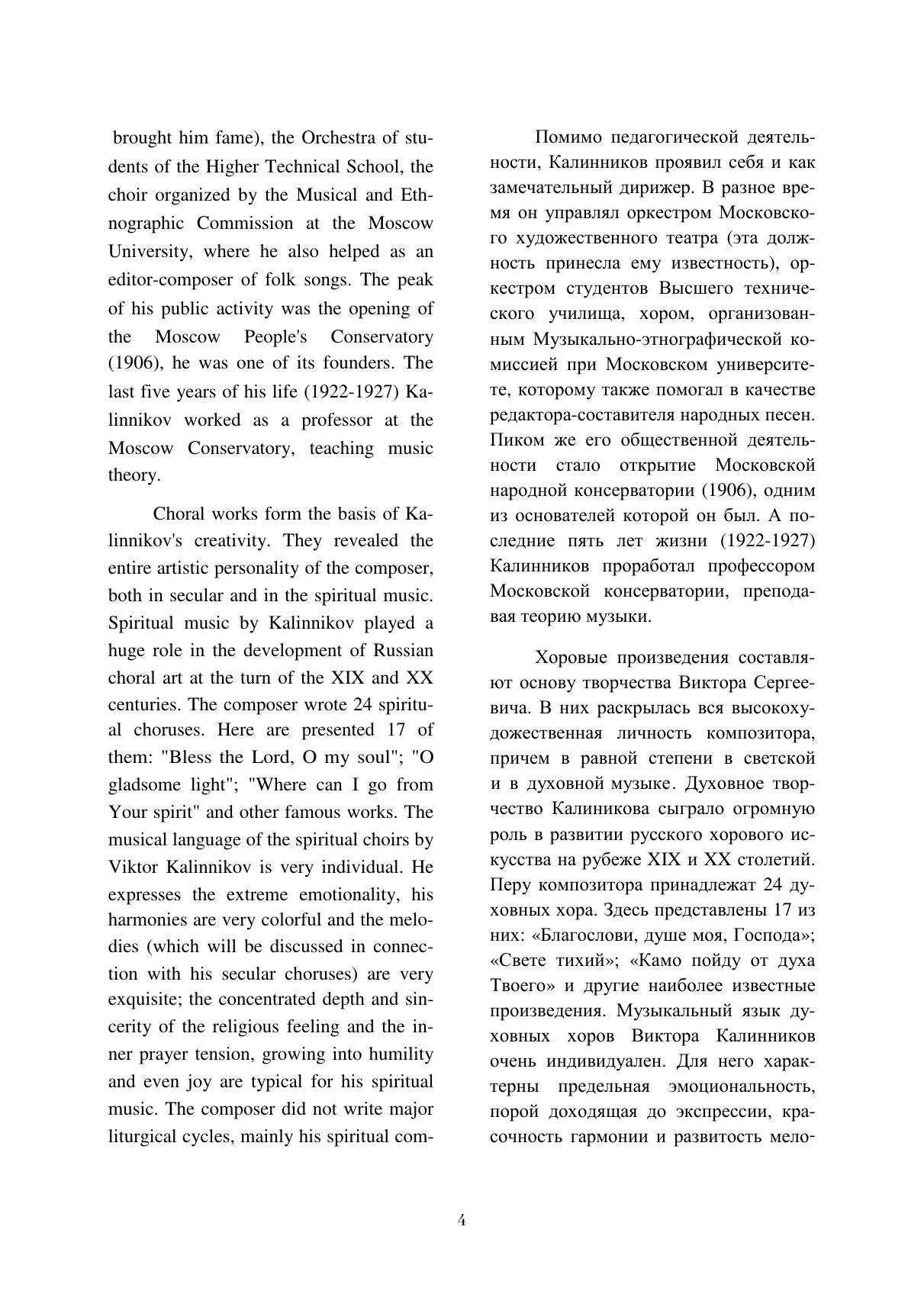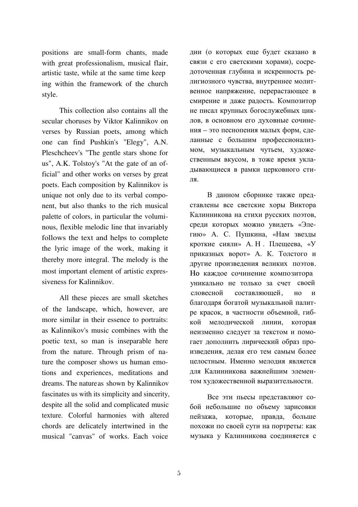 Данный сборник включает в себя все 15 светских хоров на стихи русских поэтов (А. С. Пушкин, А. К. Толстой и др.), а также 17 самых известных духовных песнопений композитора.