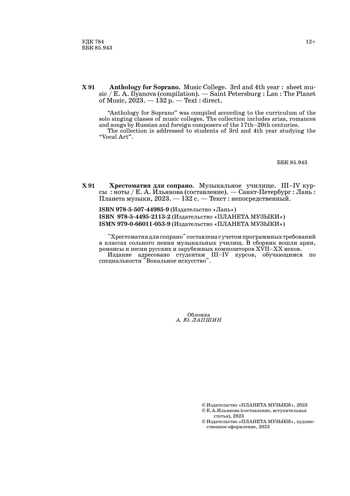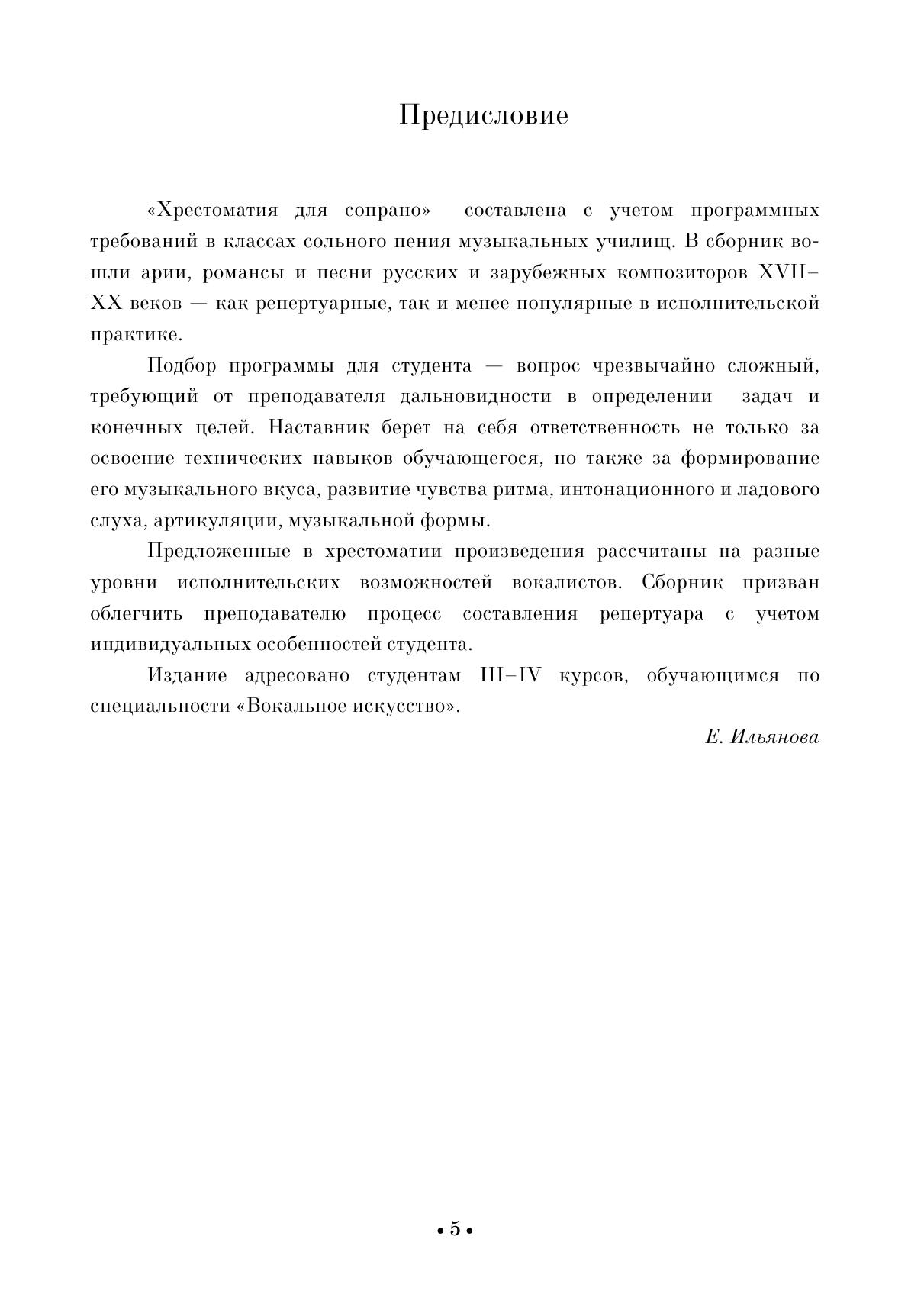 "Хрестоматия для сопрано" составлена с учетом программных требований в классах сольного пения музыкальных училищ. В сборник вошли арии, романсы и песни русских и зарубежных композиторов XVII-XX веков. Издание адресовано студентам III-IV курсов, обучающимся по специальности "Вокальное искусство".