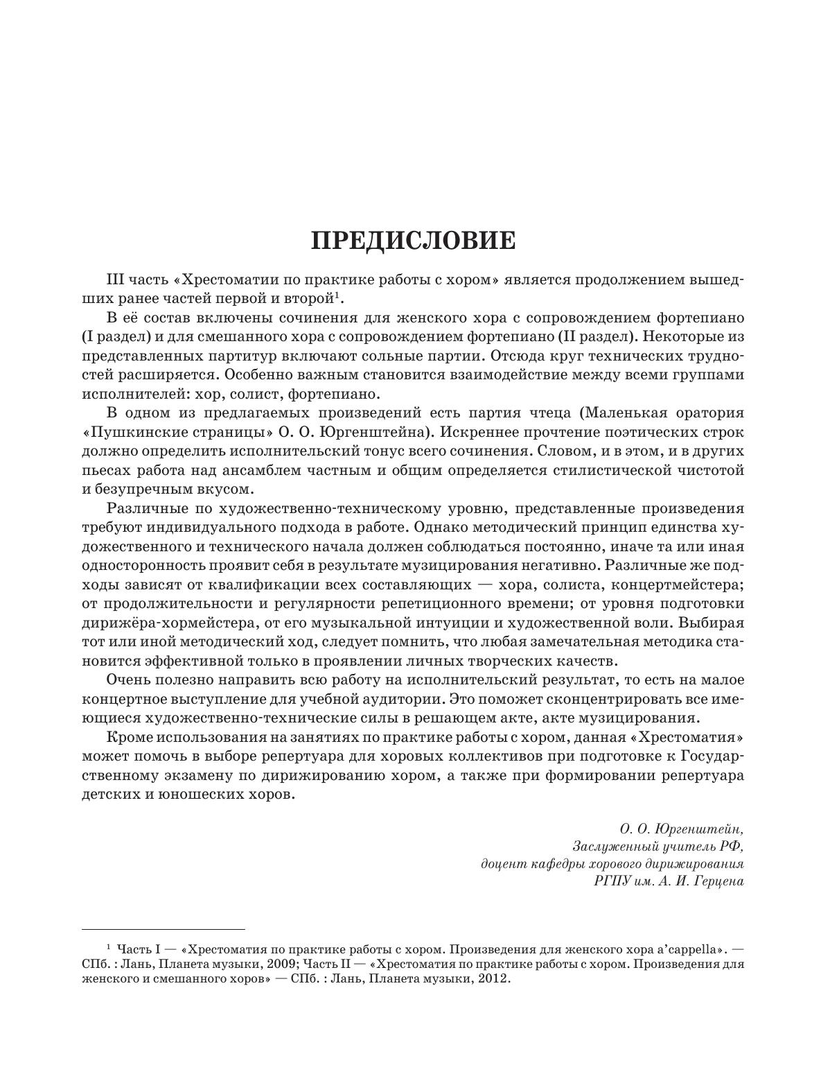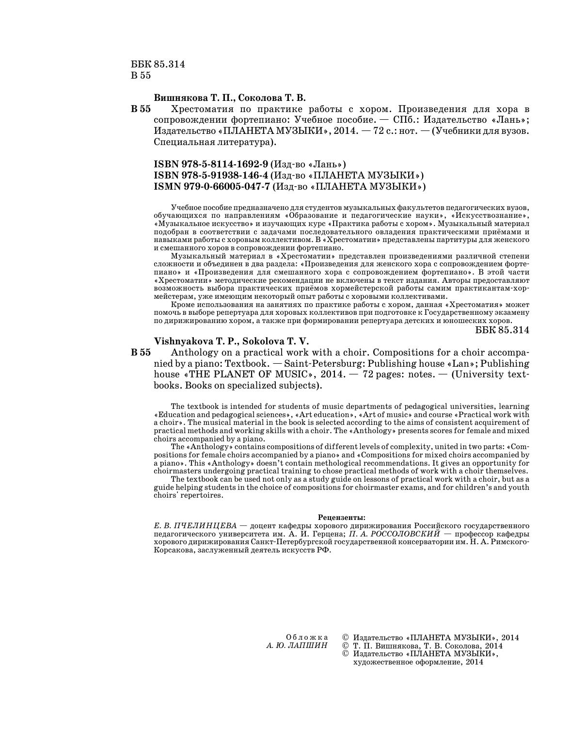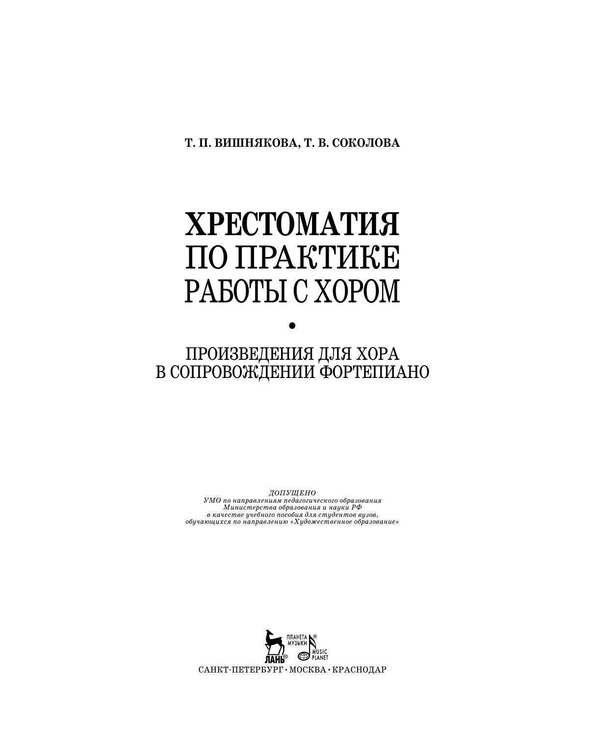 The textbook is intended for students of music departments of pedagogical universities, learning «Education and pedagogical sciences», «Art education», «Art of music» and course «Practical work with a choir». The musical material in the book is selected according to the aims of consistent acquirement of practical methods and working skills with a choir. The «Anthology» presents scores for female and mixed choirs accompanied by a piano. The «Anthology» contains compositions of different levels of complexity, united in two parts: «Compositions for female choirs accompanied by a piano» and «Compositions for mixed choirs accompanied by a piano». This «Anthology» doesn't contain methological recommendations. It gives an opportunity for choirmasters undergoing practical training to chose practical methods of work with a choir themselves. The textbook can be used not only as a study guide on lessons of practical work with a choir, but as a guide helping students in the choice of compositions for choirmaster exams, and for children's and youth choirs' repertoires.