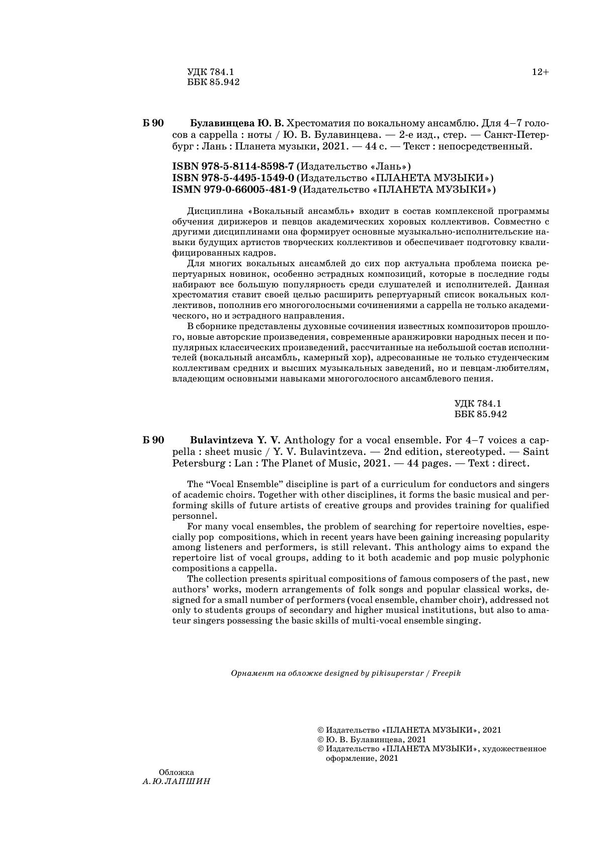 Для многих вокальных ансамблей до сих пор актуальна проблема поиска репертуарных новинок, особенно эстрадных композиций, которые в последние годы набирают все большую популярность среди слушателей и исполнителей. Данная хрестоматия ставит своей целью расширить репертуарный список вокальных коллективов, пополнив его многоголосными сочинениями a cappella не только академического, но и эстрадного направления.