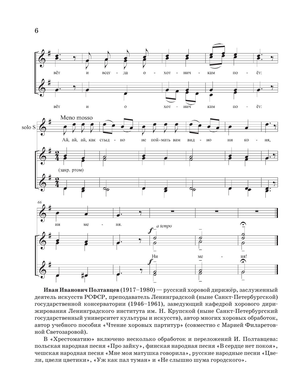 Учебное пособие предназначено для студентов музыкальных факультетов педагогических вузов, обучающихся по направлениям «Образование и педагогические науки», «Искусствознание», «Музыкальное искусство» и изучающих курс «Практика работы с хором». Музыкальный материал подобран в соответствии с задачами последовательного овладения практическими приемами и навыками работы с хоровым коллективом. В «Хрестоматии» представлены партитуры a cappella для женского и смешанного хора с солистом.