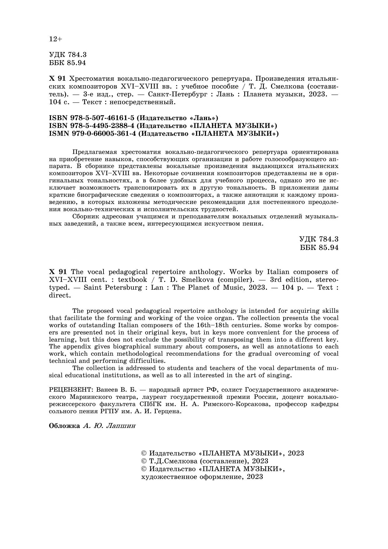Предлагаемая хрестоматия вокально-педагогического репертуара ориентирована на приобретение навыков, способствующих организации и работе голосообразующего аппарата. В сборнике представлены вокальные произведения выдающихся итальянских композиторов XVI – XVIII вв. Некоторые сочинения композиторов представлены не в оригинальных тональностях, а в более удобных для учебного процесса, однако это не исключает возможность транспонировать их в другую тональность. В приложении даны краткие биографические сведения о композиторах, а также аннотации к каждому произведению, в которых изложены методические рекомендации для постепенного преодоления вокально-технических и исполнительских трудностей. Сборник адресован учащимся и преподавателям вокальных отделений музыкальных учебных заведений, а также всем, интересующимся искусством пения.