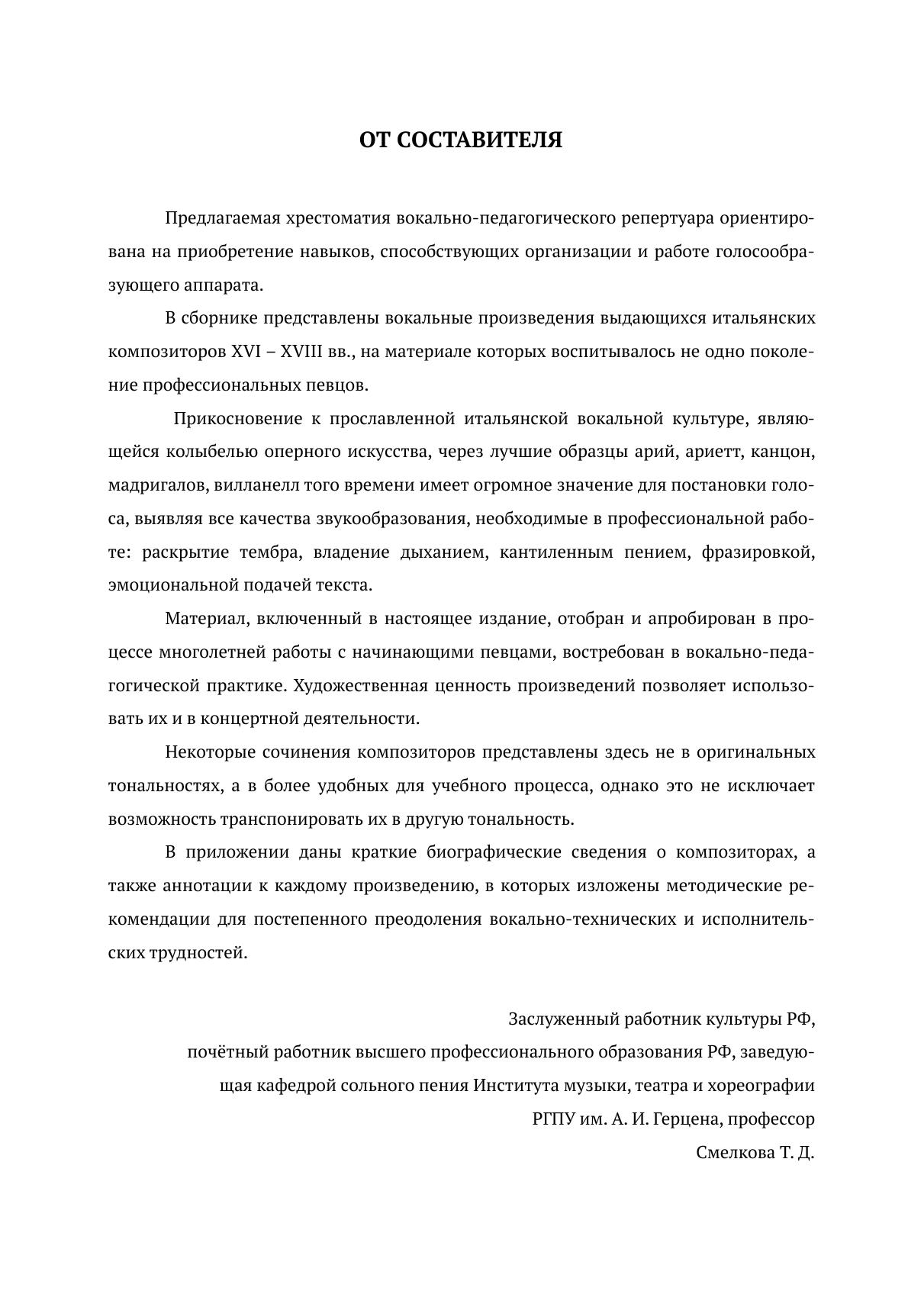 Предлагаемая хрестоматия вокально-педагогического репертуара ориентирована на приобретение навыков, способствующих организации и работе голосообразующего аппарата. В сборнике представлены вокальные произведения выдающихся итальянских композиторов XVI – XVIII вв. Некоторые сочинения композиторов представлены не в оригинальных тональностях, а в более удобных для учебного процесса, однако это не исключает возможность транспонировать их в другую тональность. В приложении даны краткие биографические сведения о композиторах, а также аннотации к каждому произведению, в которых изложены методические рекомендации для постепенного преодоления вокально-технических и исполнительских трудностей. Сборник адресован учащимся и преподавателям вокальных отделений музыкальных учебных заведений, а также всем, интересующимся искусством пения.