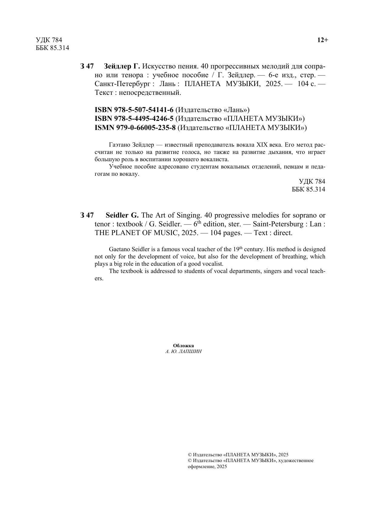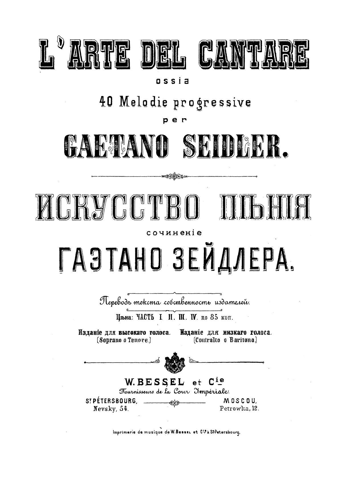 Гаэтано Зейдлер – известный преподаватель вокала 19 века. Его метод рассчитан не только на развитие голоса, но также на развитие дыхания, что играет большую роль в воспитании хорошего вокалиста. Учебное пособие адресовано студентам вокальных отделений, певцам и педагогам по вокалу.