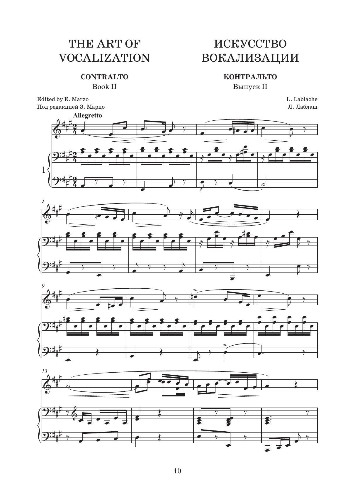 The collections of vocalises for contralto in three books have been compiled by the Italian pianist, organist, conductor, composer and music editor Eduardo Marzo (1852–1929). The second book contains 36 vocalises from the collections of Lablache, Panofka, Bordogni, and others.