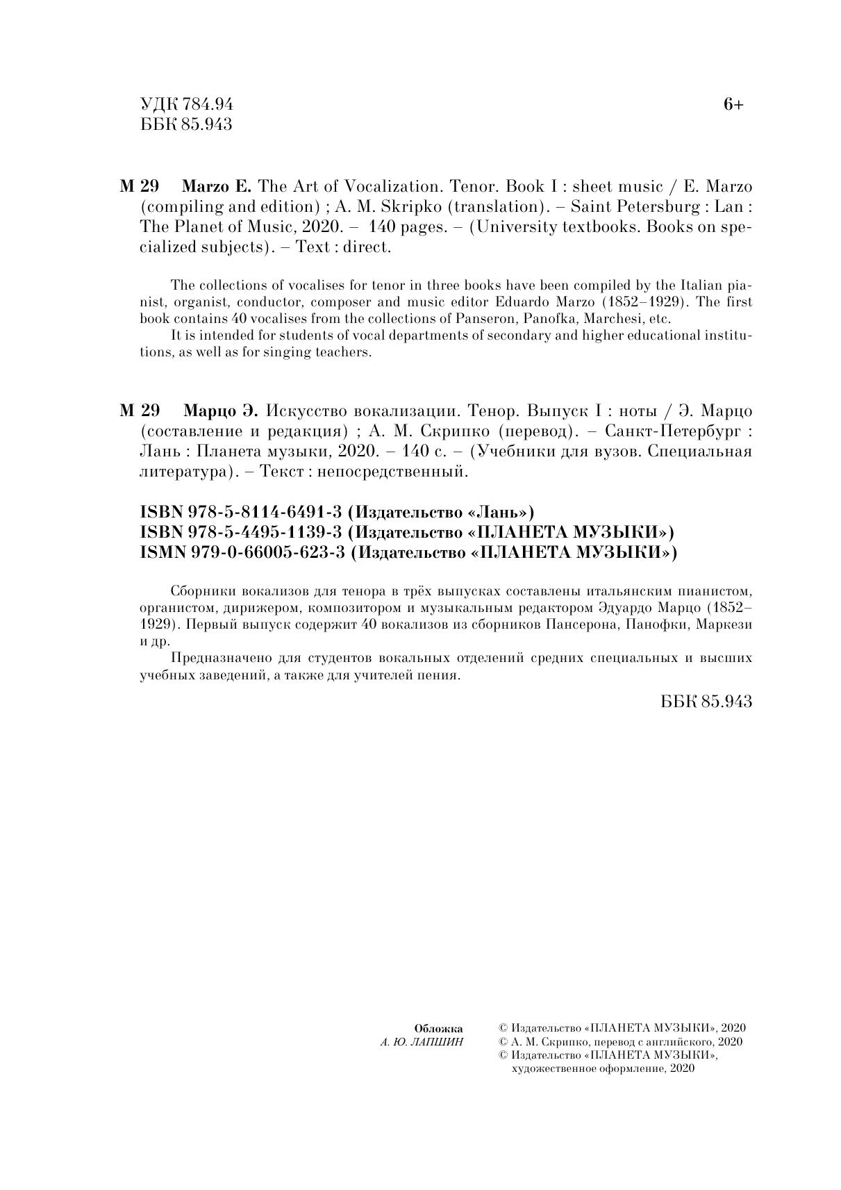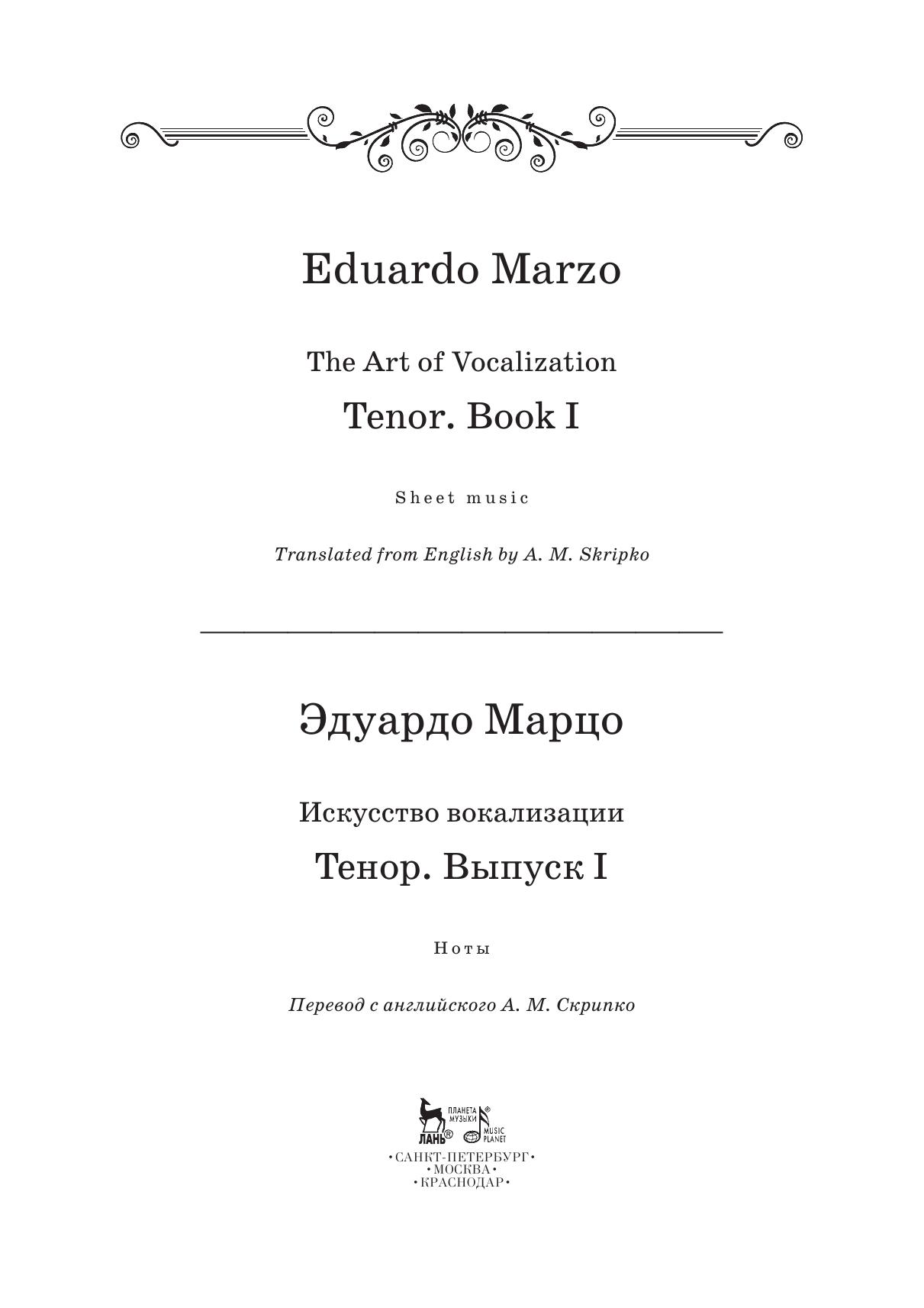 Сборники вокализов для тенора в трех выпусках составлены итальянским пианистом, органистом, дирижером, композитором и музыкальным редактором Эдуардо Марцо (1852-1929). Первый выпуск содержит 40 вокализов из сборников Пансерона, Панофки, Маркези и др.