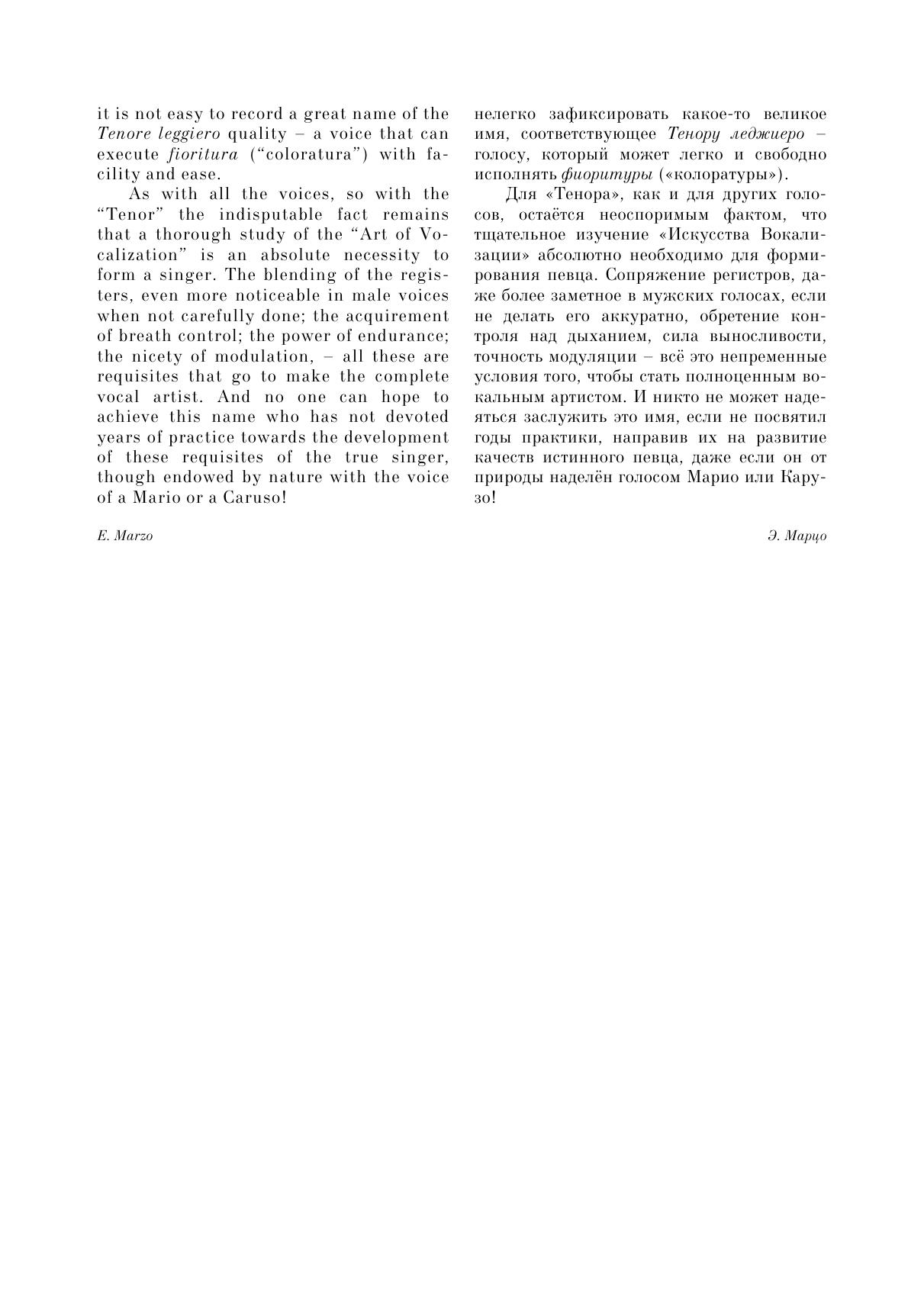 Сборники вокализов для тенора в трех выпусках составлены итальянским пианистом, органистом, дирижером, композитором и музыкальным редактором Эдуардо Марцо (1852-1929). Третий выпуск содержит 24 вокализа из сборников Савинелли, Рубини, Крешентини и др.
