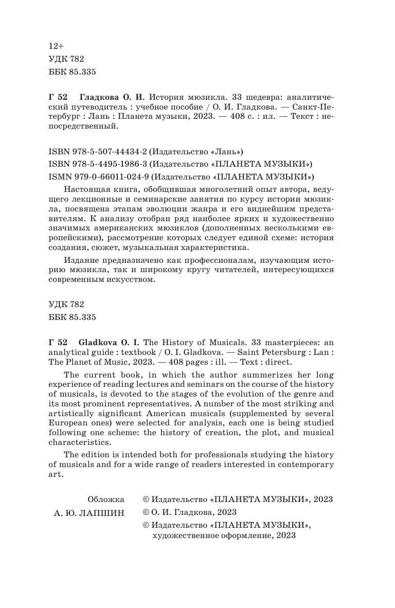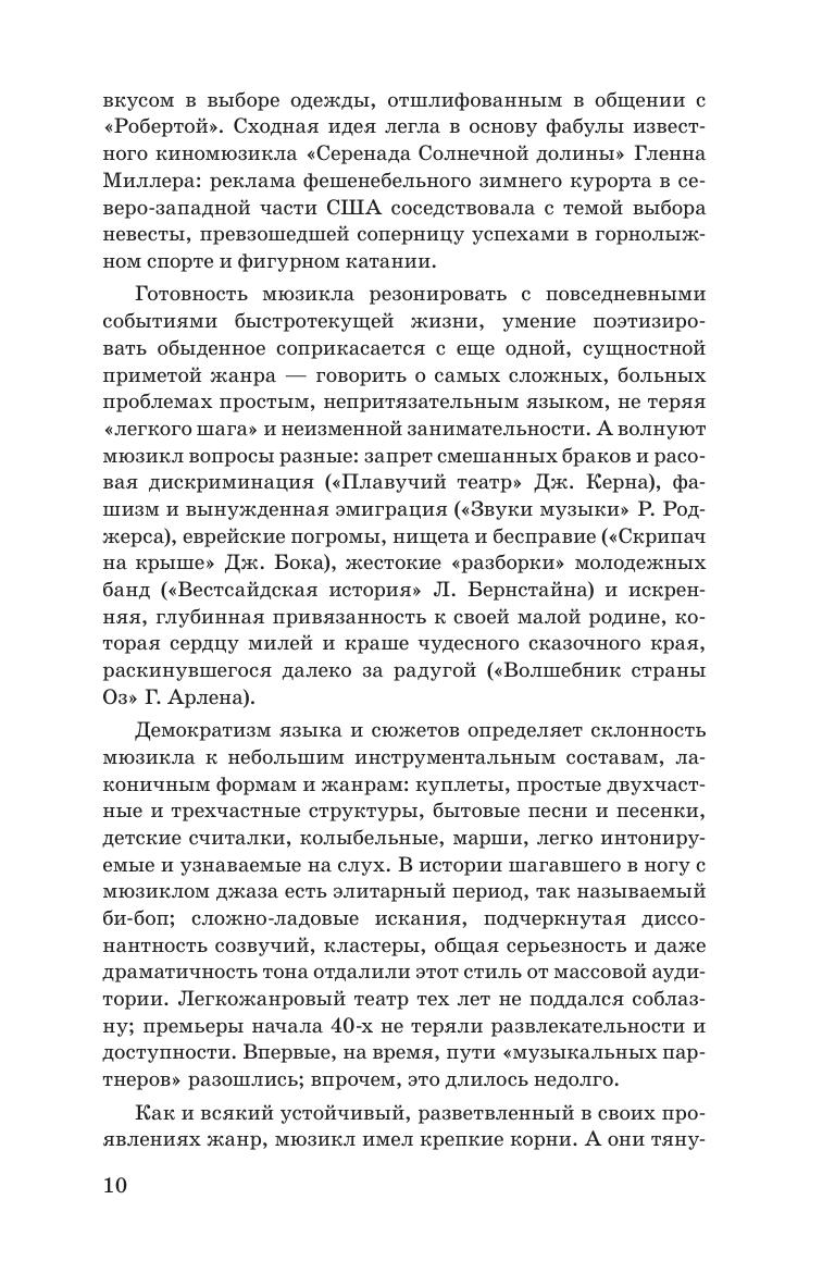 Настоящая книга, обобщившая многолетний опыт автора, ведущего лекционные и семинарские занятия по курсу истории мюзикла, посвящена этапам эволюции жанра и его виднейшим представителям. К анализу отобран ряд наиболее ярких и художественно значимых американских мюзиклов ( дополненных несколькими европейскими), рассмотрение которых следует единой схеме: история создания, сюжет, музыкальная характеристика. Издание предназначено как профессионалам, изучающим историю мюзикла, так и широкому кругу читателей, интересующихся современным искусством.