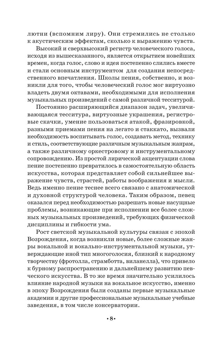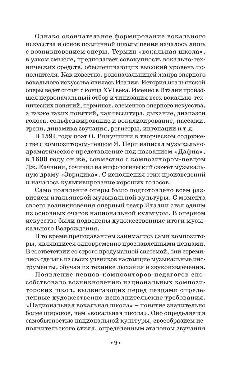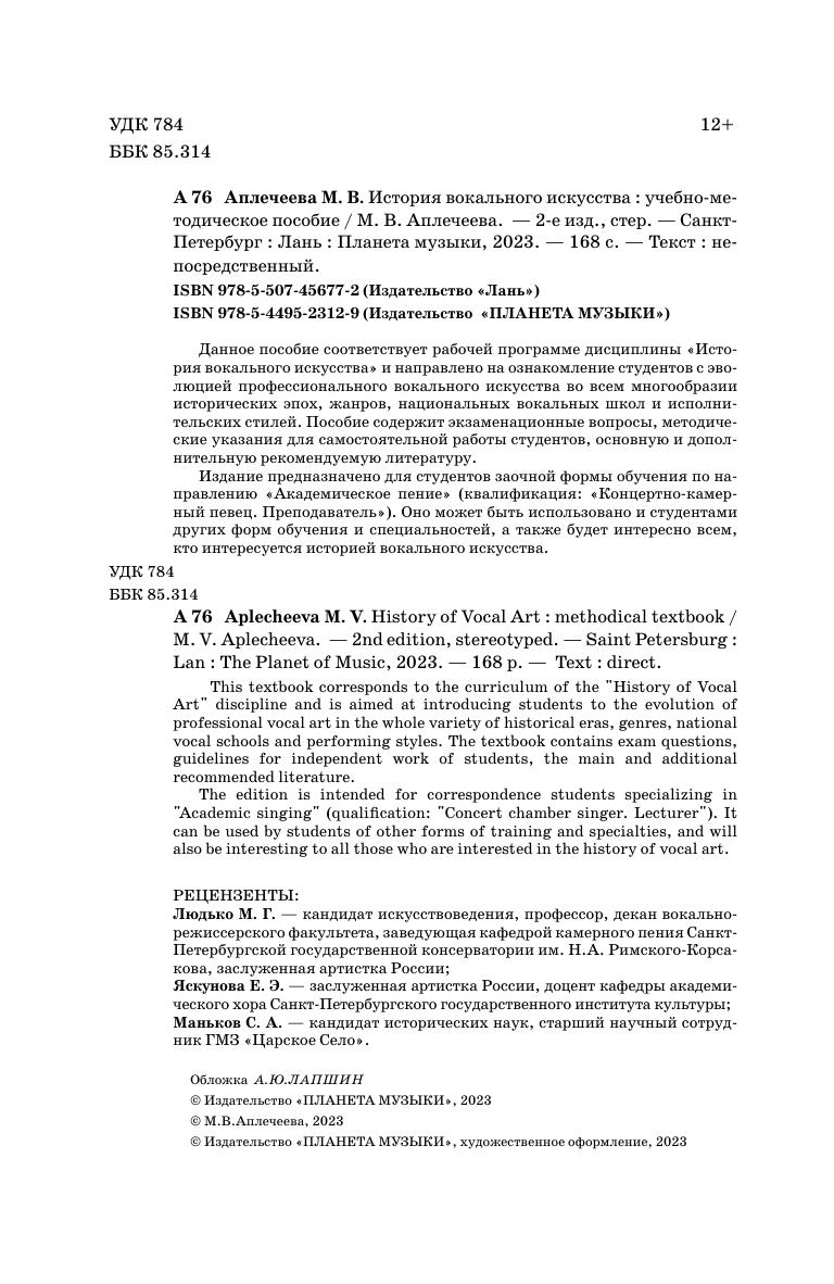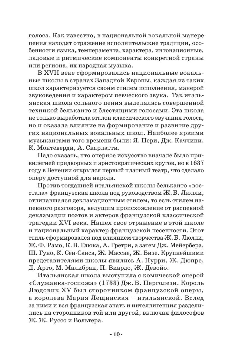 This textbook corresponds to the curriculum of the "History of Vocal Art" discipline and is aimed at introducing students to the evolution of professional vocal art in the whole variety of historical eras, genres, national vocal schools and performing styles. The textbook contains exam questions, guidelines for independent work of students, the main and additional recommended literature.