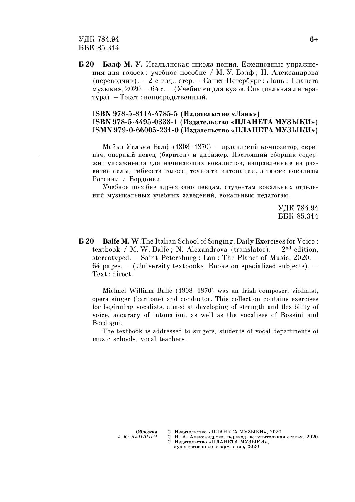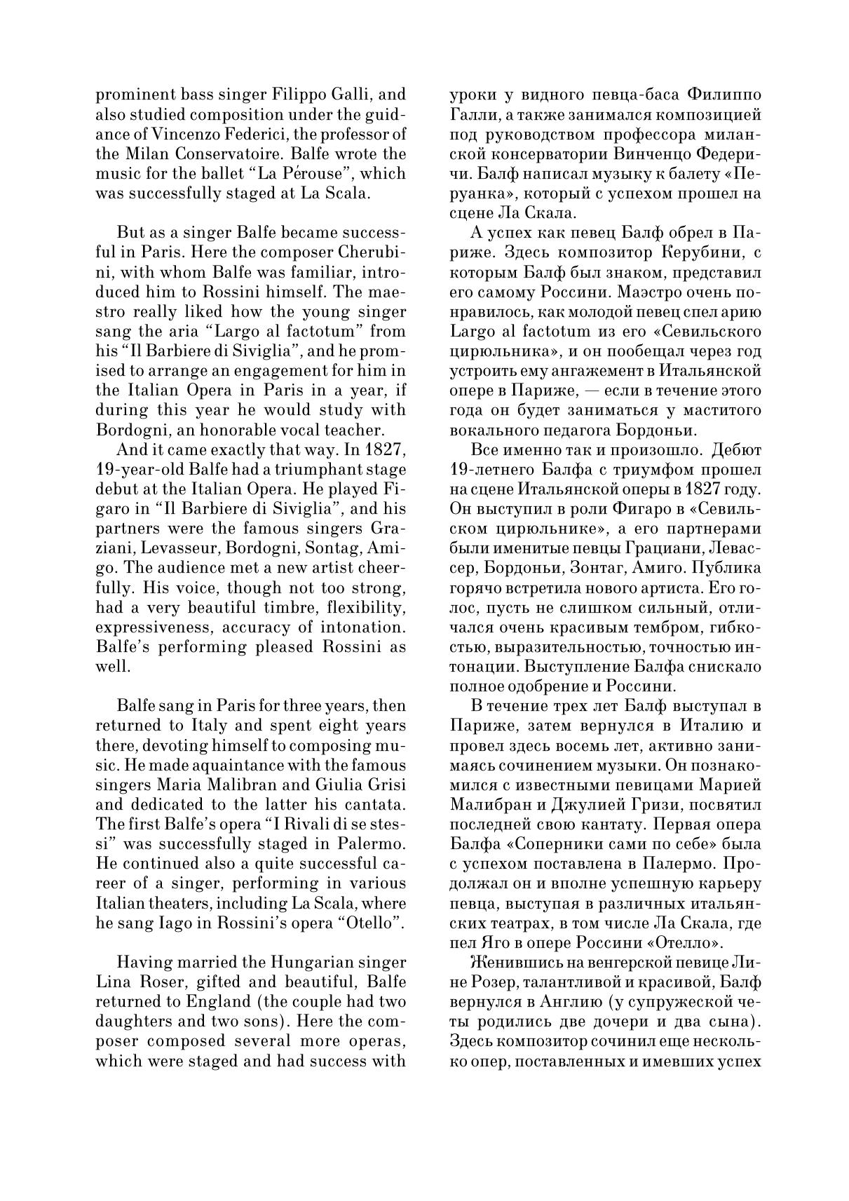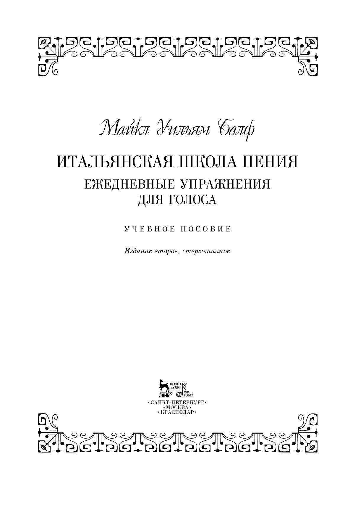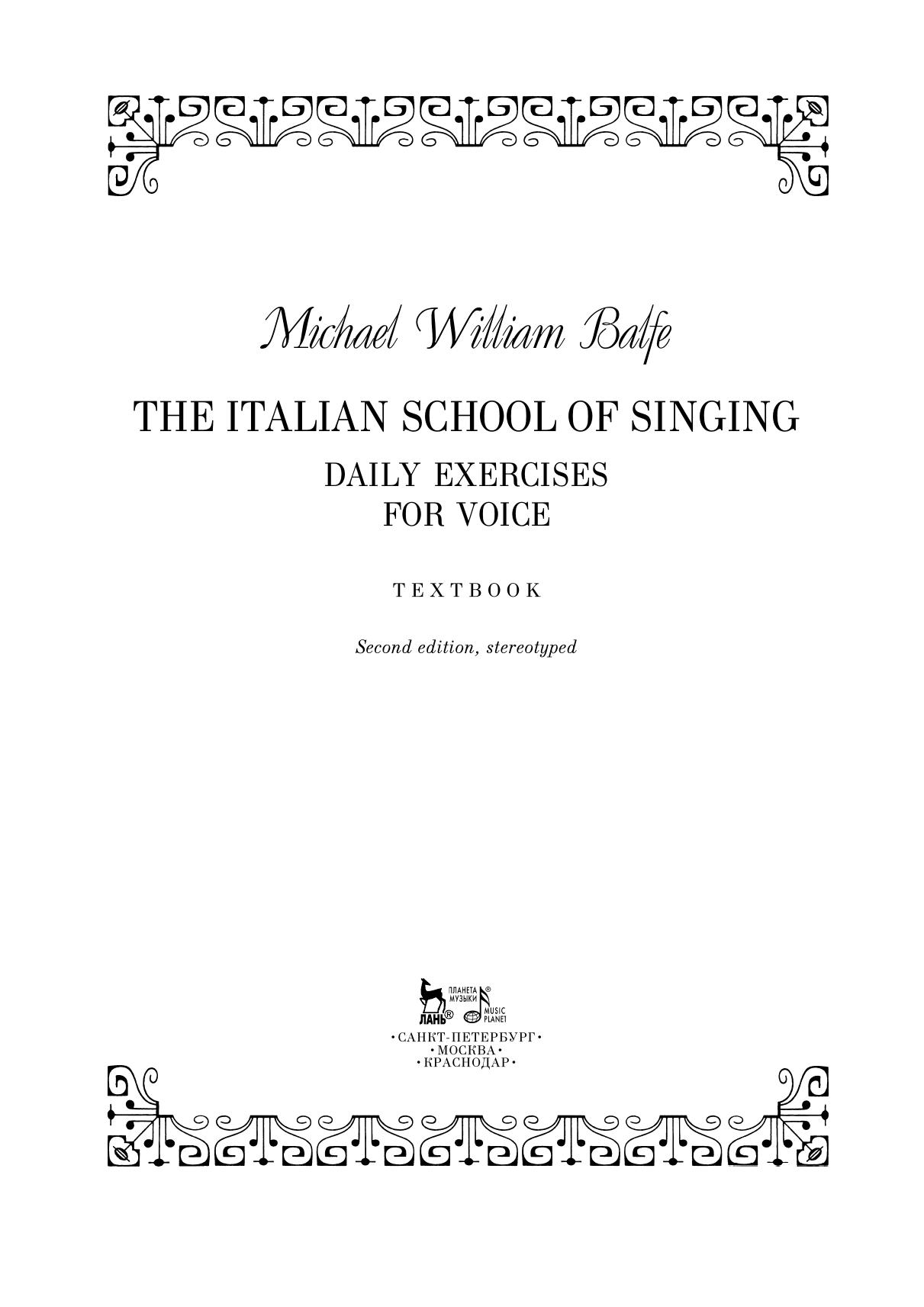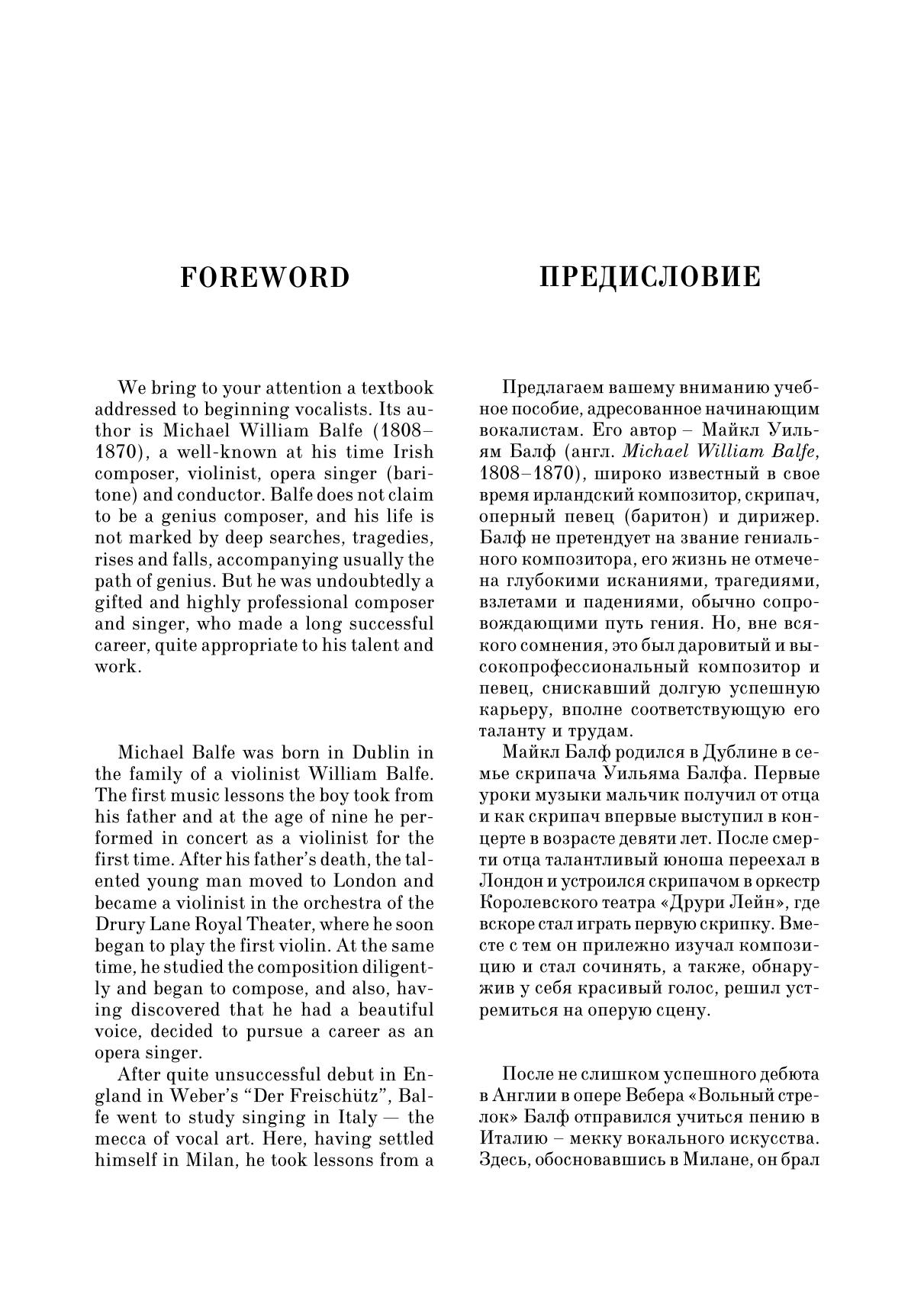 Майкл Уильям Балф (1808–1870) — ирландский композитор, скрипач, оперный певец (баритон) и дирижер. Настоящий сборник содержит упражнения для начинающих вокалистов, направленные на развитие силы, гибкости голоса, точности интонации, а также вокализы Россини и Бордоньи.