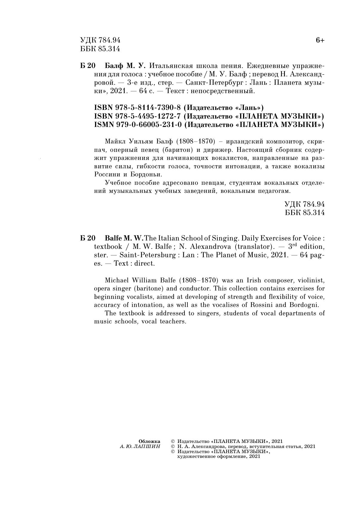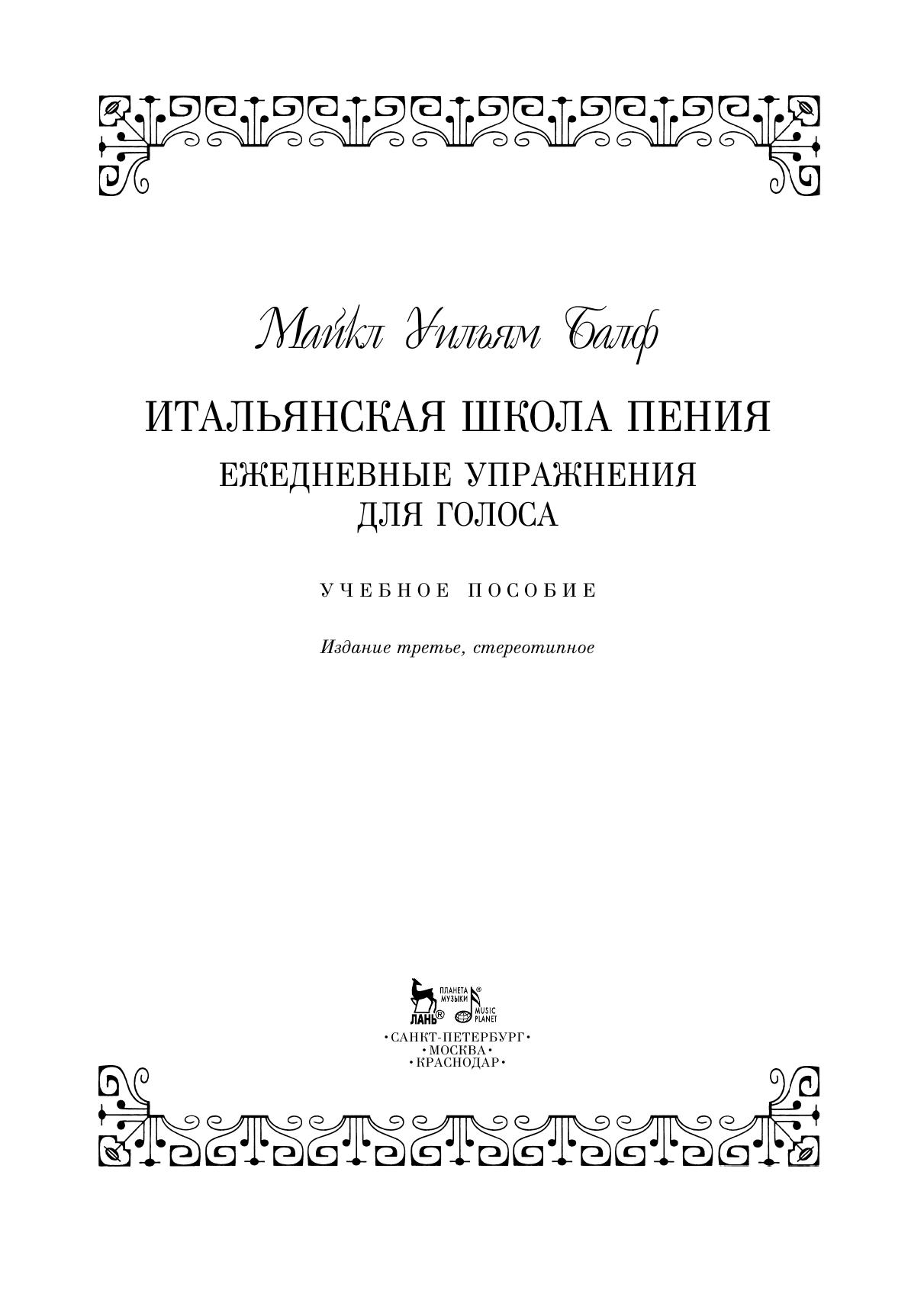Майкл Уильям Балф (1808–1870) – ирландский композитор, скрипач, оперный певец (баритон) и дирижер. Настоящий сборник содержит упражнения для начинающих вокалистов, направленные на развитие силы, гибкости голоса, точности интонации, а также вокализы Россини и Бордоньи. Учебное пособие адресовано певцам, студентам вокальных отделений музыкальных учебных заведений, вокальным педагогам.