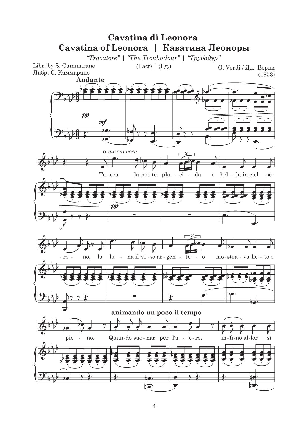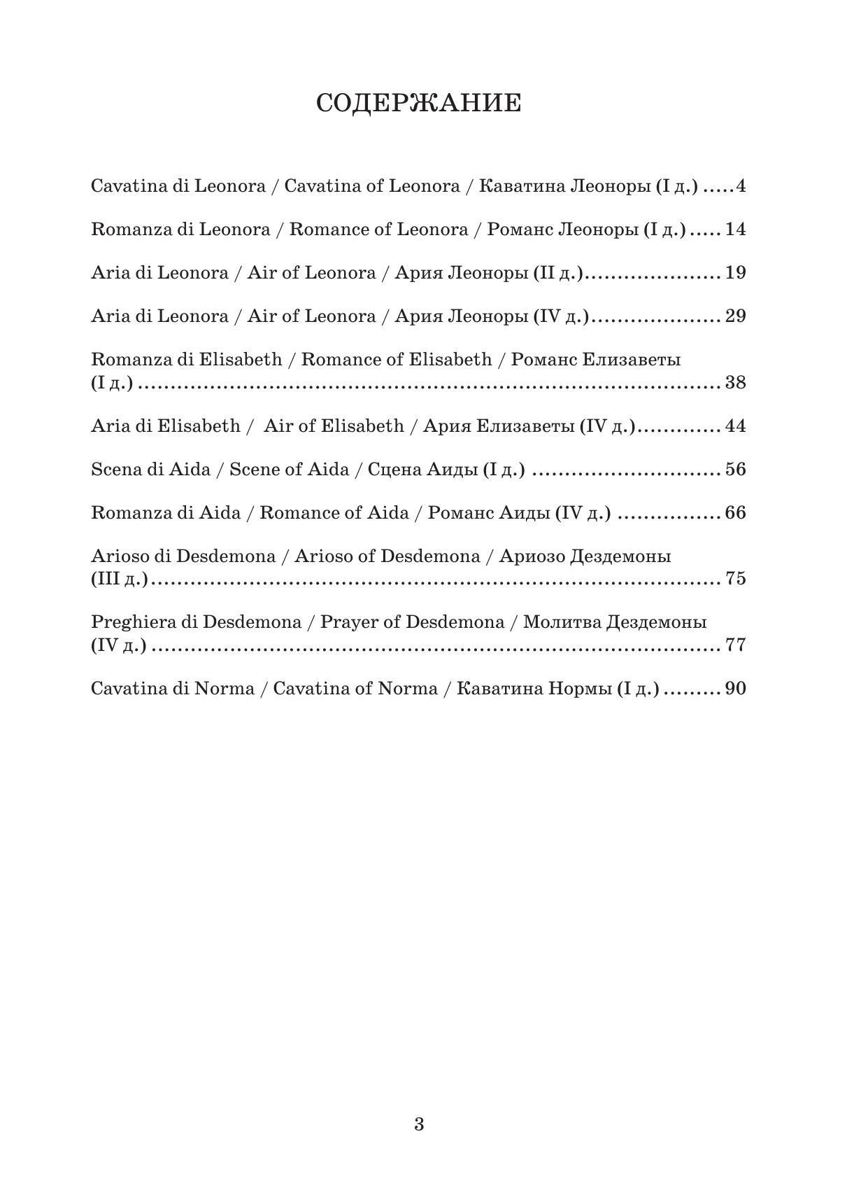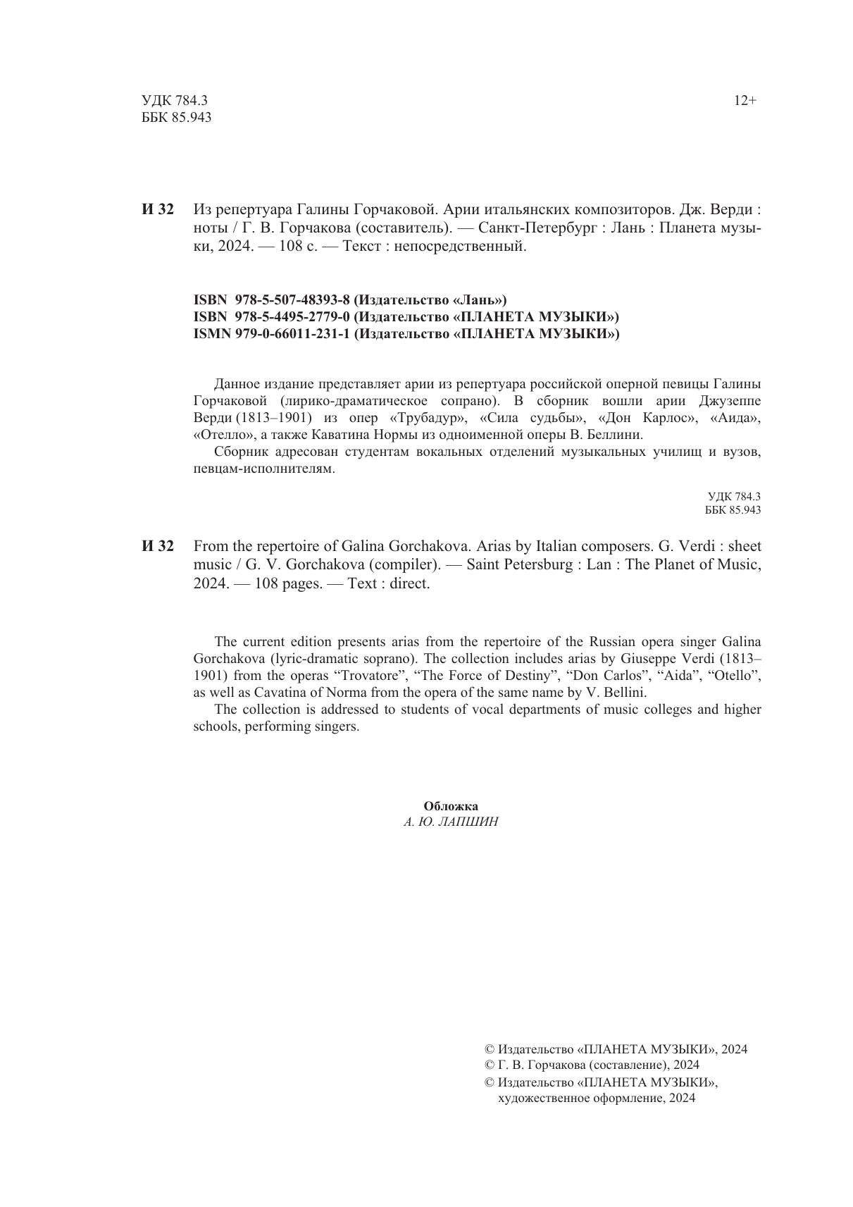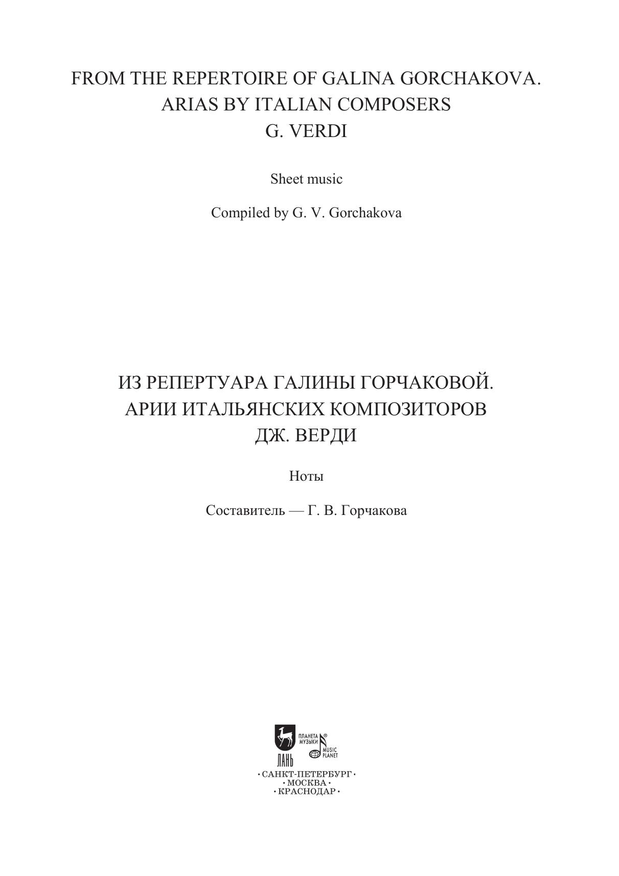 Данное издание представляет арии из репертуара российской оперной певицы Галины Горчаковой (лирико-драматическое сопрано). В сборник вошли арии Джузеппе Верди (1813–1901) из опер «Трубадур», «Сила судьбы», «Дон Карлос», «Аида», «Отелло», а также Каватина Нормы из одноименной оперы В. Беллини. Сборник адресован студентам вокальных отделений музыкальных училищ и вузов, певцам-исполнителям. The current edition presents arias from the repertoire of the Russian opera singer Galina Gorchakova (lyric-dramatic soprano). The collection includes arias by Giuseppe Verdi (1813–1901) from the operas “Trovatore”, “The Force of Destiny”, “Don Carlos”, “Aida”, “Otello”, as well as Cavatina of Norma from the opera of the same name by V. Bellini. The collection is addressed to students of vocal departments of music colleges and higher schools, performing singers.