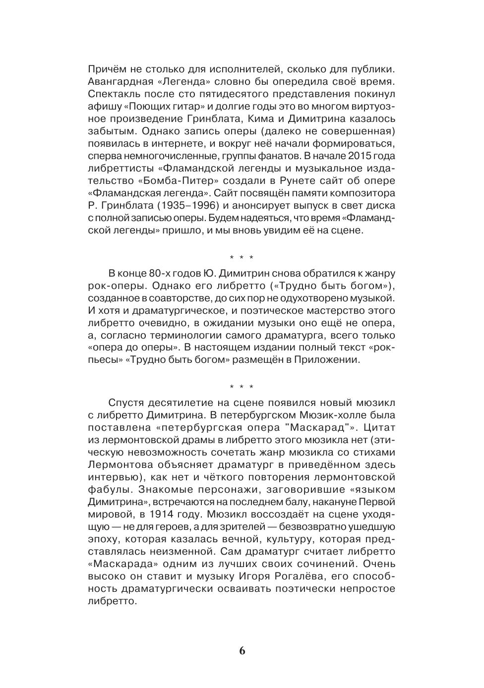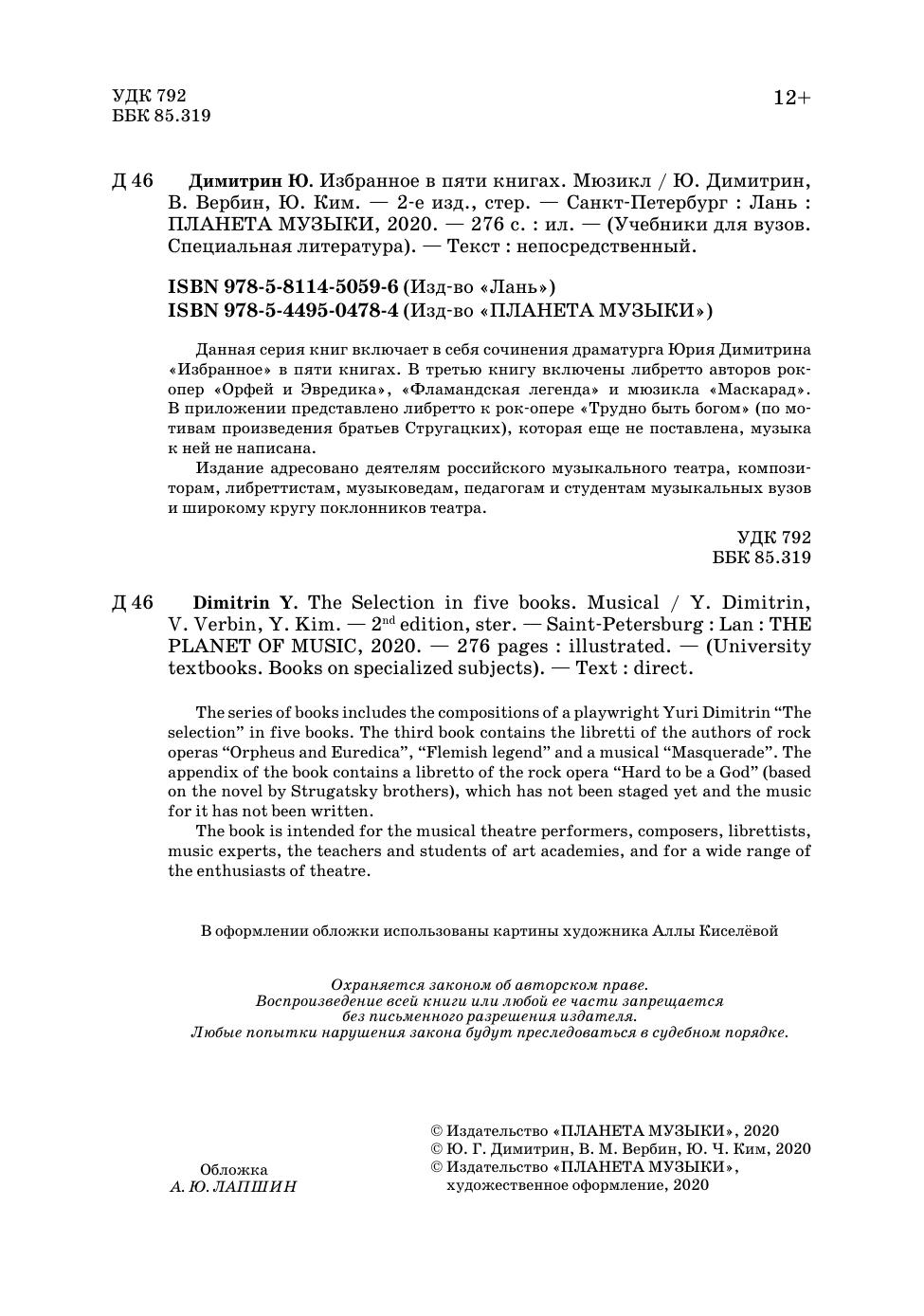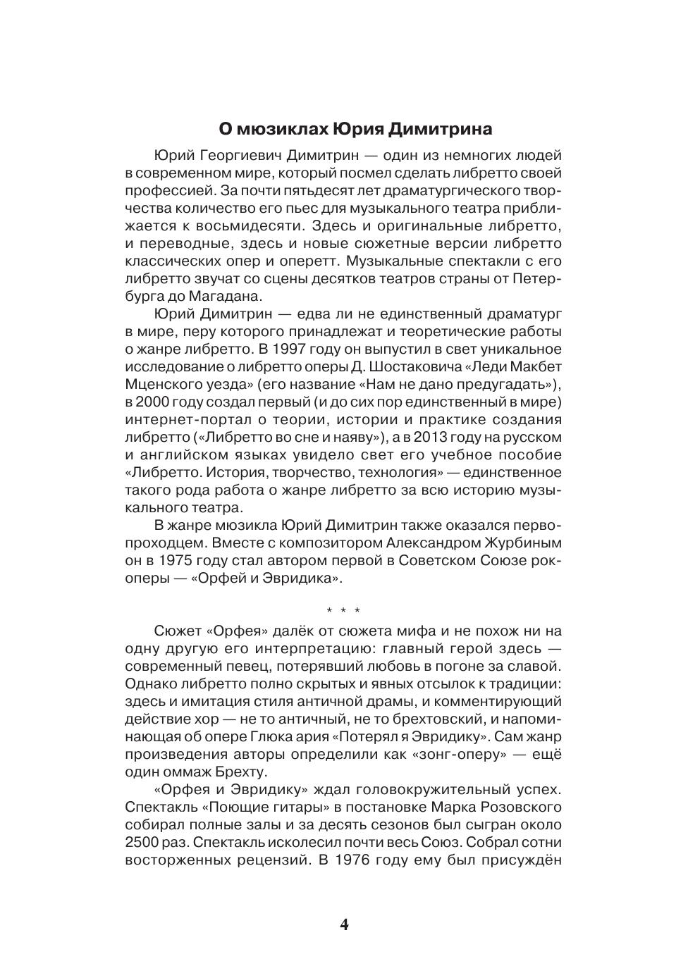 Данная серия книг включает в себя сочинения драматурга Юрия Димитрина "Избранное" в пяти книгах. В третью книгу включены либретто авторов рок-опер "Орфей и Эвредика", "Фламандская легенда" и мюзикла "Маскарад", В приложении представлено либретто к рок-опере "Трудно быть богом" (по мотивам произведения братьев Стругацких), которая еще не поставлена, музыка к ней не написана. Издание адресовано деятелям российского музыкального театра, композиторам, либреттистам, музыковедам, педагогам и студентам музыкальных вузов и широкому кругу поклонников театра.