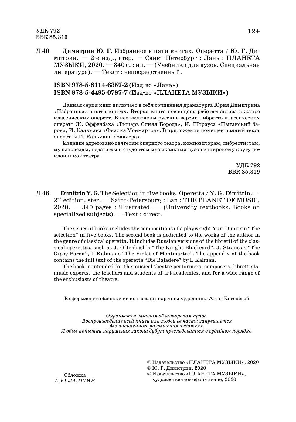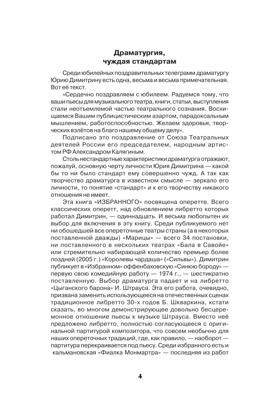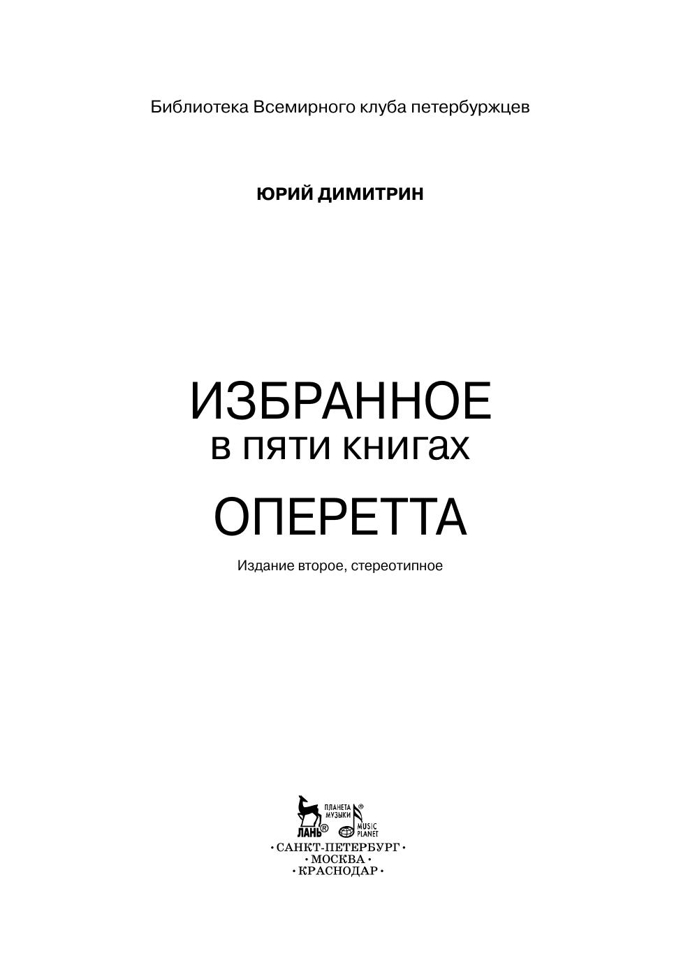Данная серия книг включает в себя сочинения драматурга Юрия Димитрина "Избранное" в пяти книгах. Вторая книга посвящена работам автора в жанре классических оперетт. В нее включены русские версии либретто классических оперетт Ж. Оффенбаха "Рыцарь Синяя Борода", И. Штрауса "Цыганский барон", И. Кальмана "Фиалка Монмартра", В приложении помещен полный текст оперетты И. Кальмана "Баядера".
