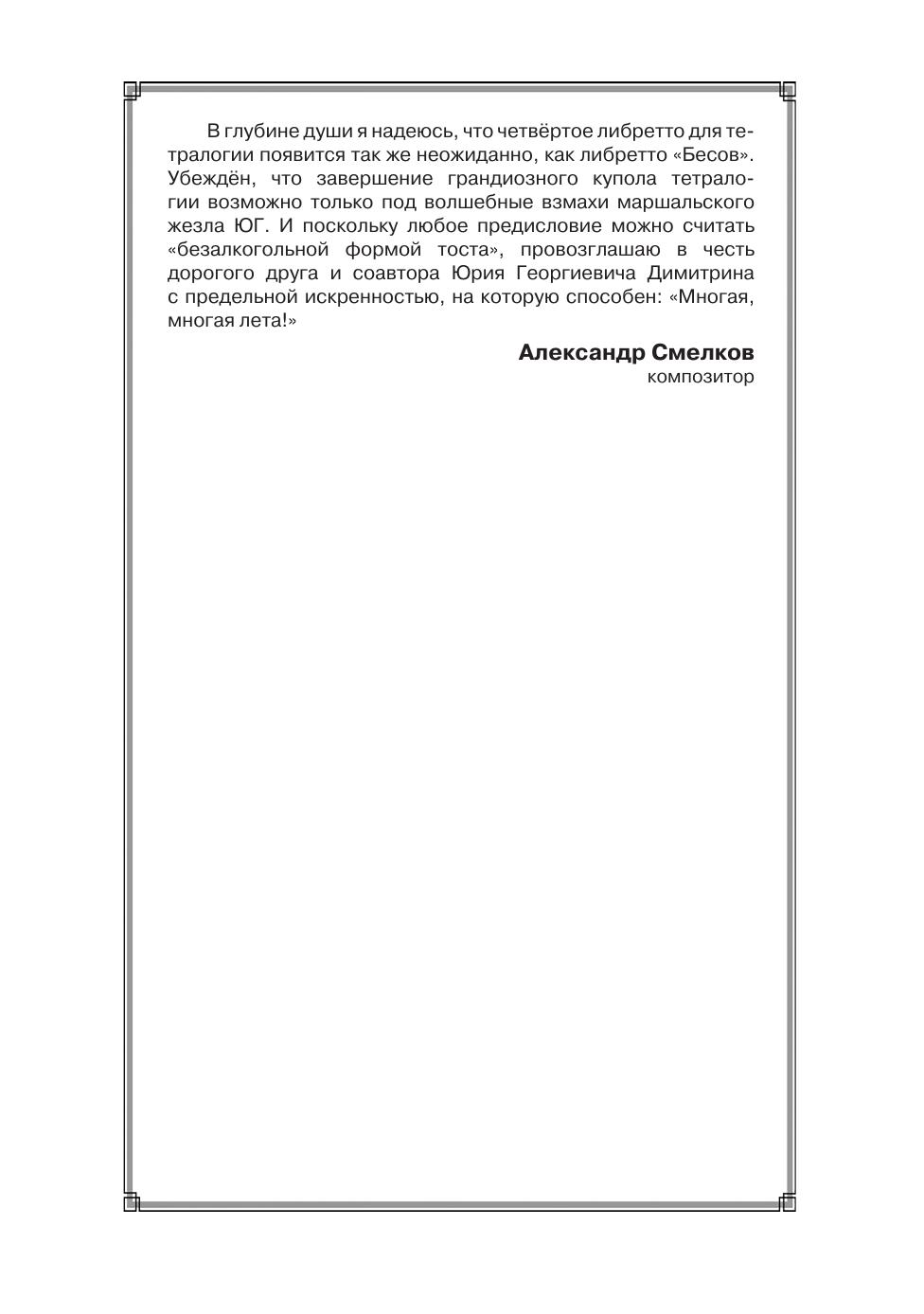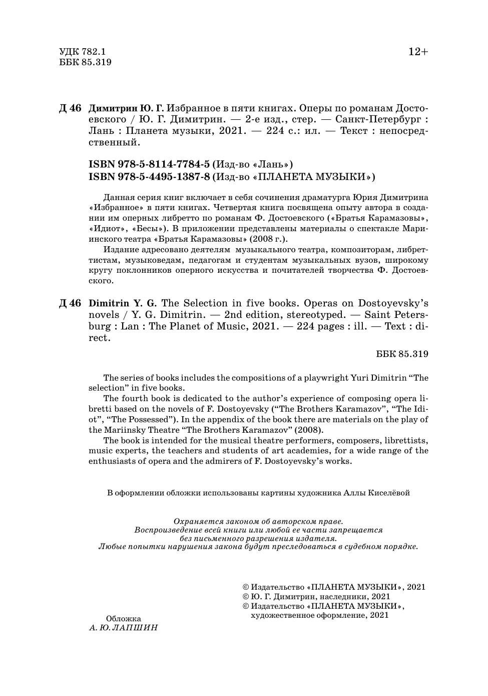 Данная серия книг включает в себя сочинения драматурга Юрия Димитрина "Избранное" в пяти книгах. Четвертая книга посвящена опыту автора в создании им оперных либретто по романам Ф. Достоевского ("Братья Карамазовы", "Идиот", "Бесы"). В приложении представлены материалы о спектакле Мариинского театра "Братьев Карамазовы" (2008 г),