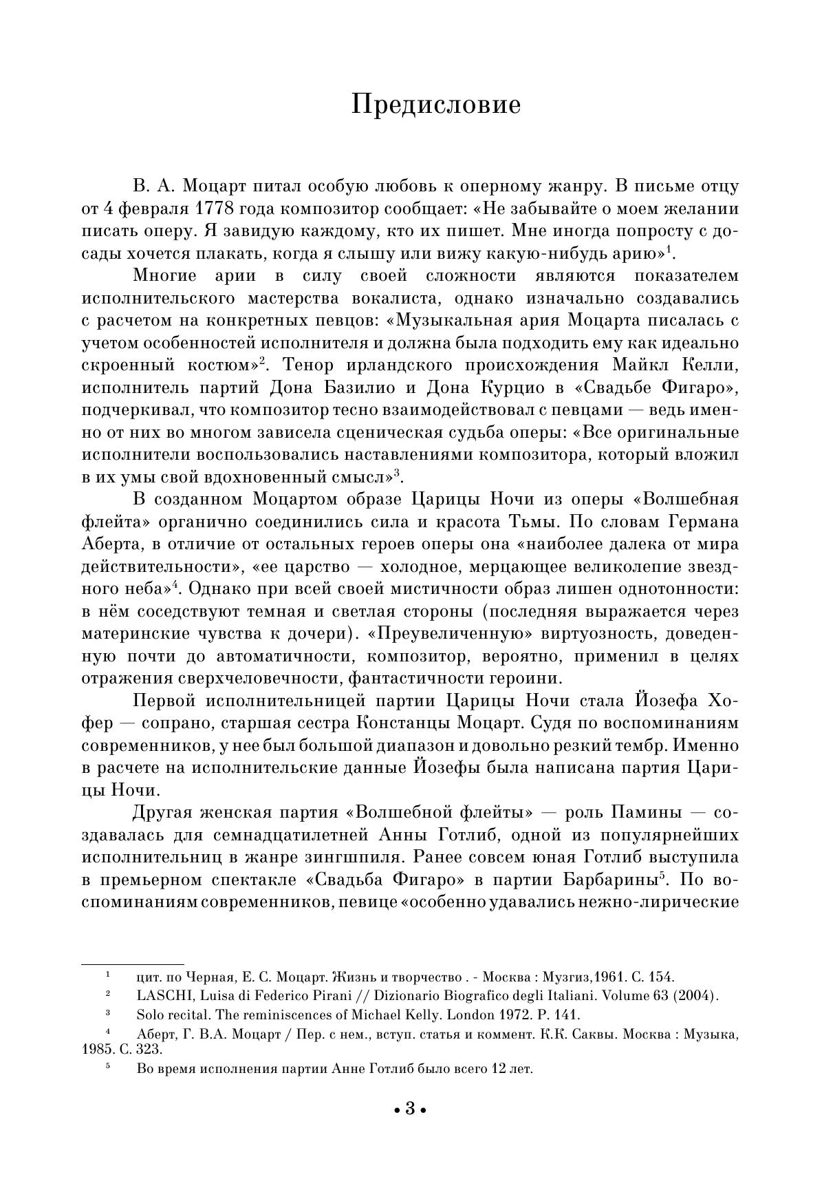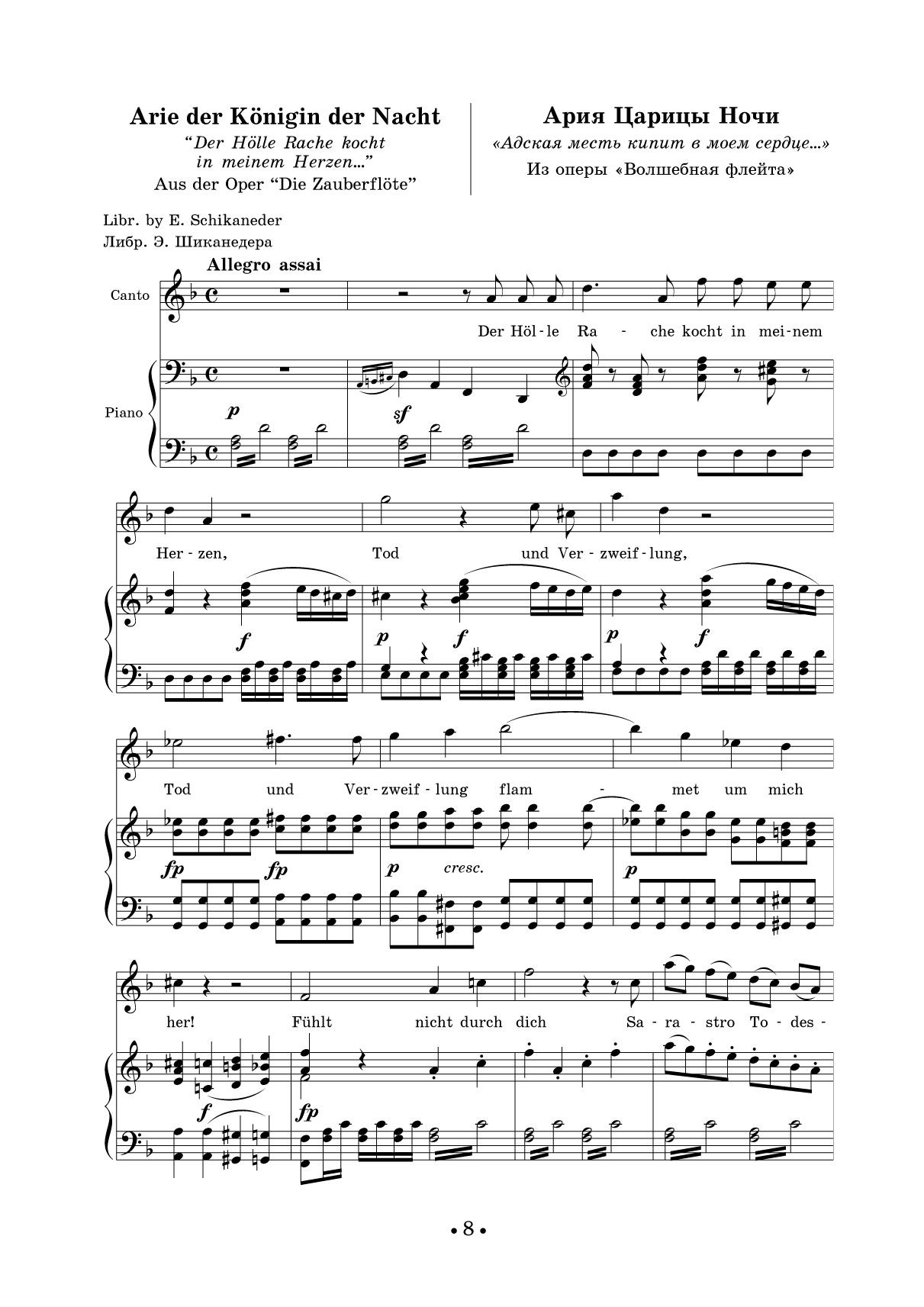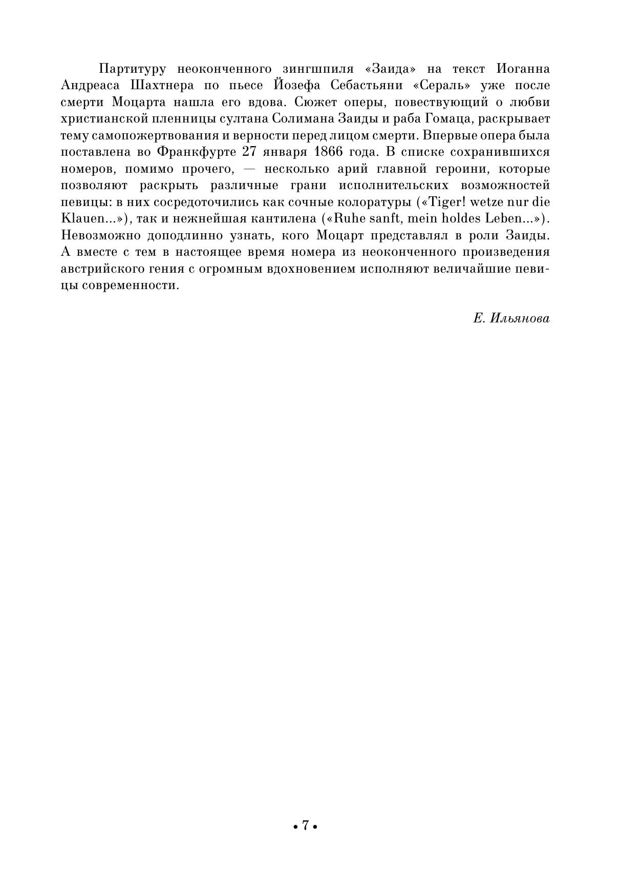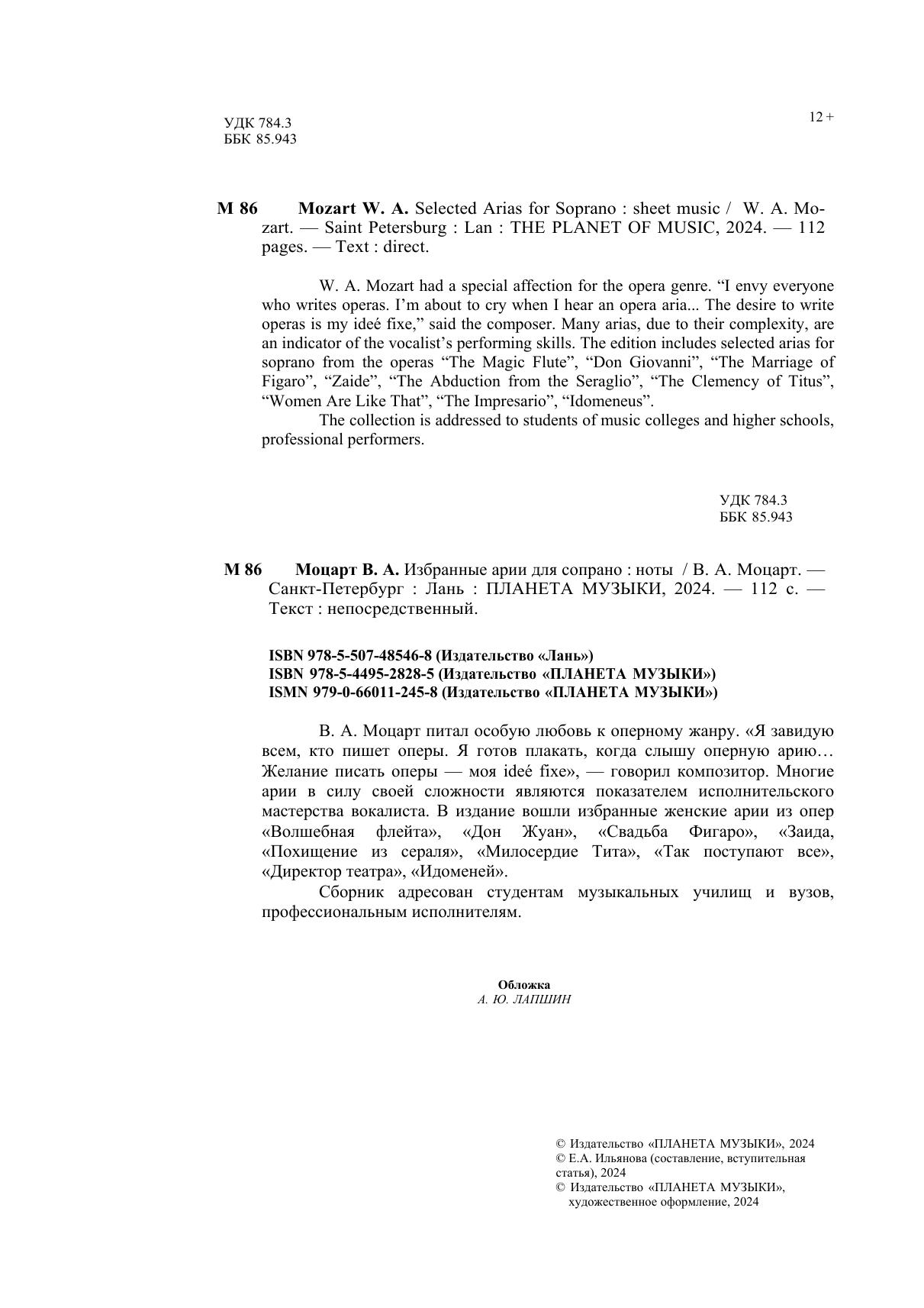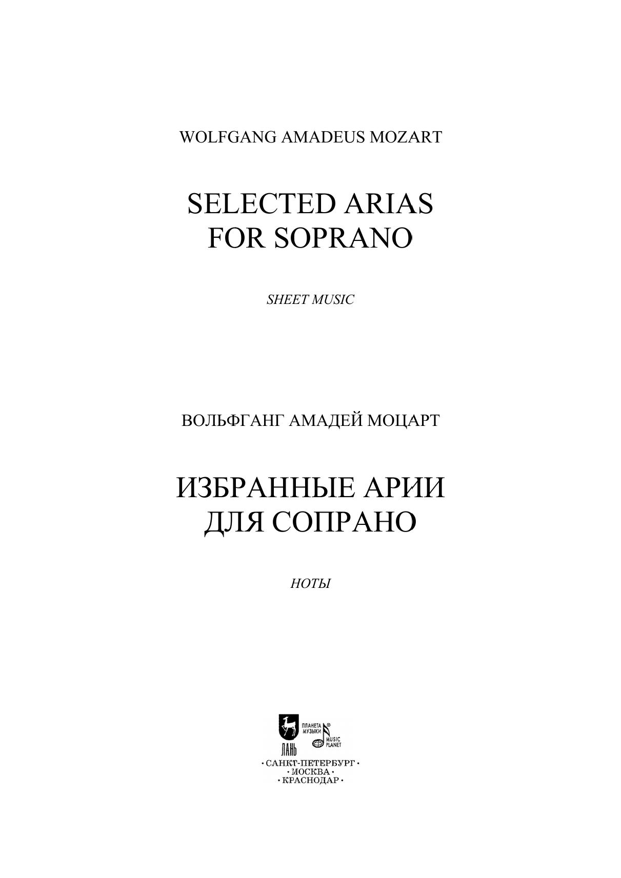 В. А. Моцарт питал особую любовь к оперному жанру. «Я завидую всем, кто пишет оперы. Я готов плакать, когда слышу оперную арию… Желание писать оперы – моя idеé fixe», – говорил композитор. Многие арии в силу своей сложности являются показателем исполнительского мастерства вокалиста. В издание вошли избранные женские арии из опер «Волшебная флейта», «Дон Жуан», «Свадьба Фигаро», «Заида, «Похищение из сераля», «Милосердие Тита», «Так поступают все», «Директор театра», «Идоменей». Сборник адресован студентам музыкальных училищ и вузов, профессиональным исполнителям. W. A. Mozart had a special affection for the opera genre. “I envy everyone who writes operas. I’m about to cry when I hear an opera aria... The desire to write operas is my ideé fixe,” said the composer. Many arias, due to their complexity, are an indicator of the vocalist’s performing skills. The edition includes selected arias for soprano from the operas “The Magic Flute”, “Don Giovanni”, “The Marriage of Figaro”, “Zaide”, “The Abduction from the Seraglio”, “The Clemency of Titus”, “Women Are Like That”, “The Impresario”, “Idomeneus”. The collection is addressed to students of music colleges and higher schools, professional performers.