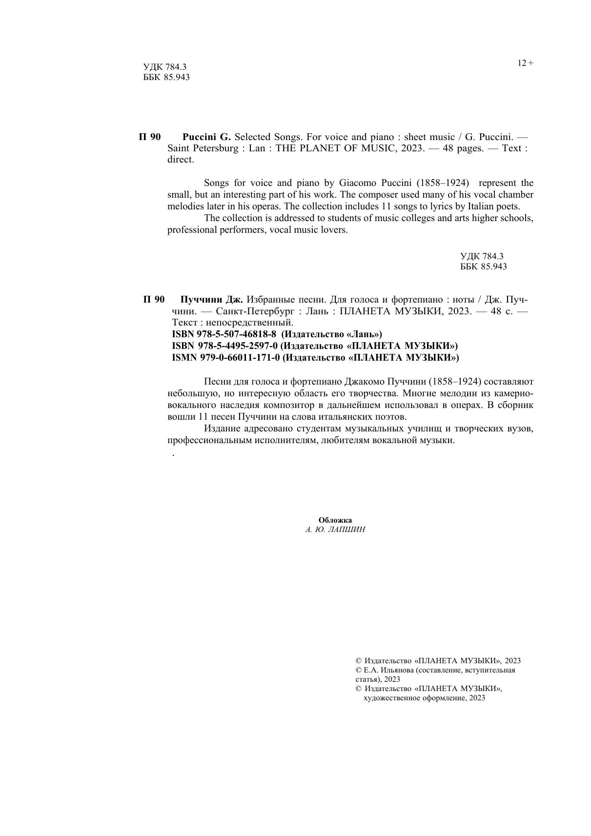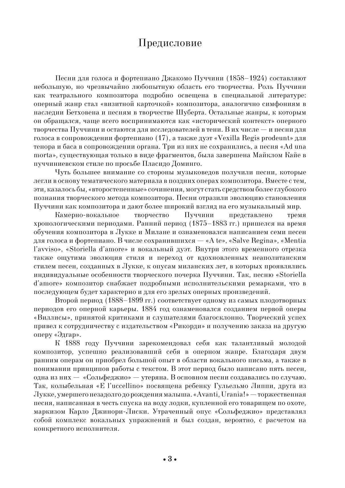 Песни для голоса и фортепиано Джакомо Пуччини (1858-1924) составляют небольшую, но интересную область его творчества. Многие мелодии из камерно-вокального наследия композитор в дальнейшем использовал в операх. В сборник вошли 11 песен Пуччини на слова итальянских поэтов. Издание адресовано студентам творческих училищ и вузов, профессиональным исполнителям, любителям вокальной музыки. Songs for voice and piano by Giacomo Puccini (1858–1924) represent the small, but an interesting part of his work. The composer used many of his vocal chamber melodies later in his operas. The collection includes 11 songs to lyrics by Italian poets. The collection is addressed to students of music colleges and arts higher schools, professional performers, vocal music lovers.