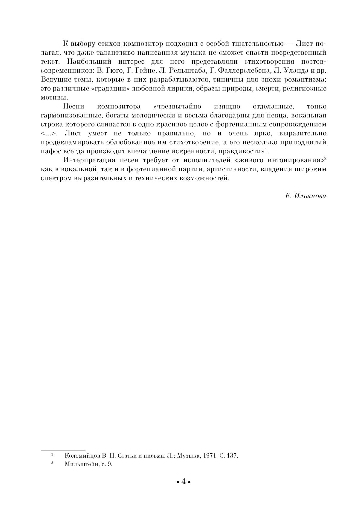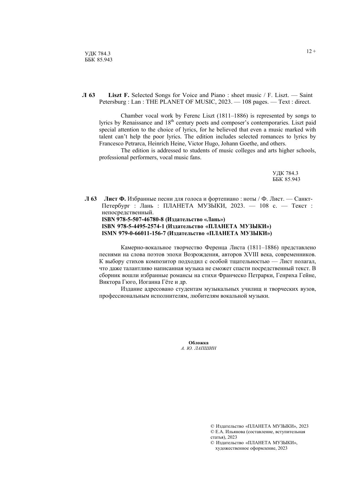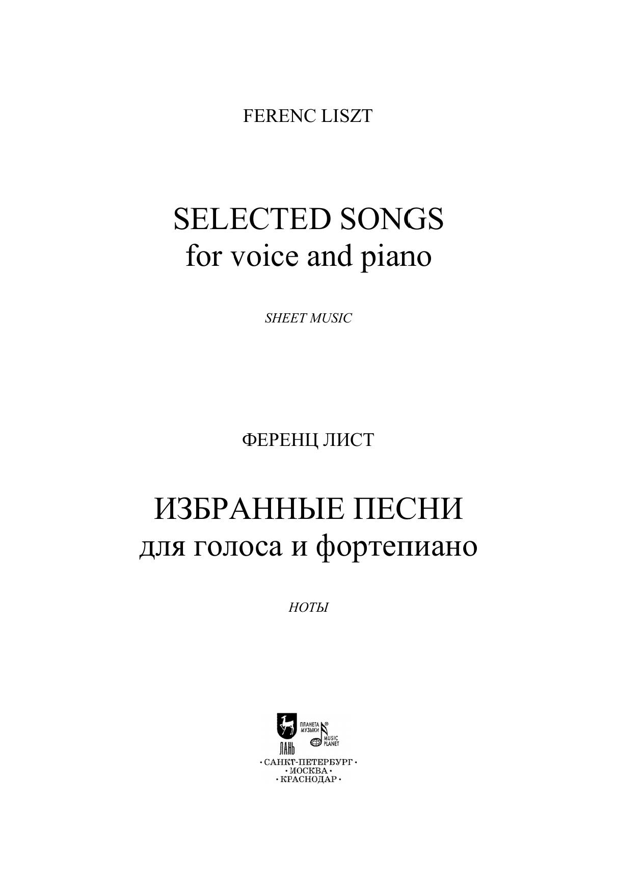 Камерно-вокальное творчество Ференца Листа (1811–1886) представлено песнями на слова поэтов эпохи Возрождения, авторов XVIII века, современников. К выбору стихов композитор подходил с особой тщательностью — Лист полагал, что даже талантливо написанная музыка не сможет спасти посредственный текст. В сборник вошли избранные романсы на стихи Франческо Петрарки, Генриха Гейне, Виктора Гюго, Иоганна Гёте и др. Издание адресовано студентам музыкальных училищ и творческих вузов, профессиональным исполнителям, любителям вокальной музыки. Сhamber vocal work by Ferenc Liszt (1811–1886) is represented by songs to lyrics by Renaissanсe and 18th century poets and composer’s contemporaries. Liszt paid special attention to the choice of lyrics, for he believed that even a music marked with talent can’t help the poor lyrics. The edition includes selected romances to lyrics by Francesco Petrarca, Heinrich Heine, Victor Hugo, Johann Goethe, and others. The edition is addressed to students of music colleges and arts higher schools, professional performers, vocal music fans.
