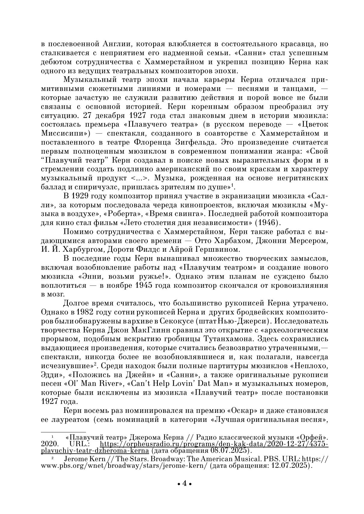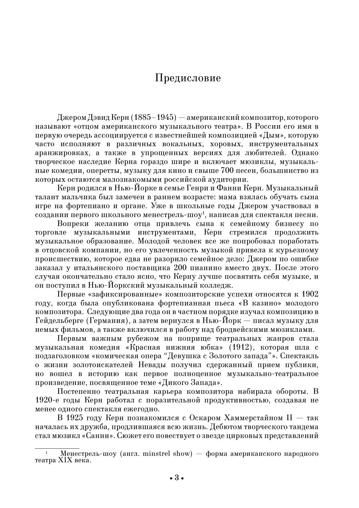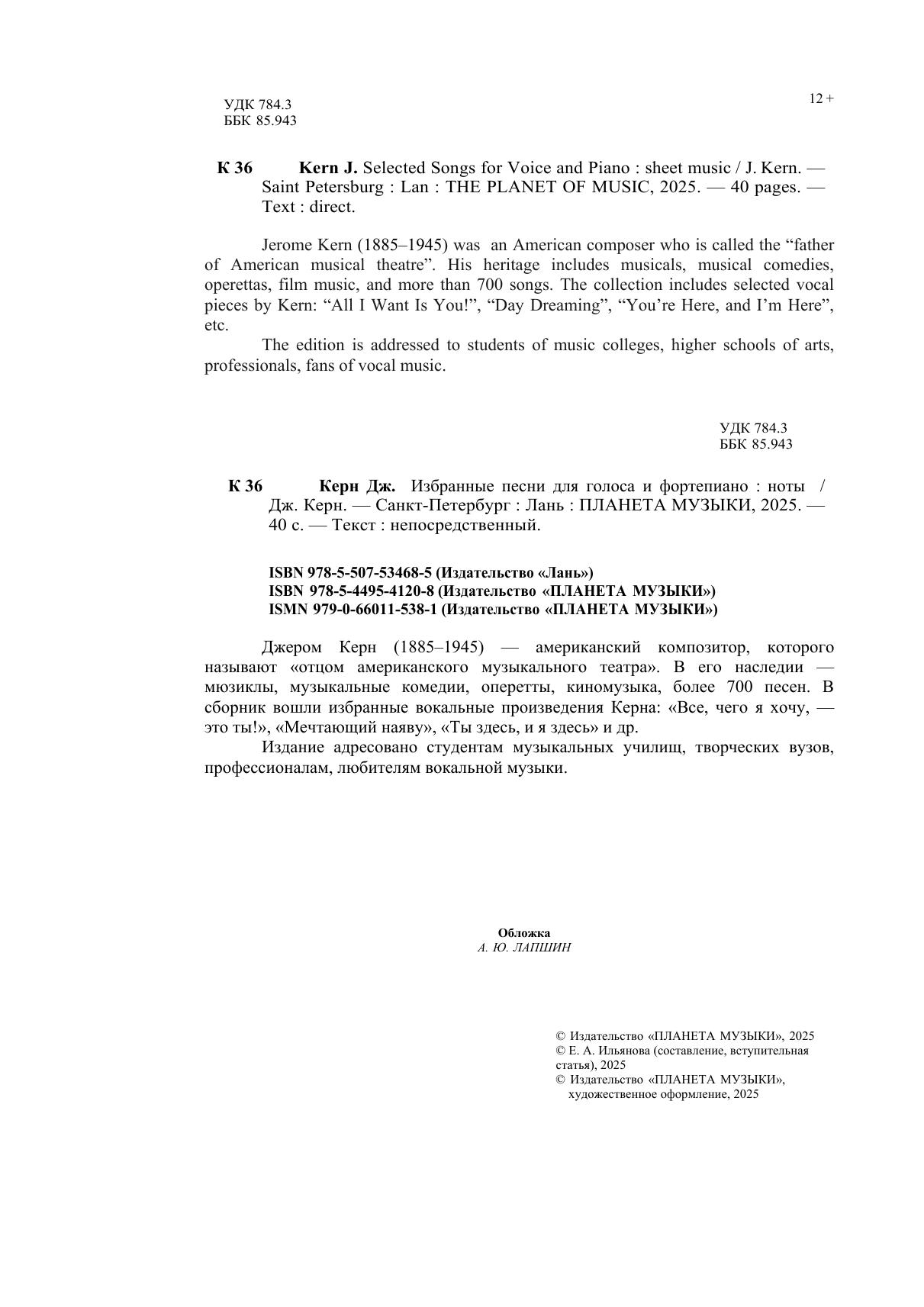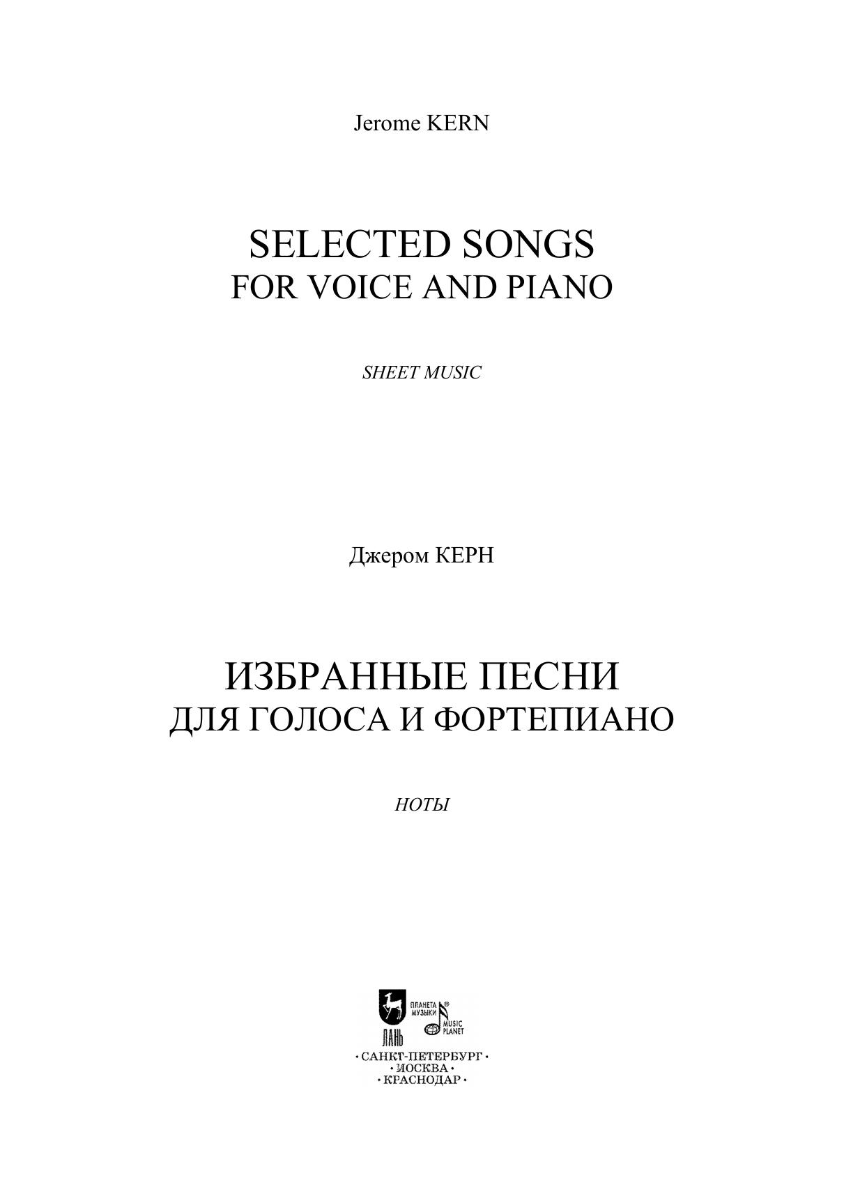 Джером Керн (1885–1945) — американский композитор, которого называют «отцом американского музыкального театра». В его наследии — мюзиклы, музыкальные комедии, оперетты, киномузыка, более 700 песен. В сборник вошли избранные вокальные произведения Керна: «Всё, чего я хочу, — это ты!», «Мечтающий наяву» и «Ты здесь, и я здесь», и др. Издание адресовано студентам музыкальных училищ, творческих вузов, профессионалам, любителям вокальной музыки. Jerome Kern (1885–1945) was an American composer who is called the “father of American musical theatre”. His heritage includes musicals, musical comedies, operettas, film music, and more than 700 songs. The collection includes selected vocal pieces by Kern: “All I Want Is You!”, “Day Dreaming”, “You’re Here, and I’m Here”, etc. The edition is addressed to students of music colleges, higher schools of arts, professionals, fans of vocal music.